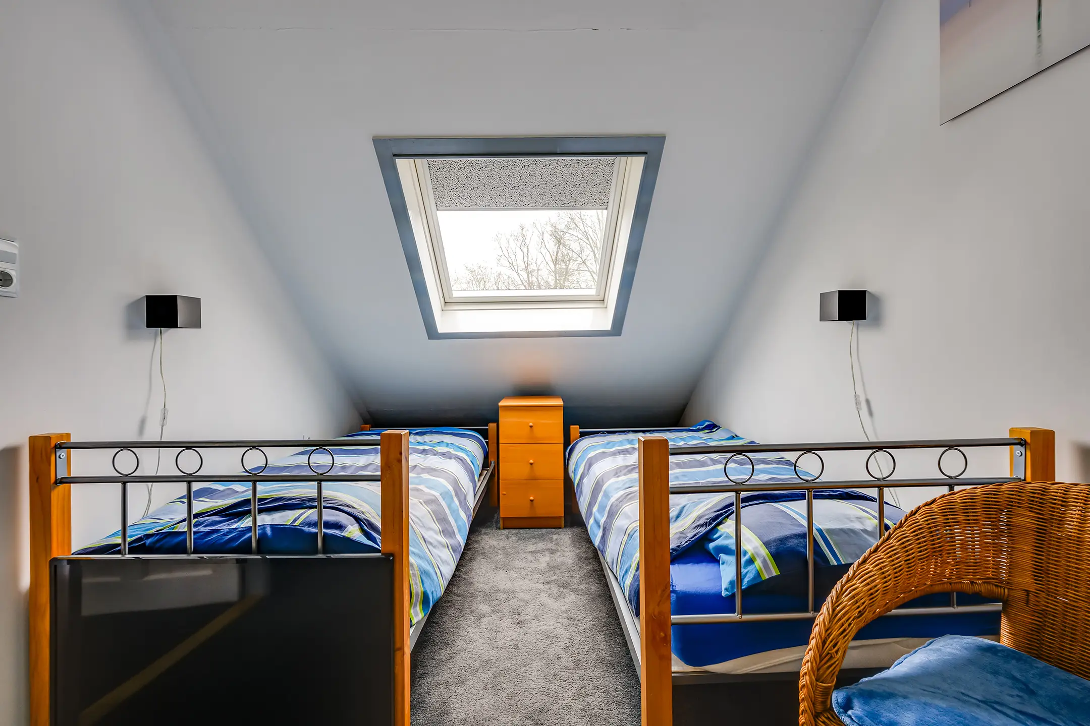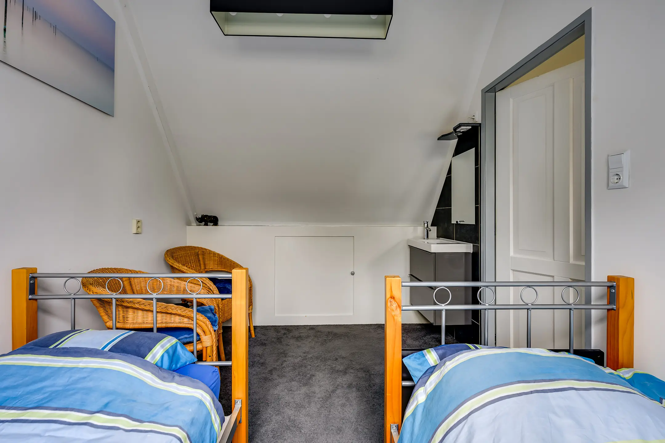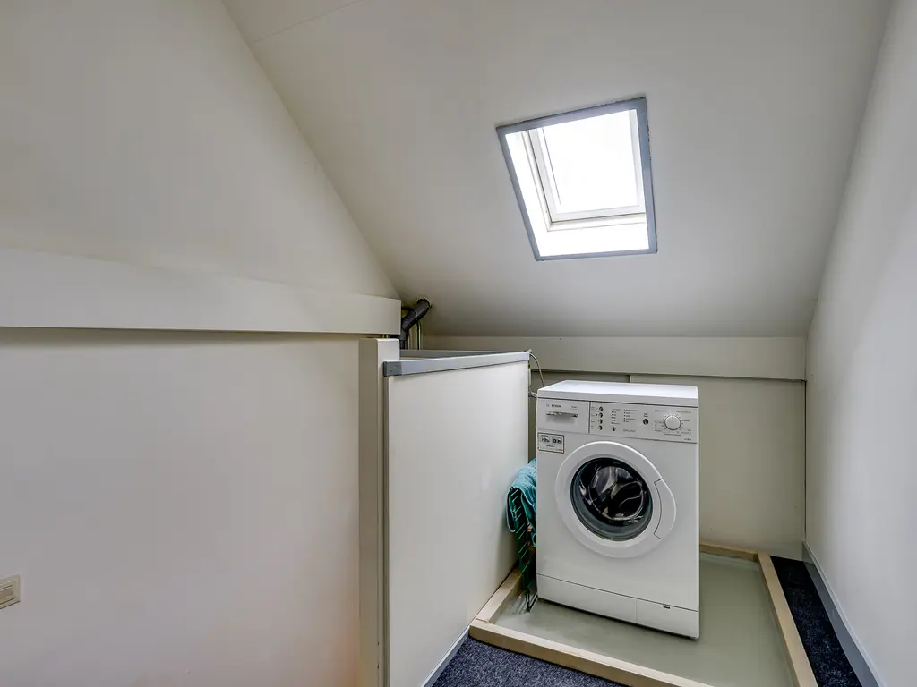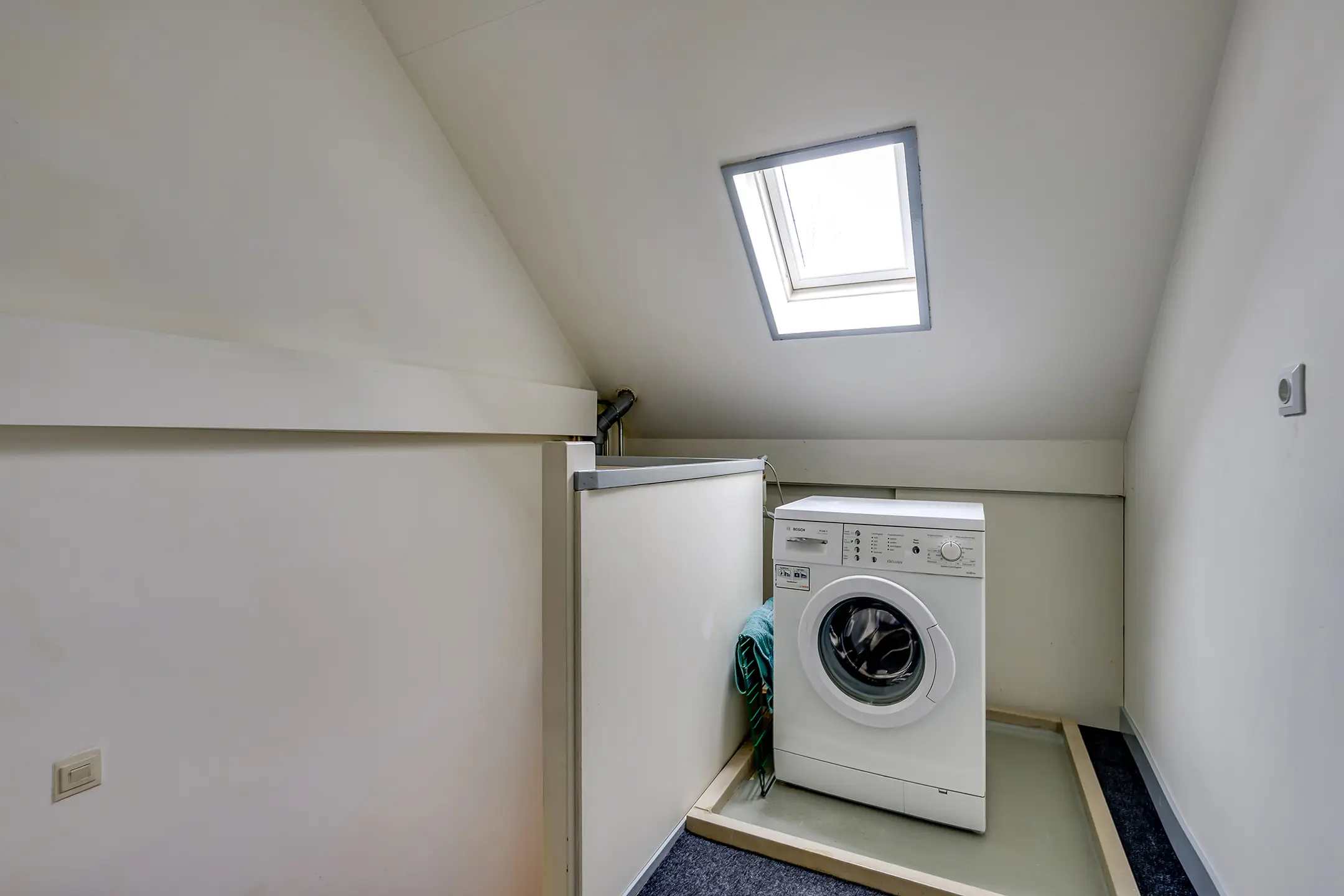 De tweede verdieping biedt nog eens extra ruimte. Op de voorzolder bevinden zich de wasmachine-opstelling, de CV-ketel en de installatie van de heteluchtverwarming. Daarnaast is hier een vierde slaapkamer gerealiseerd, voorzien van een dakraam en een eigen wastafelmeubel. Deze verdieping is uitermate geschikt als logeerkamer, tienerkamer of rustige thuiswerkplek. Ook hier is extra bergruimte aanwezig achter de knieschotten.