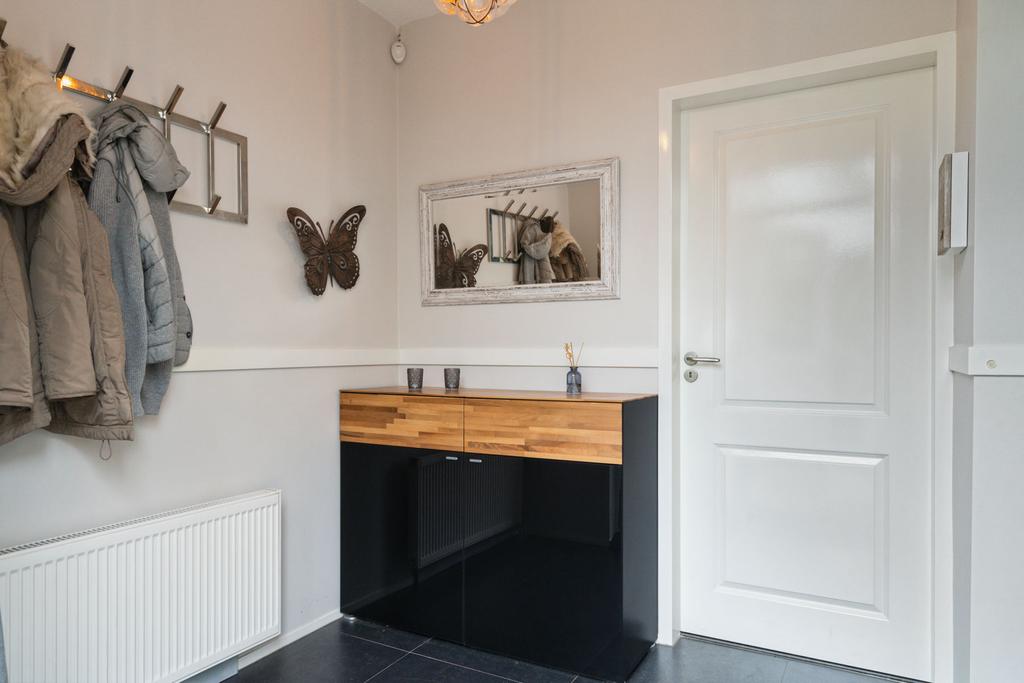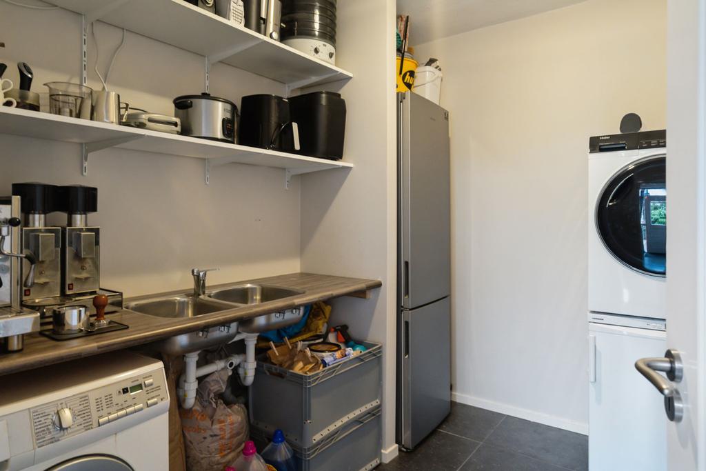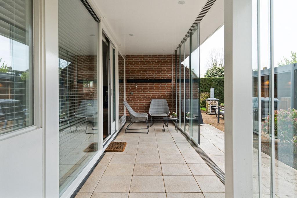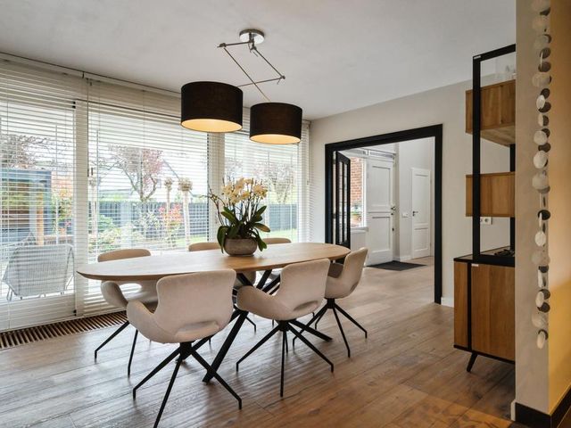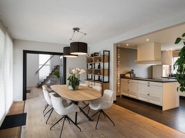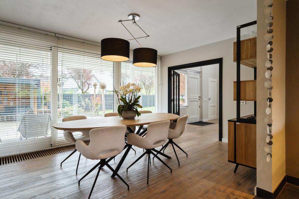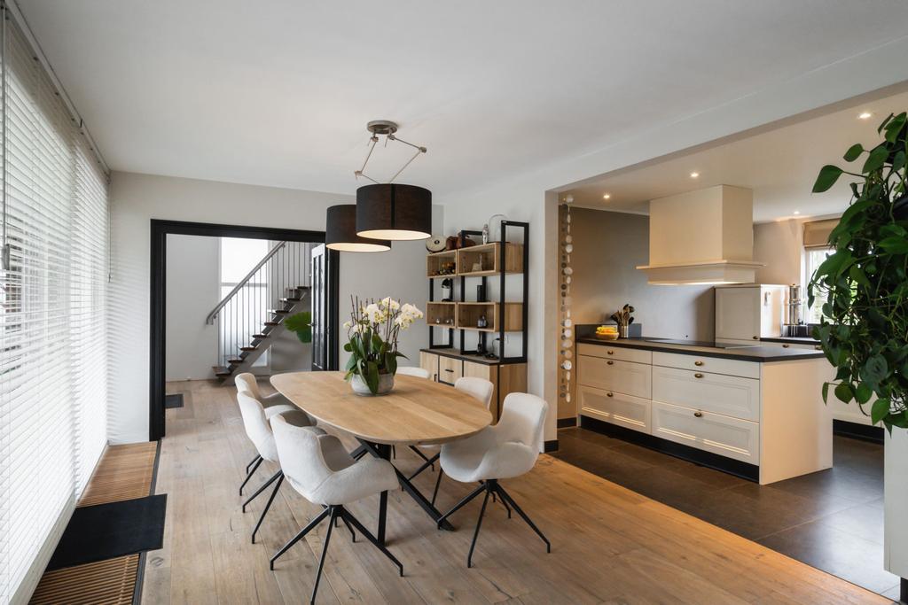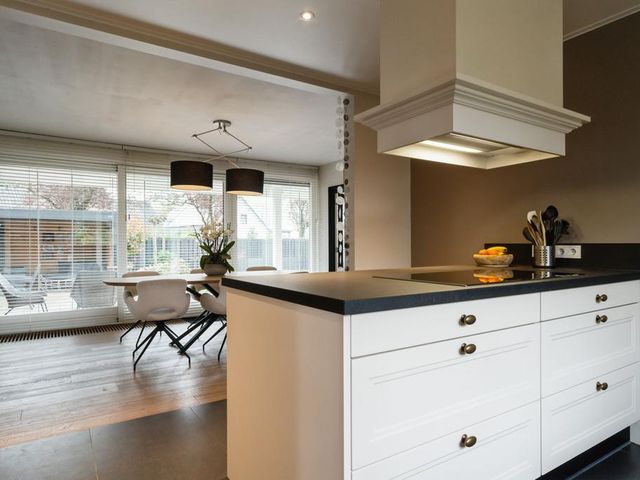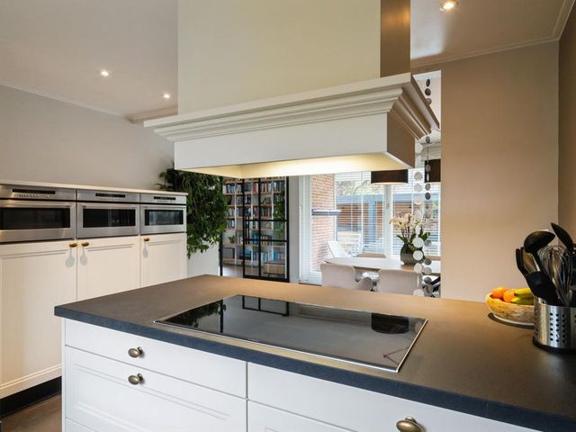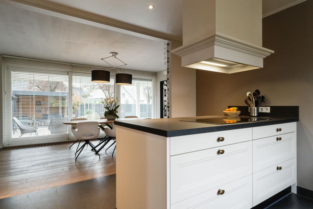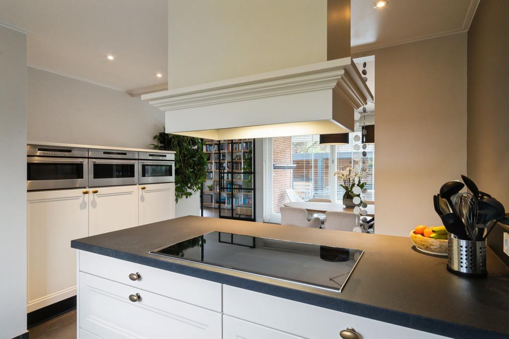 Omdat de oorspronkelijke voordeur niet meer wordt gebruikt, betreedt u de woning via de voormalige achterdeur die direct aansluit aan de ruime oprit. Daar komt u binnen in de hal met meterkast die naast toegang tot de grote keuken, ook toegang geeft tot de praktische bijkeuken; hier treft u een aanrechtblad met dubbele spoelbak, veel opbergruimte en de aansluitingen voor het witgoed. De grote woonkeuken is qua apparatuur voorzien van koelkast, inductiekookplaat, afzuigkap, spoelbak, magnetron, stoomoven, oven en sluit direct aan op de ruime eetkamer. De schuifpui in de eetkamer leidt naar de inpandige serre en geeft toegang tot de tuin.