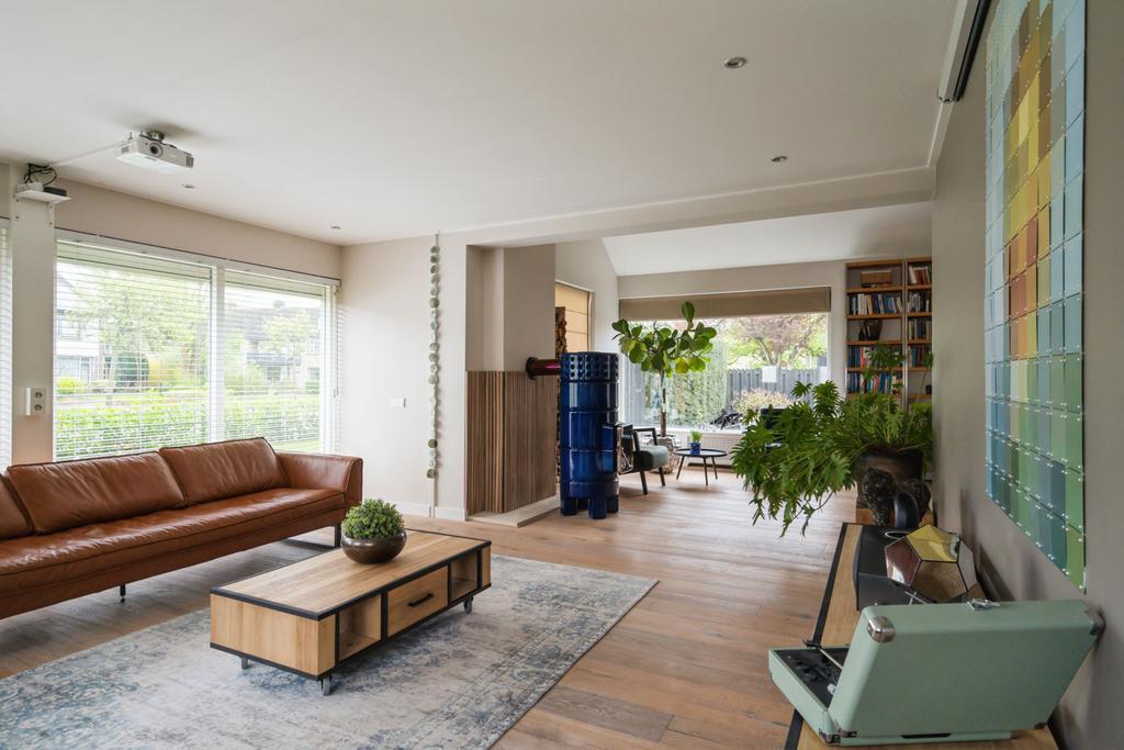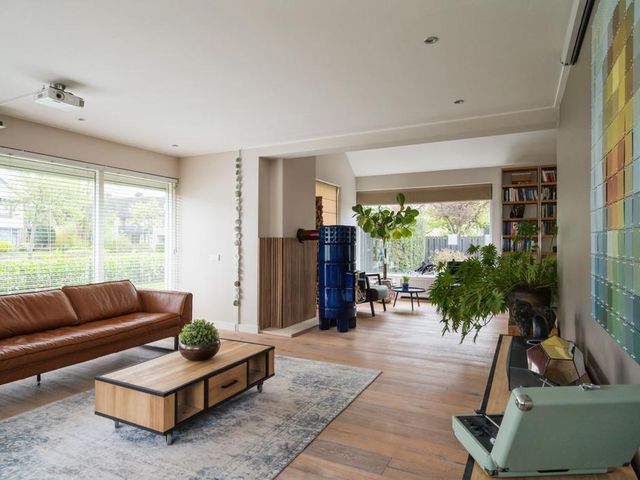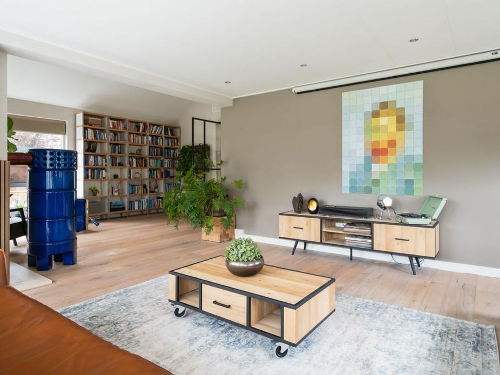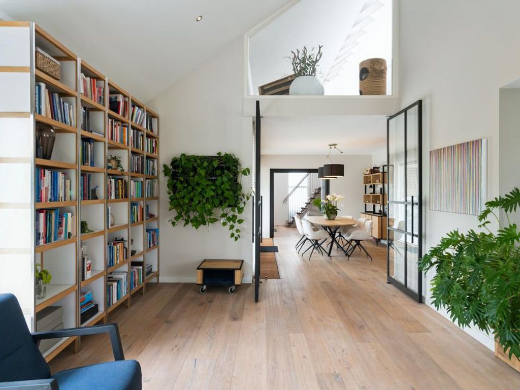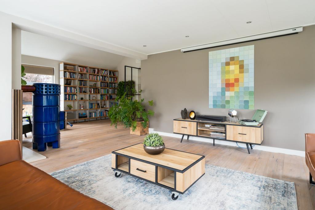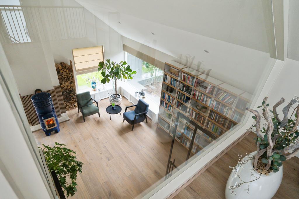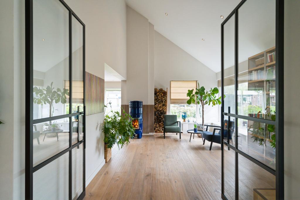 Aan de linkerkant naast de eetkamer treft u twee grote taatsdeuren. Achter deze taatsdeuren ligt de riante woonkamer met veel lichtinval vanwege de vele raampartijen en doorkijk naar de overloop. Zeer veelzijdige ruimte met hoog plafond welke nu is ingericht als bibliotheek en meerdere zithoeken.