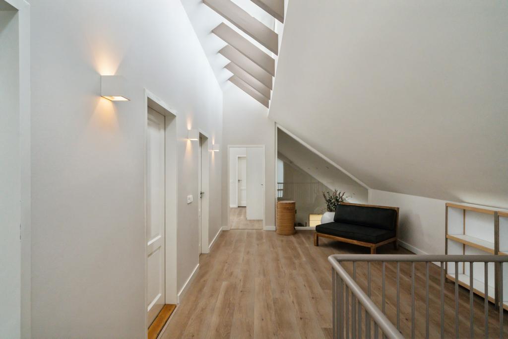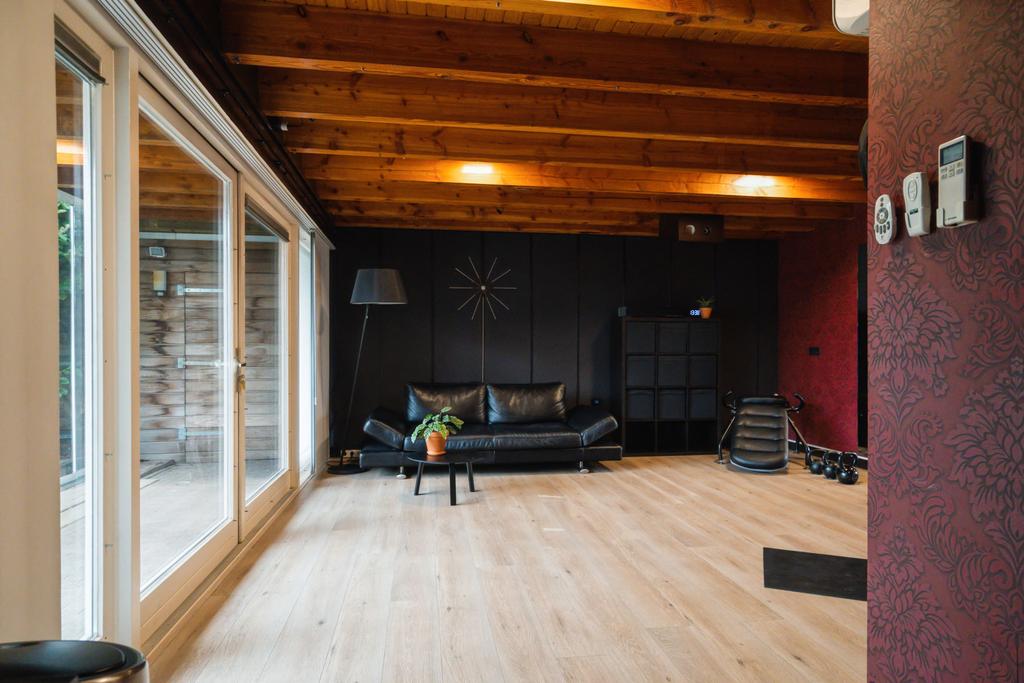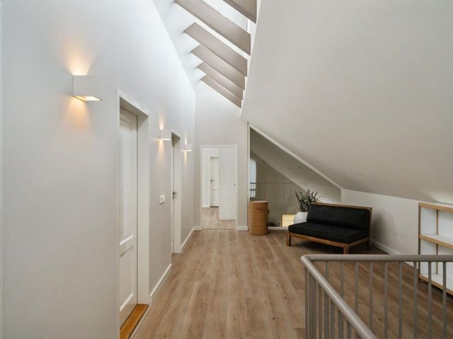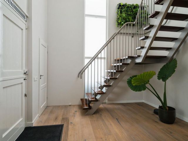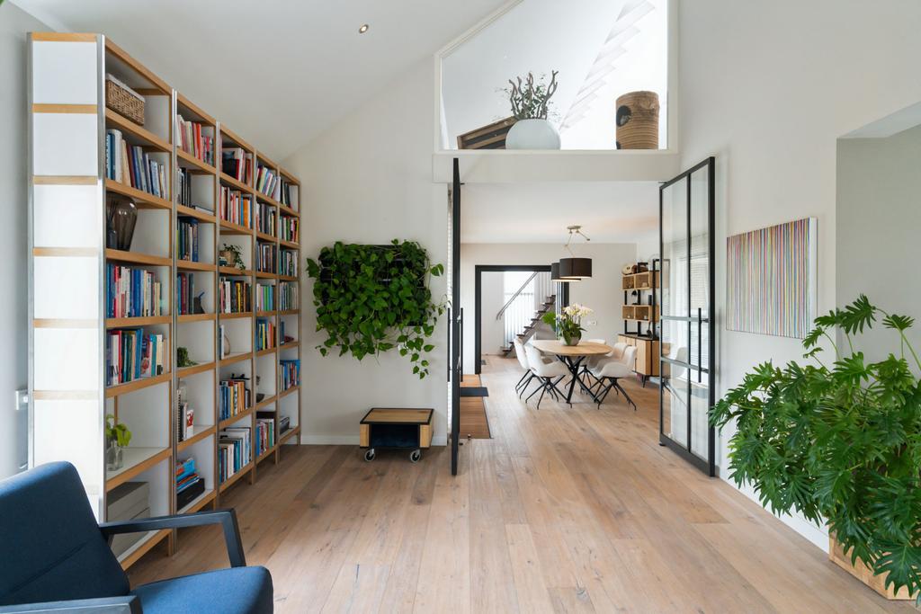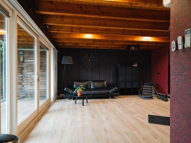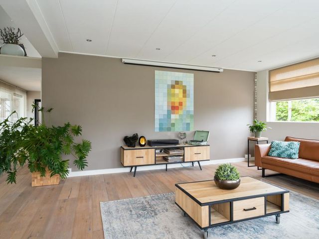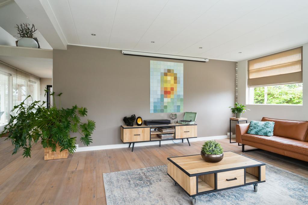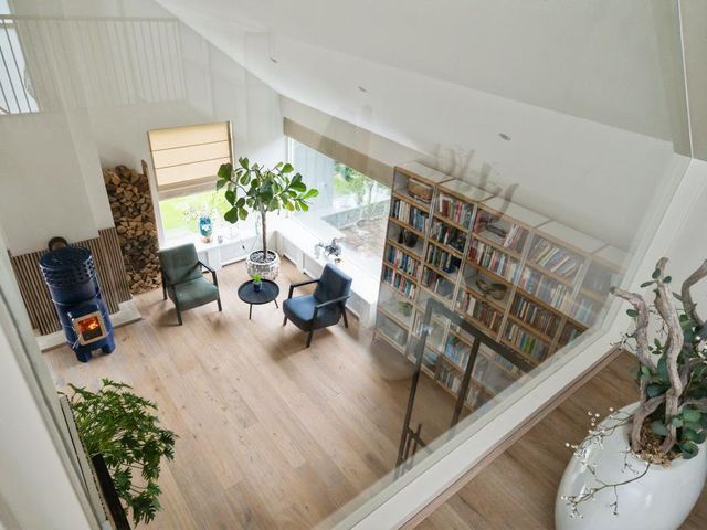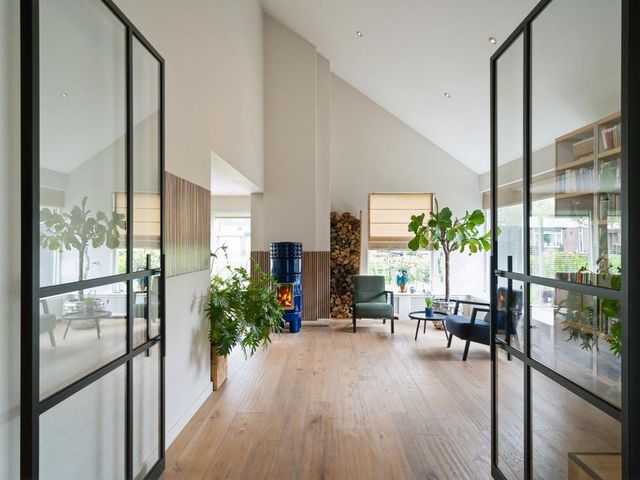 Aan de linkerkant naast de eetkamer treft u twee grote taatsdeuren. Achter deze taatsdeuren ligt de riante woonkamer met veel lichtinval vanwege de vele raampartijen en doorkijk naar de overloop. Zeer veelzijdige ruimte met hoog plafond welke nu is ingericht als bibliotheek en meerdere zithoeken.