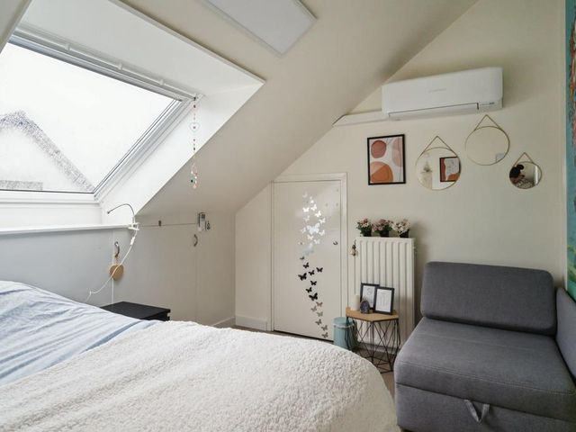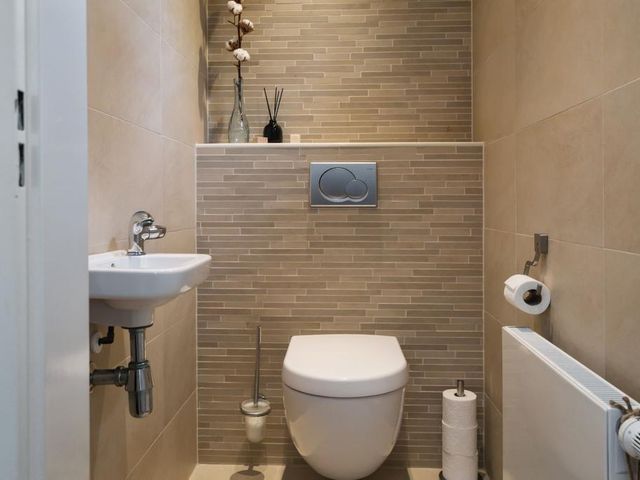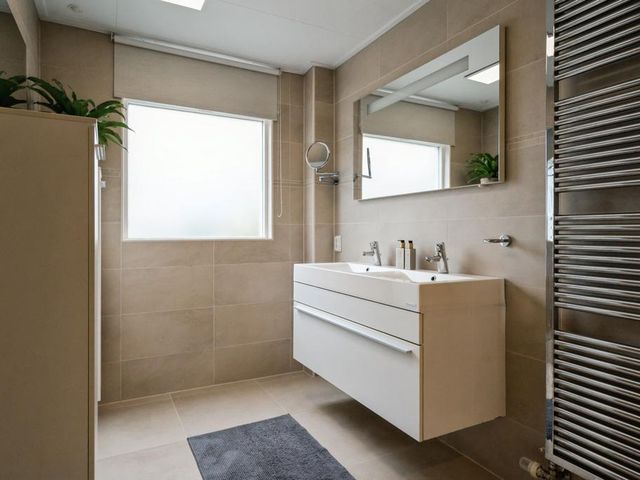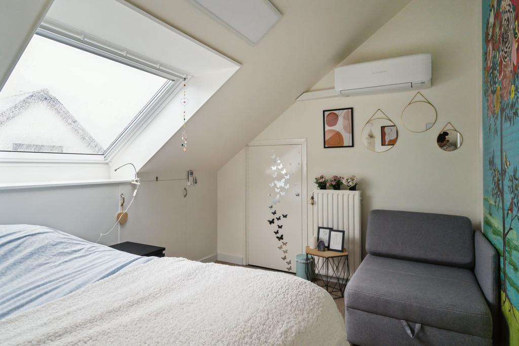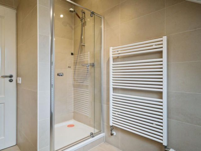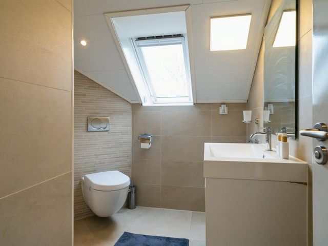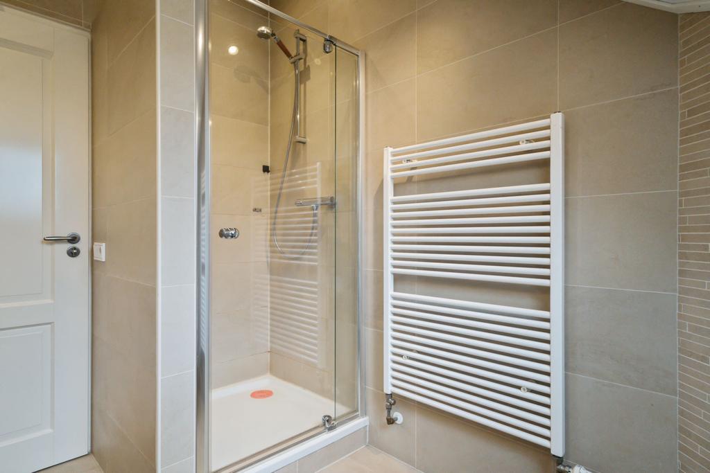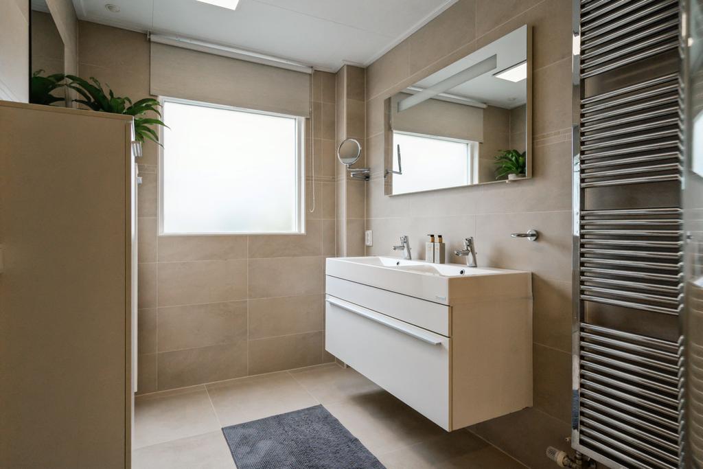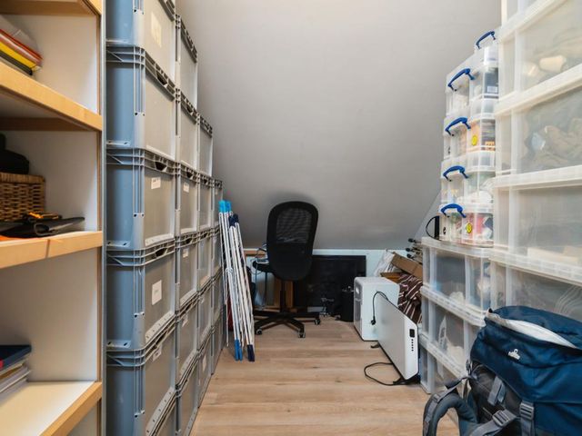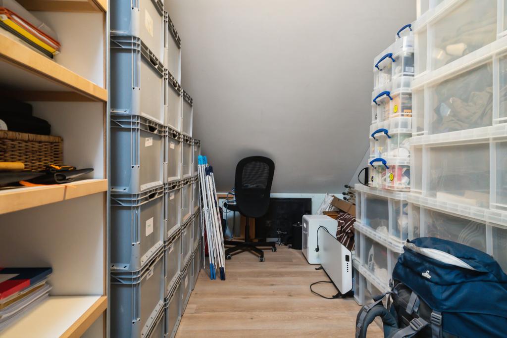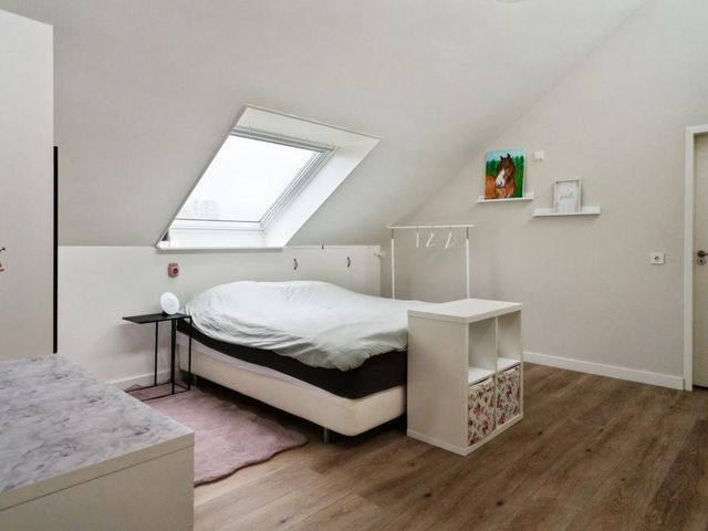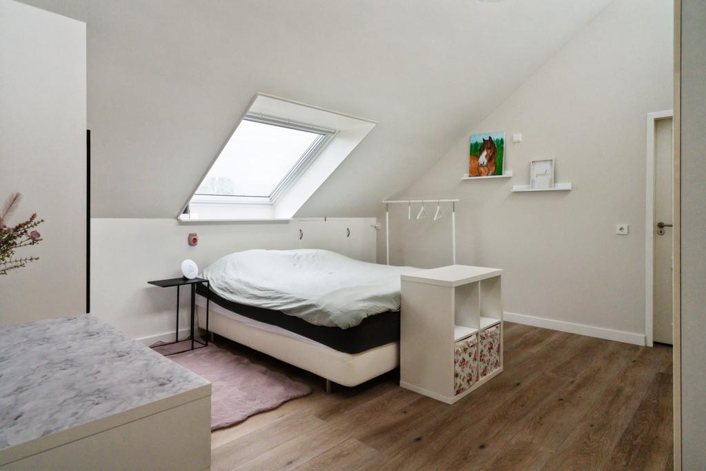 Op de verdieping is er via de grote overloop toegang tot drie royale slaapkamers en een tweede badkamer (v.v. douche, wastafelmeubel en toilet). In de slaapkamers en op de overloop is er veel opslagruimte achter de knieschotten beschikbaar. Achter 1 van de slaapkamers ligt de serviceruimte met warmtepompboiler en zonnepaneelomvormer, en deze biedt ook veel opslagruimte.