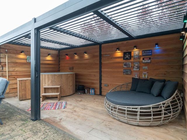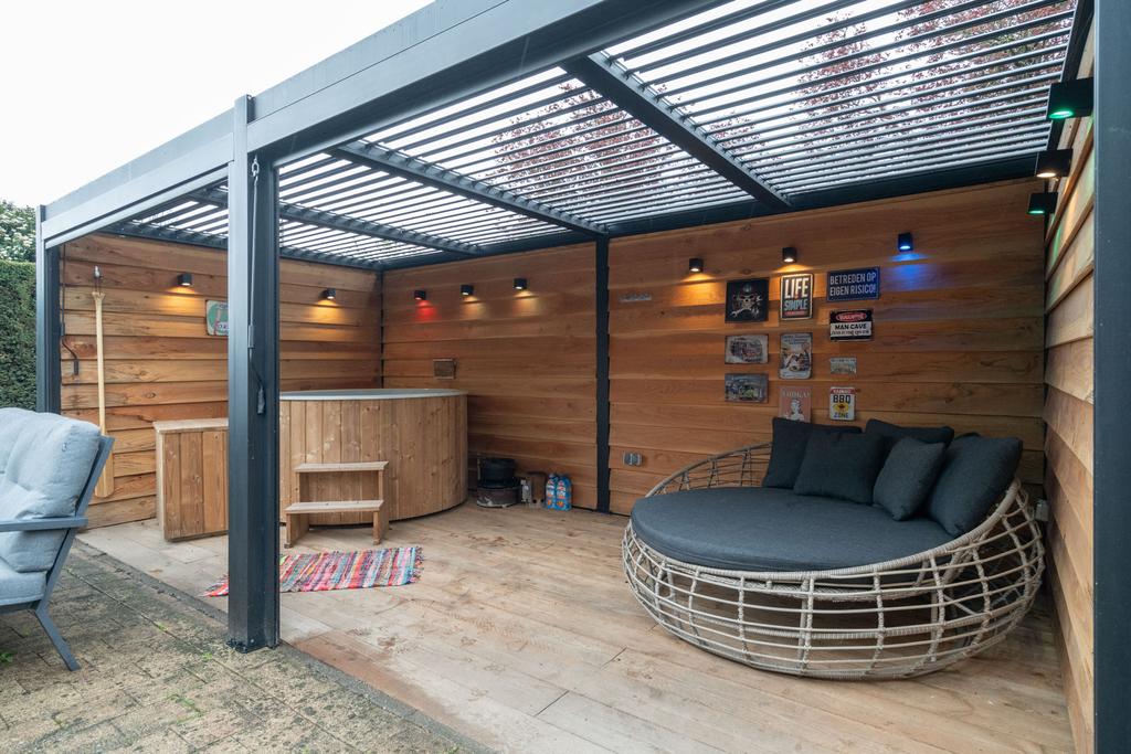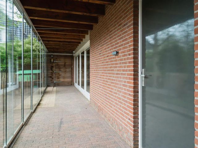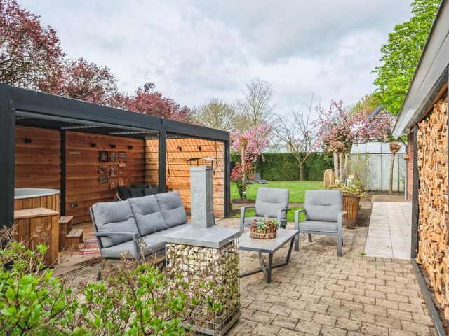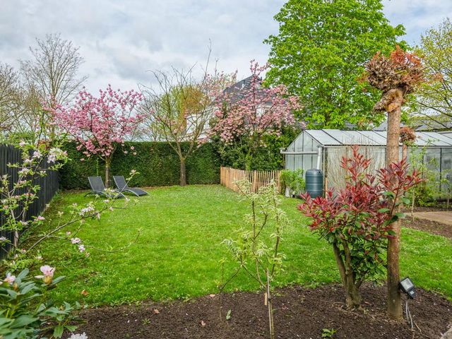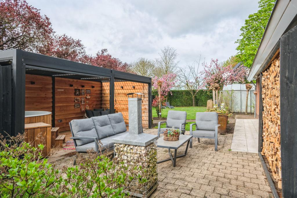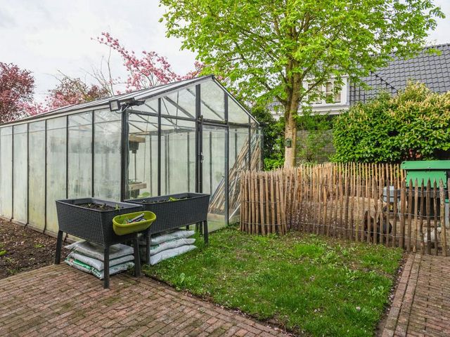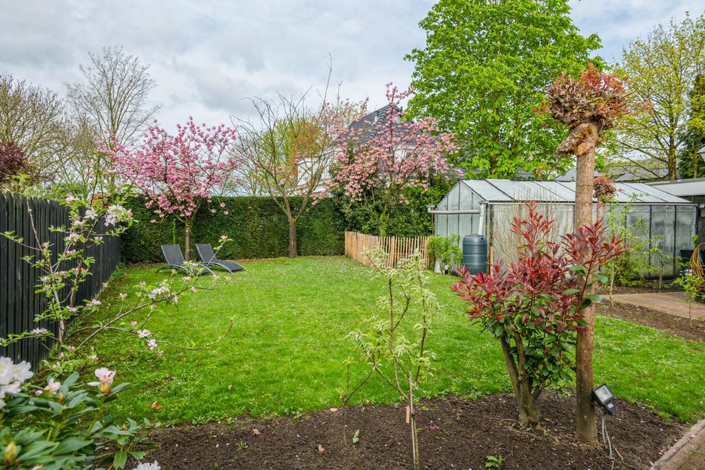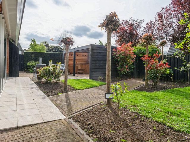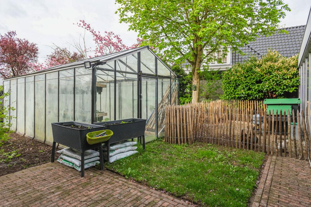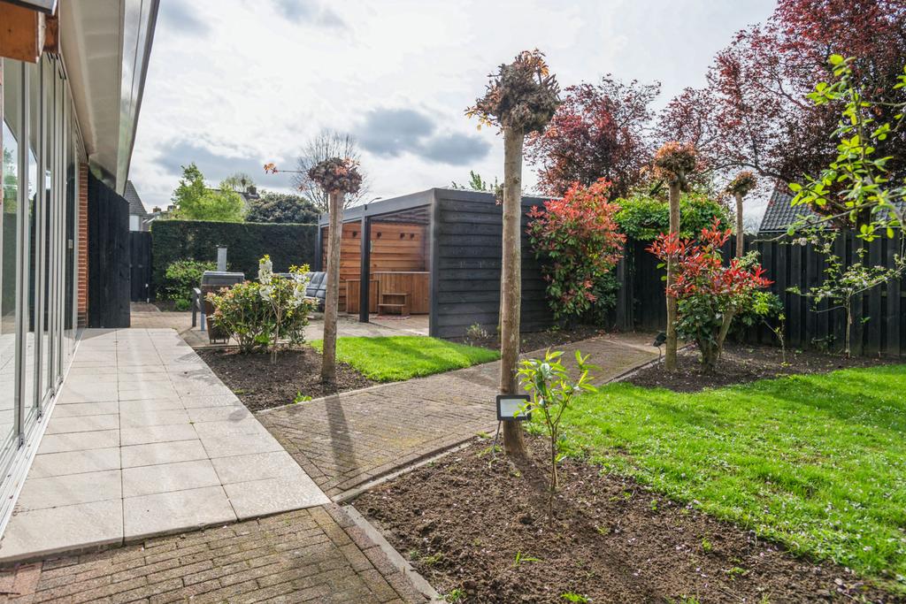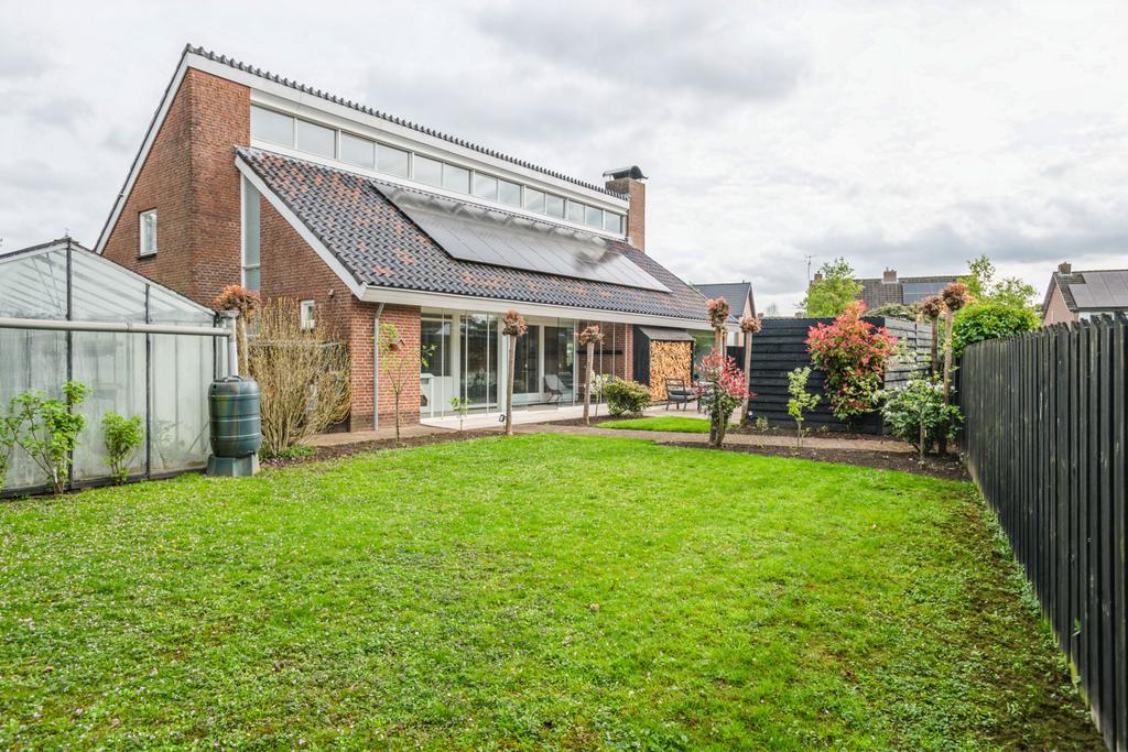 De achtertuin is op het zuiden gelegen en is ruim en zonnig. Er is veel beplanting aanwezig zodat u zon en schaduw heeft. Er is een fraai terras welke bereikbaar is vanuit de serre via de keuken en een tweede schaduwrijk terras gelegen bij de serre van het bijgebouw. Ook is er is een heerlijke overkapping 3 x 6 meter, zodat u altijd lekker buiten kunt zitten.