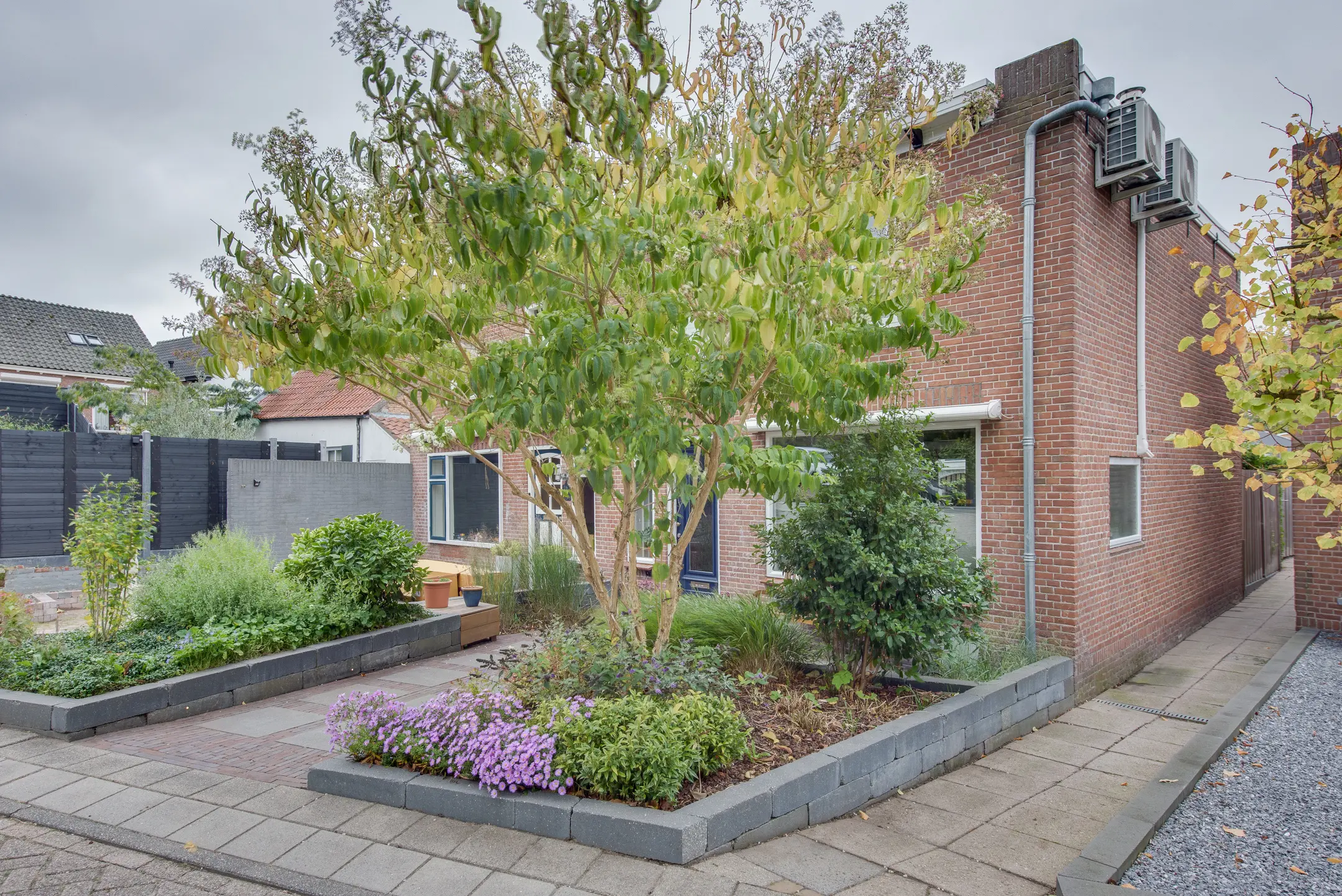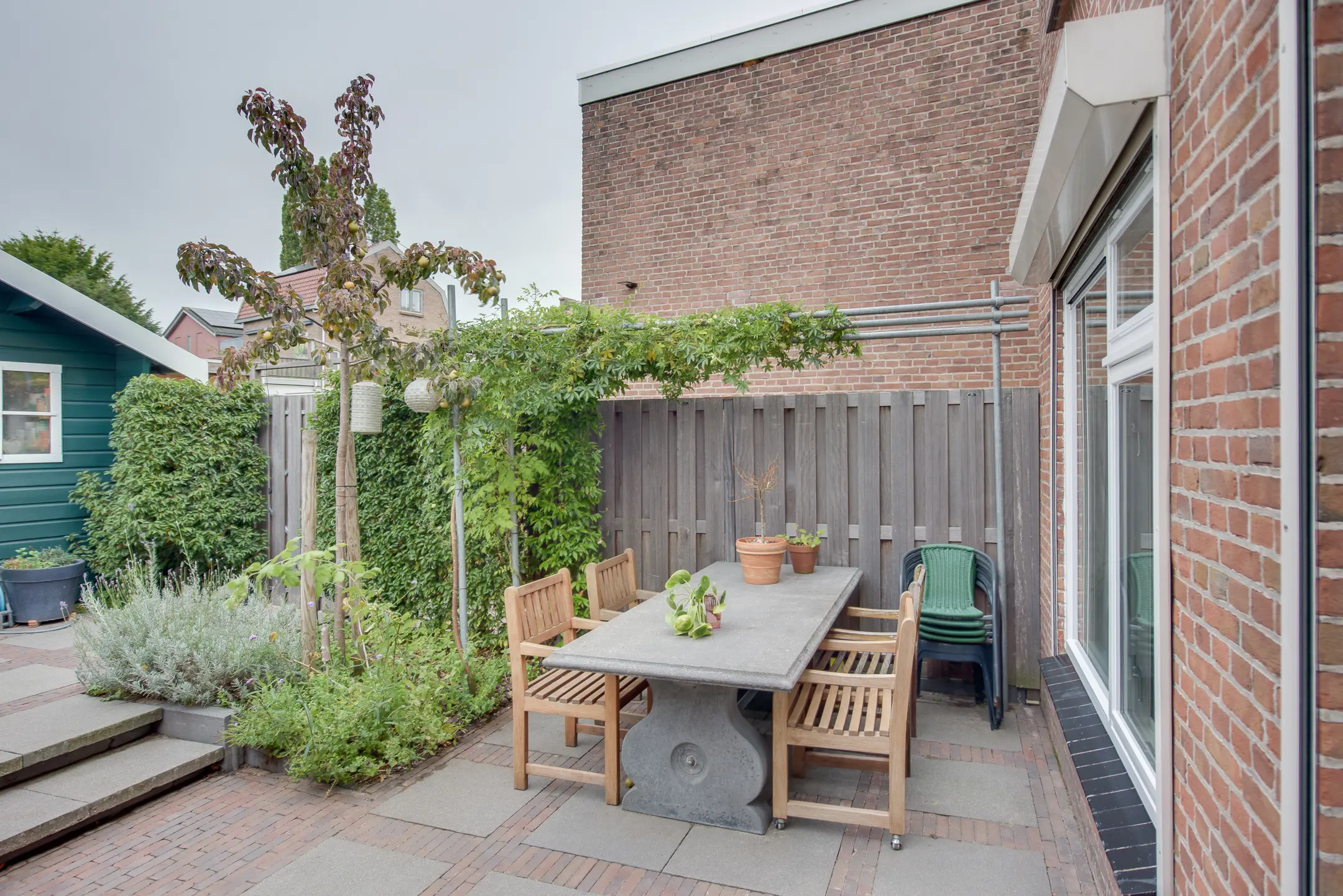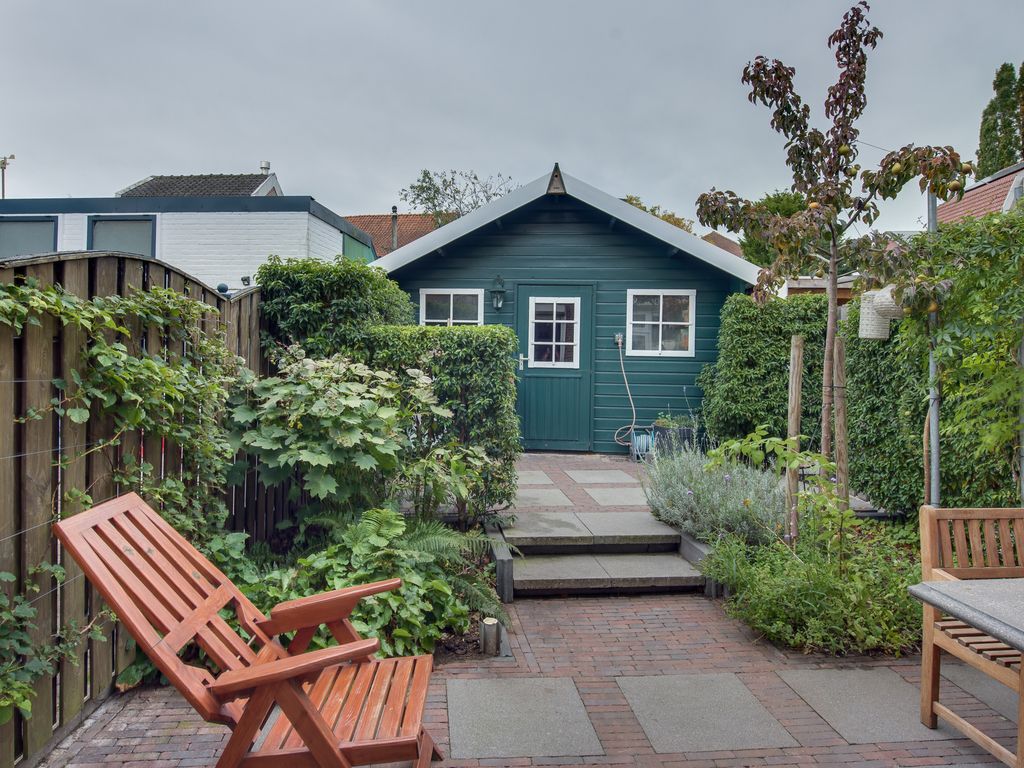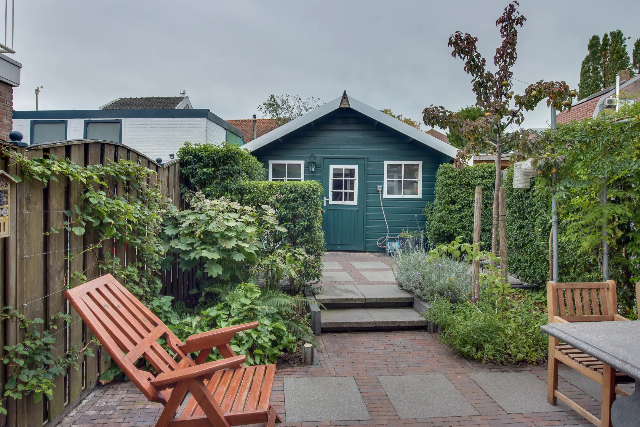 De achtertuin ligt op het westen, waardoor je hier volop kunt genieten van de middag- en avondzon. Er is een fijn terras waar je heerlijk kunt zitten. Achter in de tuin staat een houten schuur met aansluiting voor wasmachine en droger én een zolder — perfect voor extra opslagruimte.