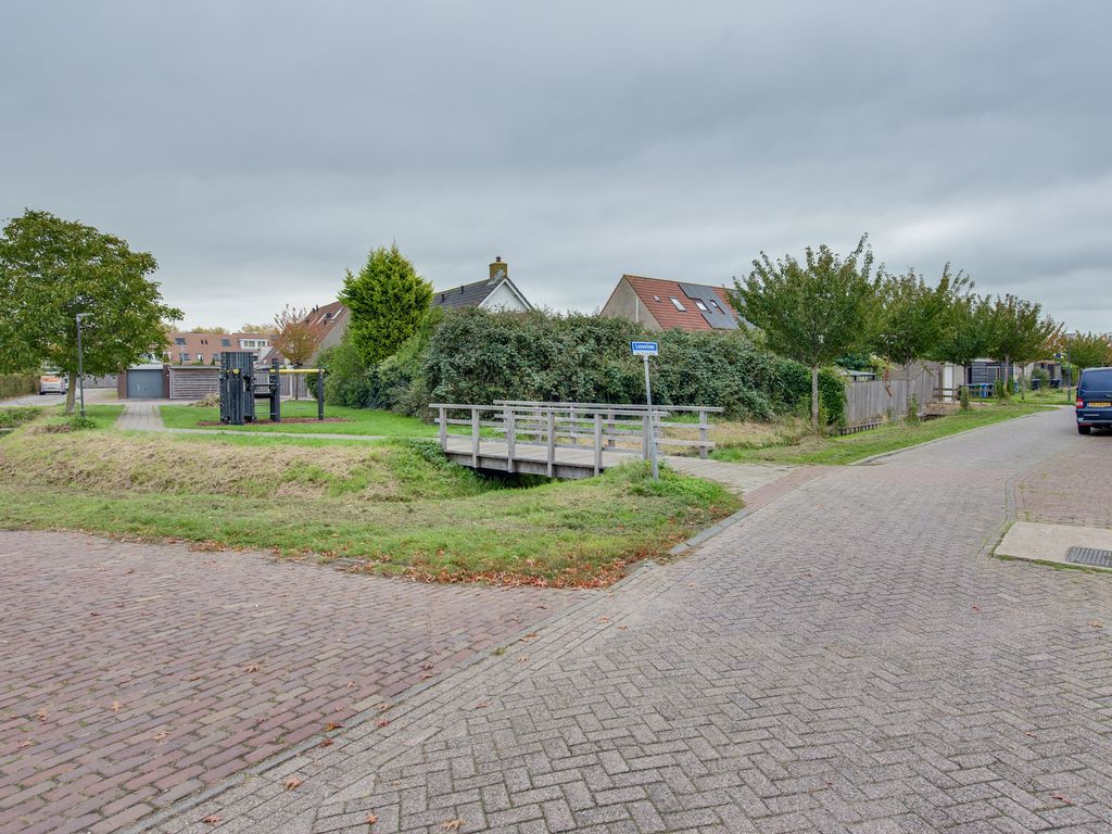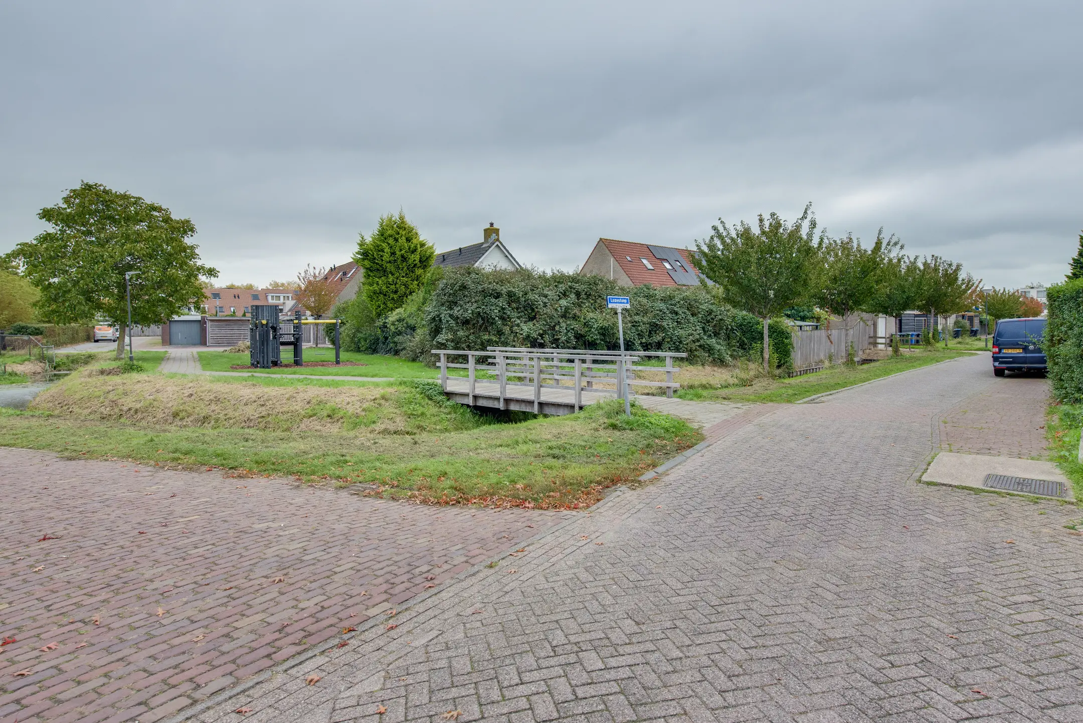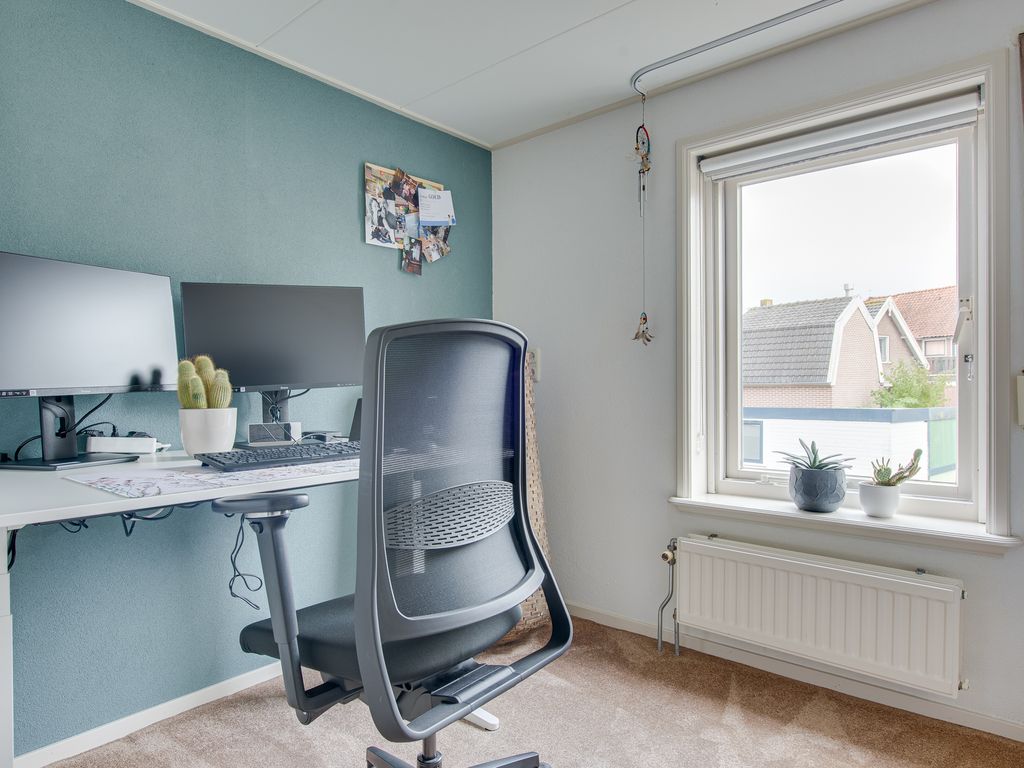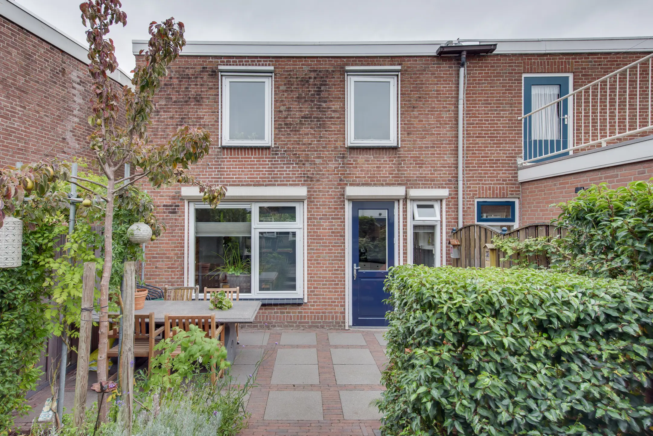 De achtertuin ligt op het westen, waardoor je hier volop kunt genieten van de middag- en avondzon. Er is een fijn terras waar je heerlijk kunt zitten. Achter in de tuin staat een houten schuur met aansluiting voor wasmachine en droger én een zolder — perfect voor extra opslagruimte.