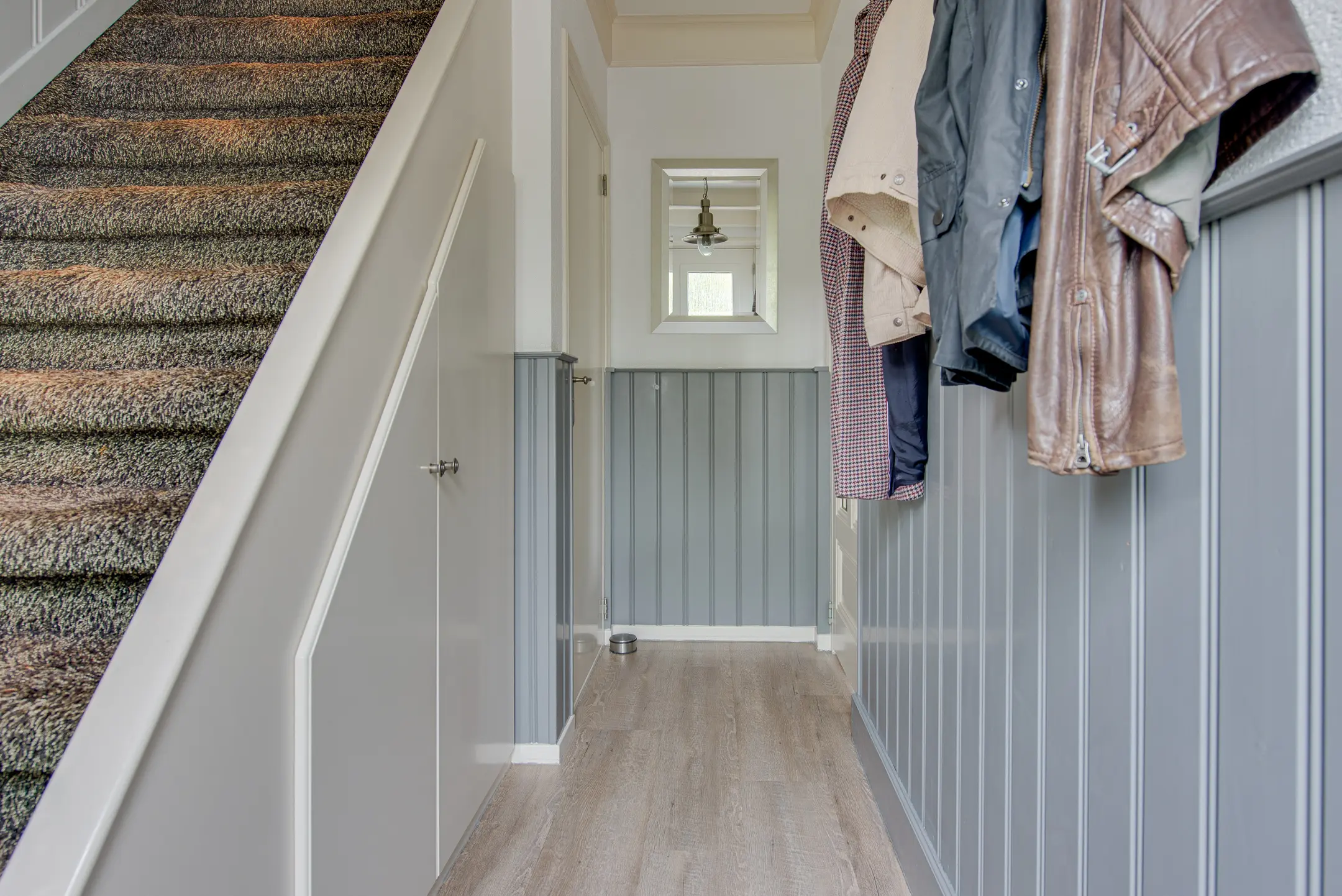 Je komt binnen in de hal met een apart toilet en bergruimte. Vanuit hier loop je door naar de lichte woonkamer, waar grote ramen aan de voor- en achterzijde zorgen voor een prettige hoeveelheid daglicht.