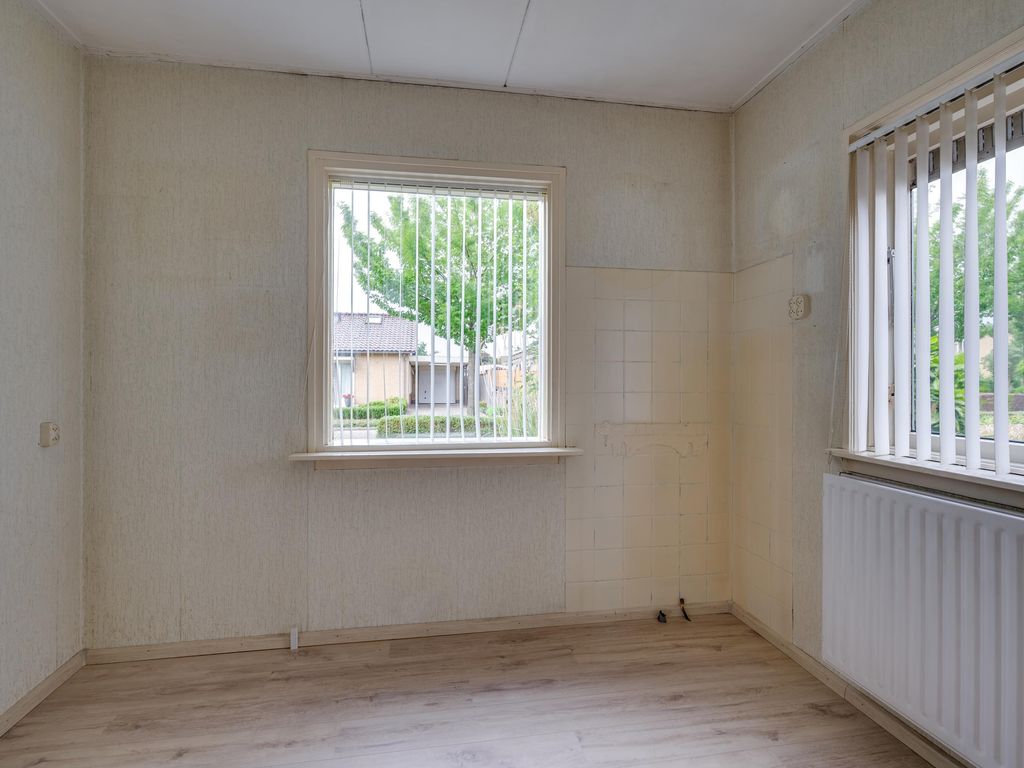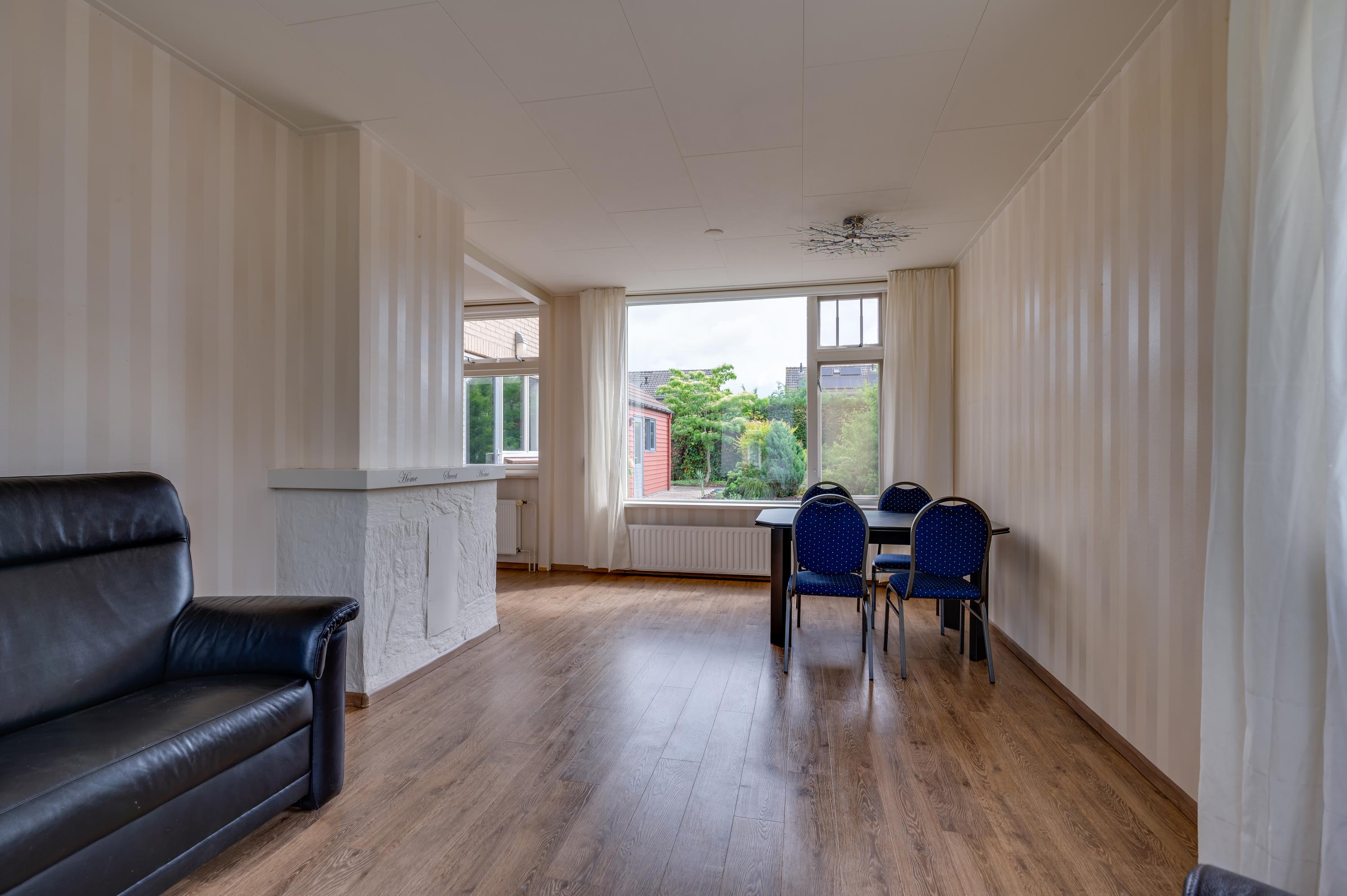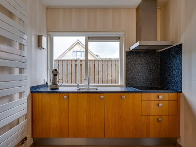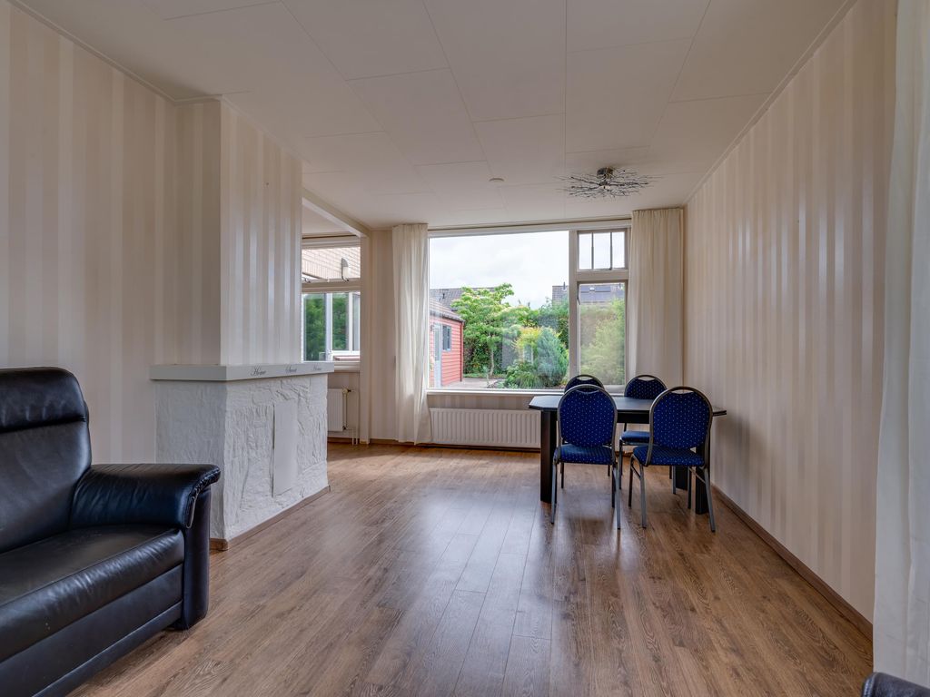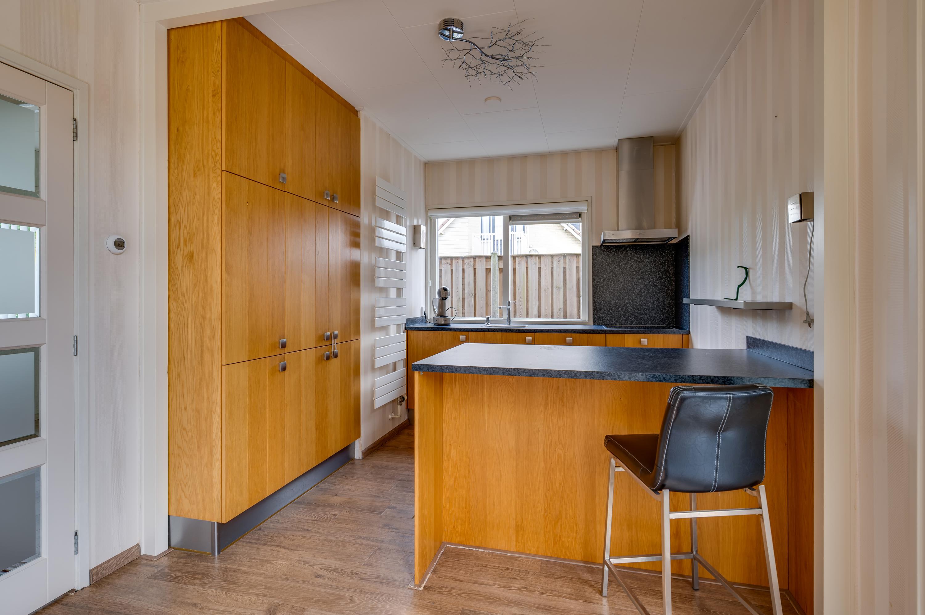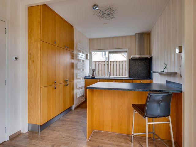 De lichte L-vormige woonkamer heeft een laminaatvloer, schouw en diverse (elektrische) rolluiken. Aansluitend vindt je de open keuken met een modern keukenblok, inductiekookplaat, afzuigkap, vaatwasser, koelkast, designradiator, een gezellig barretje en een praktische vaste kastenwand.