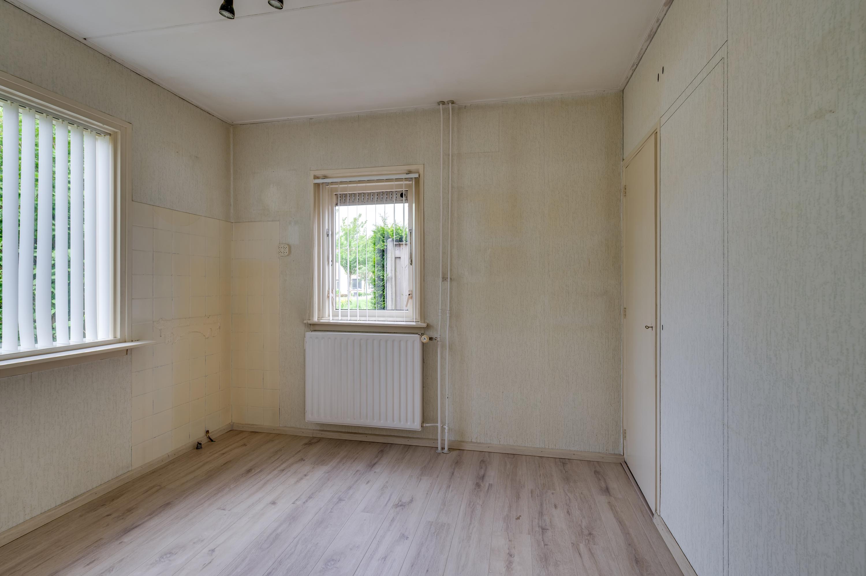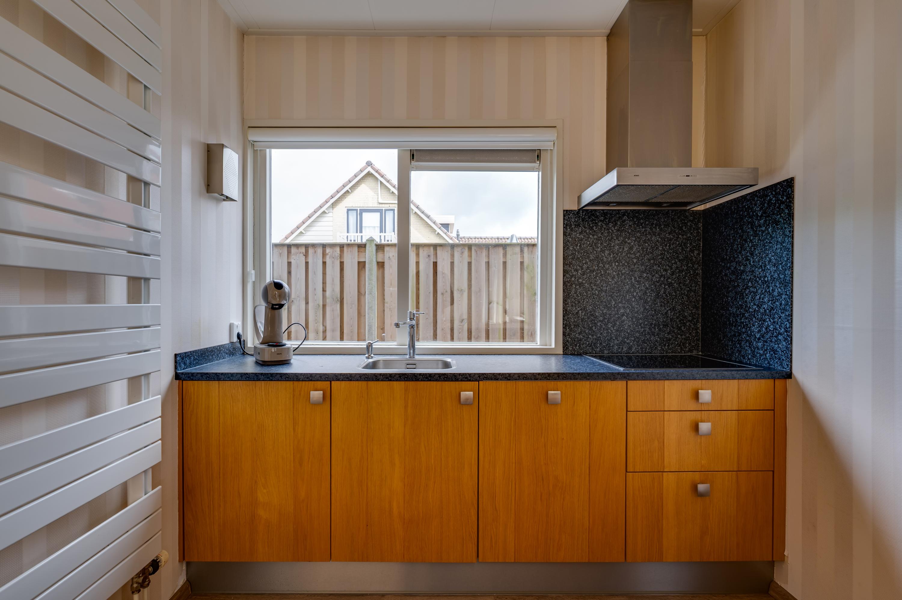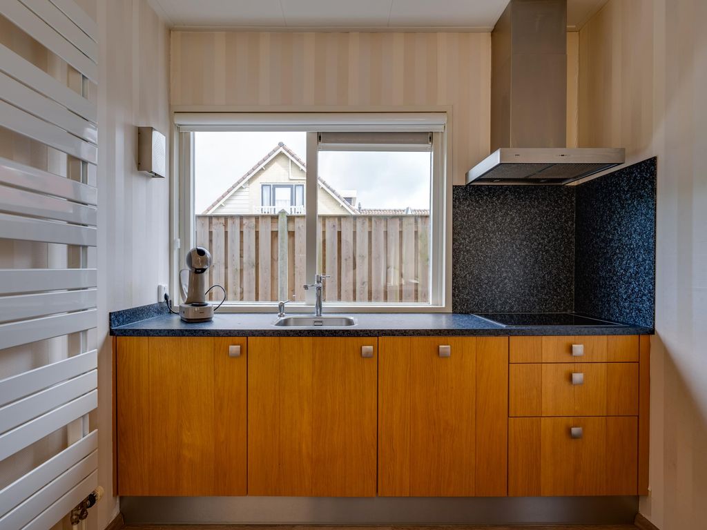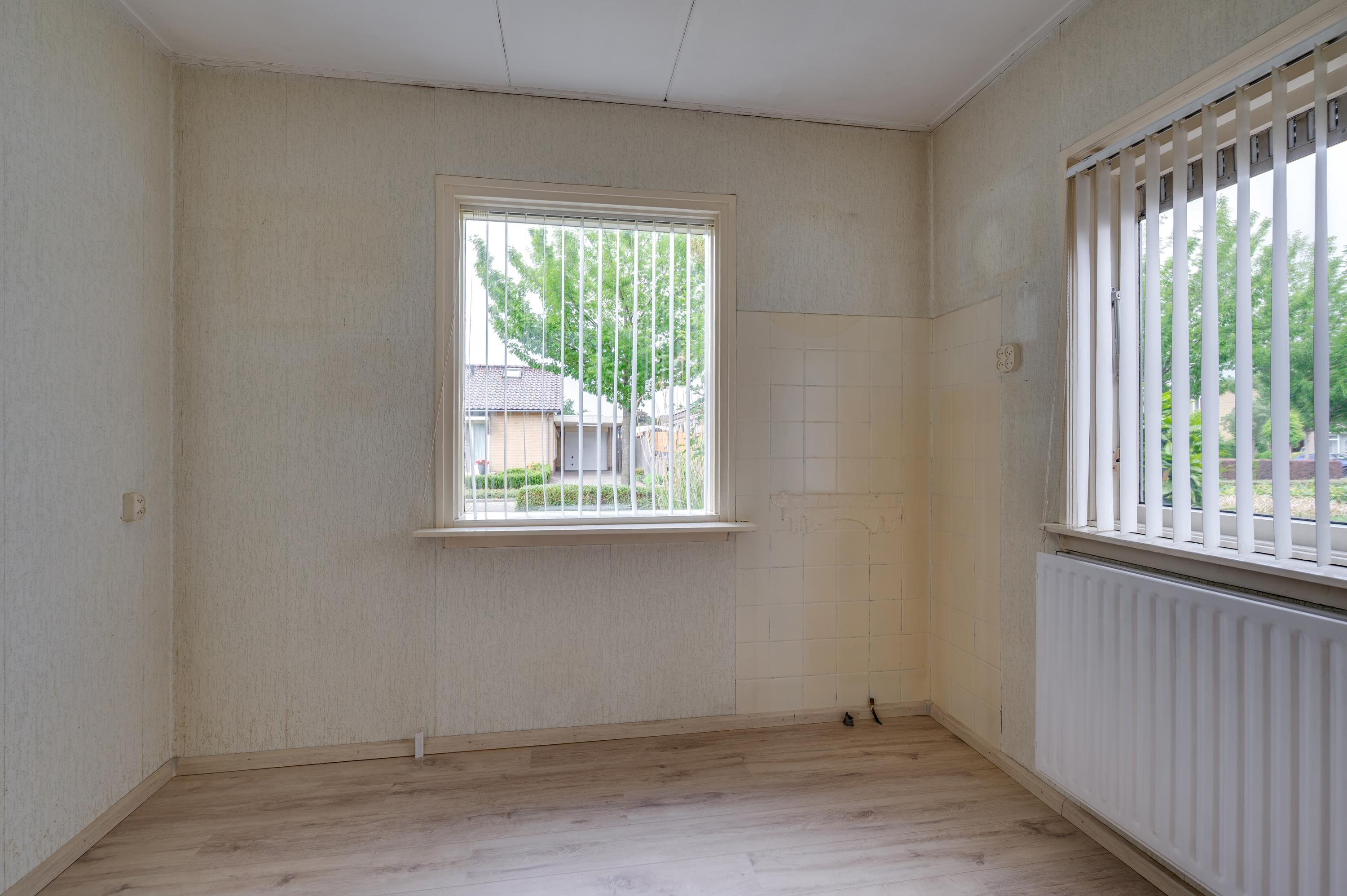 De lichte L-vormige woonkamer heeft een laminaatvloer, schouw en diverse (elektrische) rolluiken. Aansluitend vindt je de open keuken met een modern keukenblok, inductiekookplaat, afzuigkap, vaatwasser, koelkast, designradiator, een gezellig barretje en een praktische vaste kastenwand.