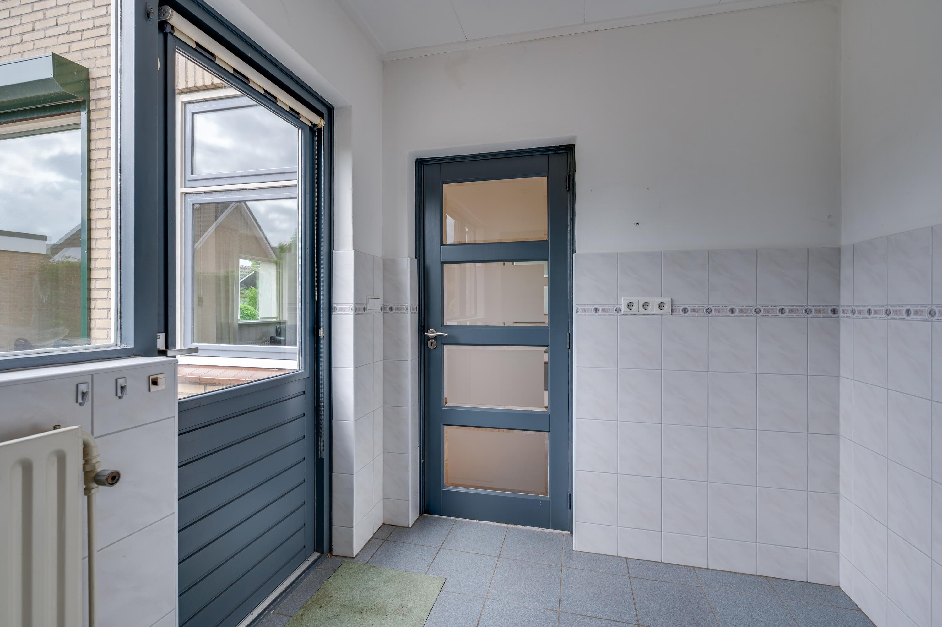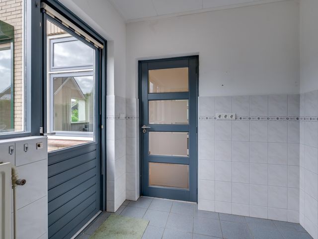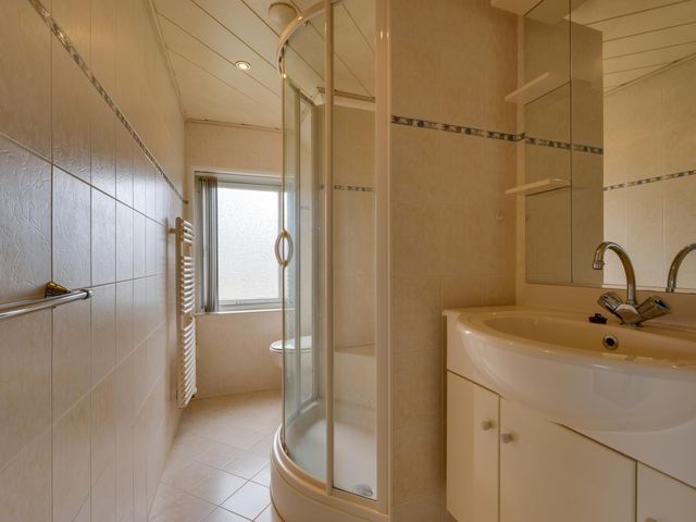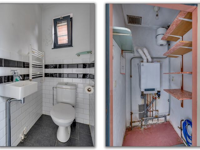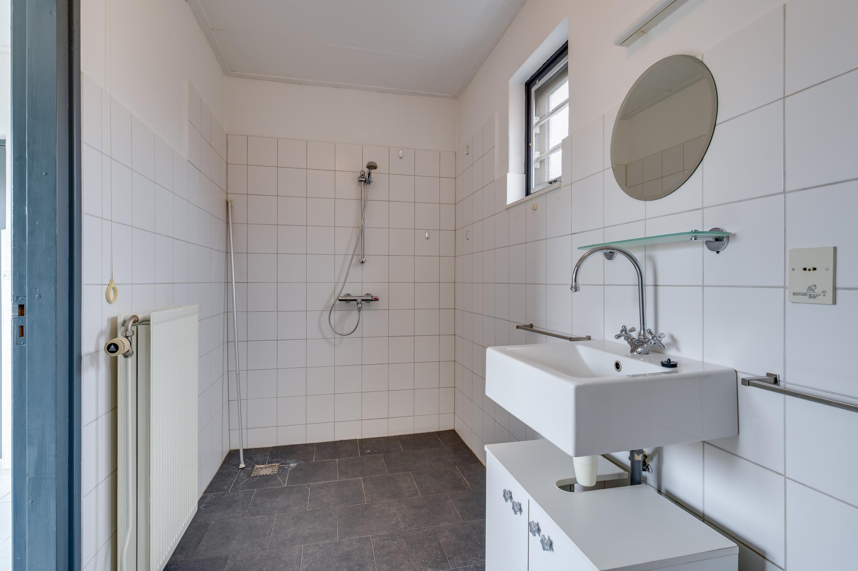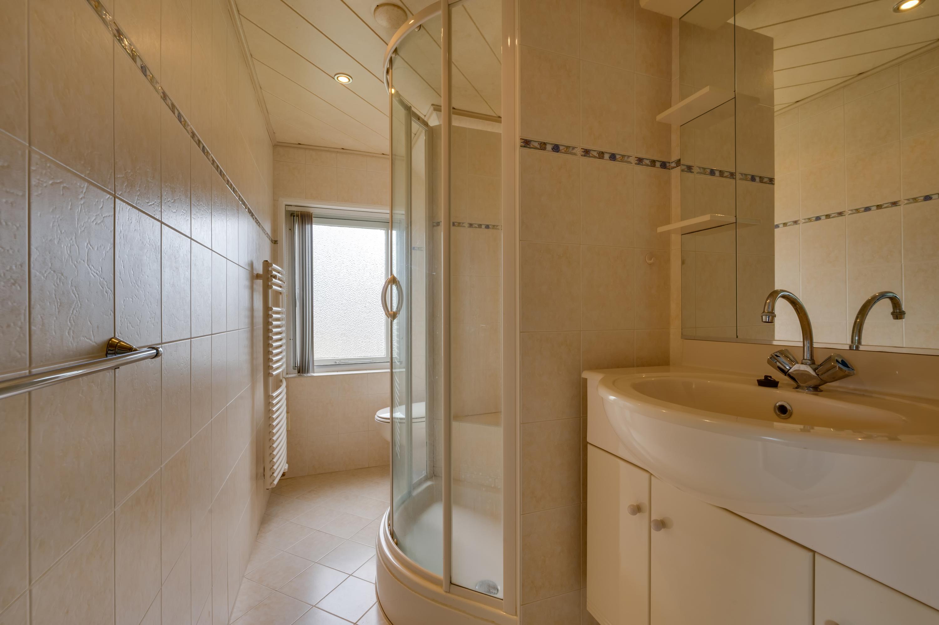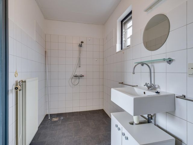 Achter de keuken ligt de aangebouwde bijkeuken met een tegelvloer. Hier vindt je de opstelplaats van de Intergas CV-combiketel (ca. 2022), een toiletruimte met staand toilet en fonteintje, en de ruime, betegelde badkamer met een inloopdouche, wastafelmeubel en aansluitingen voor uw wasmachine en droger.