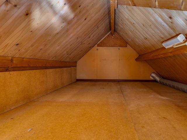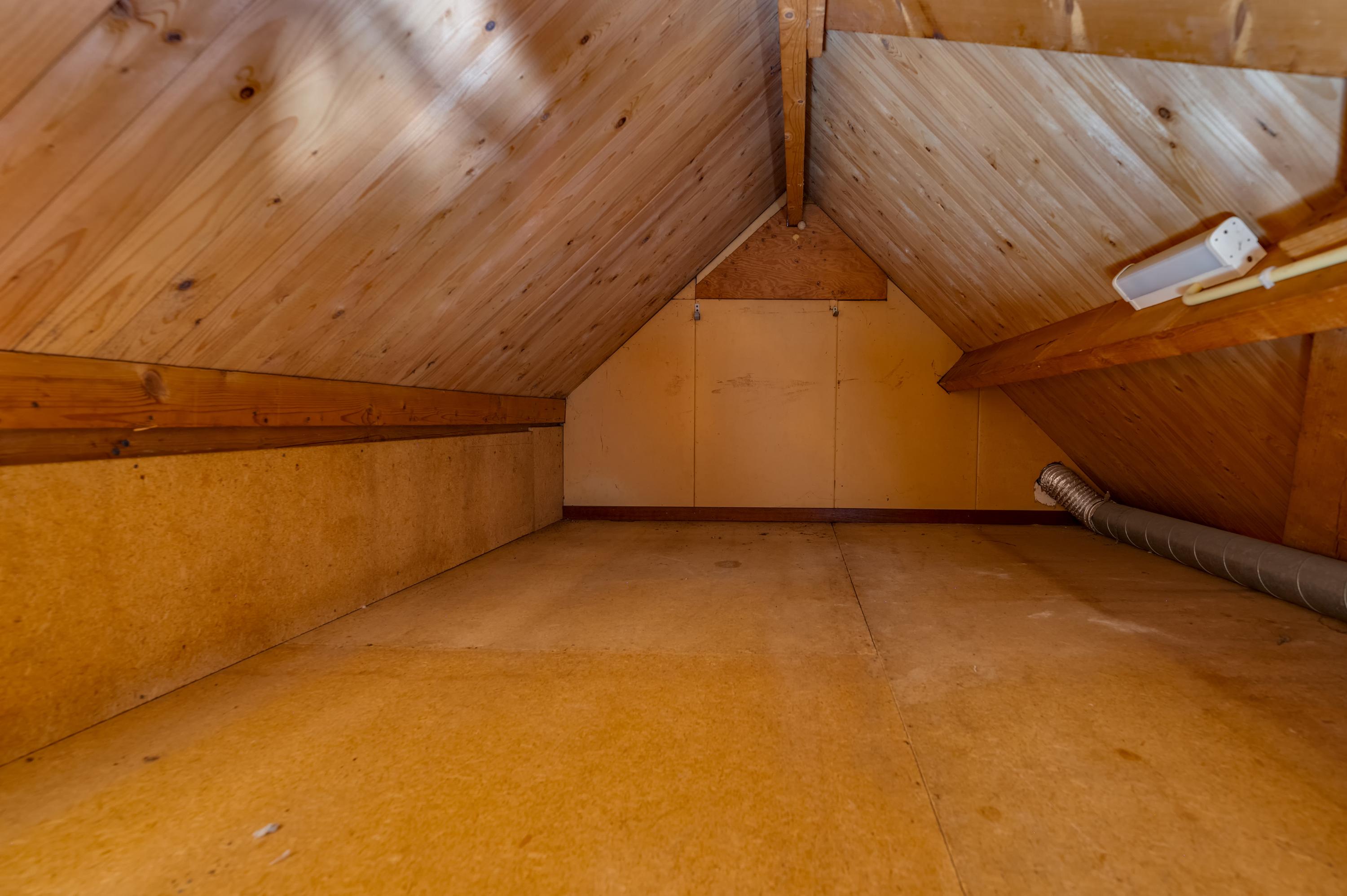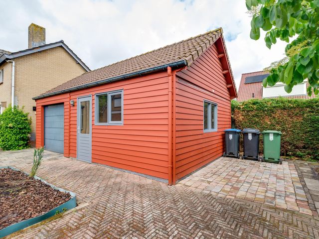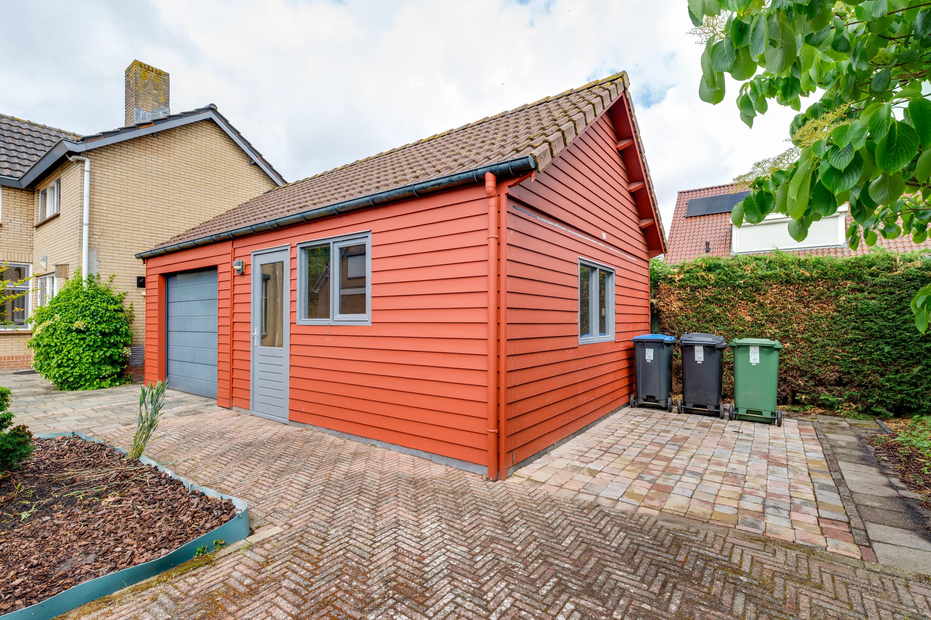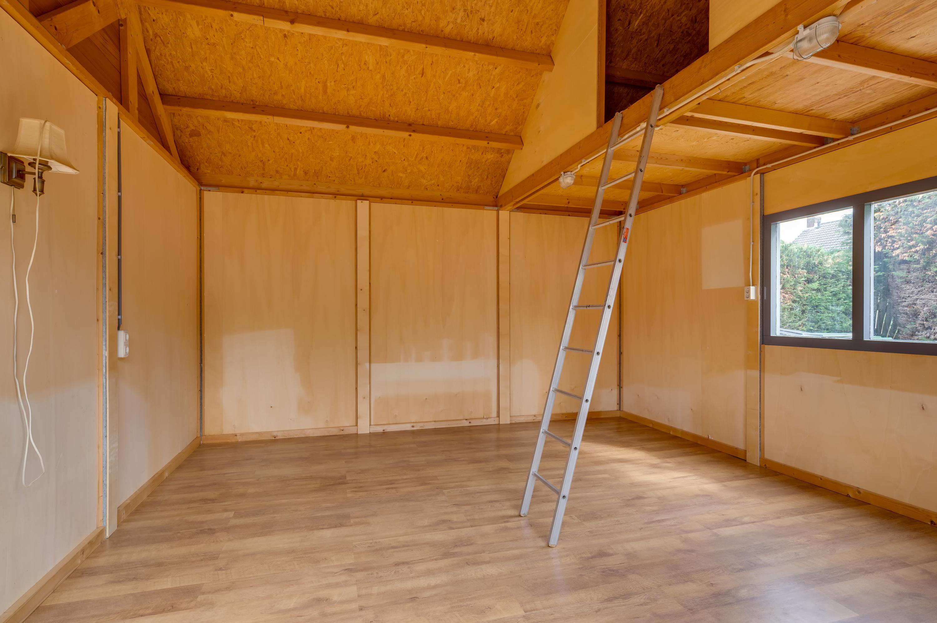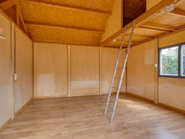 De vrijstaande cederhouten garage is voorzien van een elektrische roldeur – ideaal voor het parkeren van je auto of als extra berging. De naastgelegen atelierruimte of werkplek heeft een laminaatvloer en een extra bergvliering: perfect voor de creatieveling of voor wie aan huis wil werken.