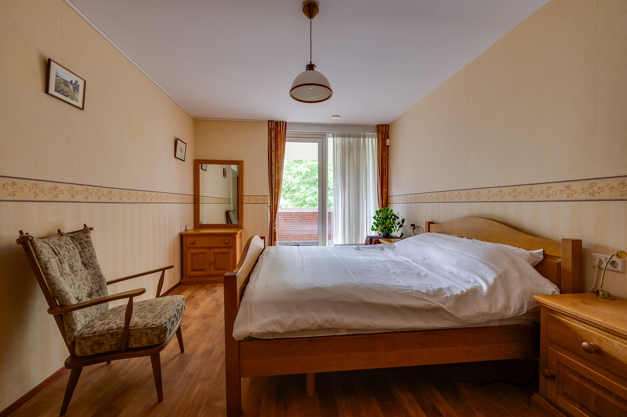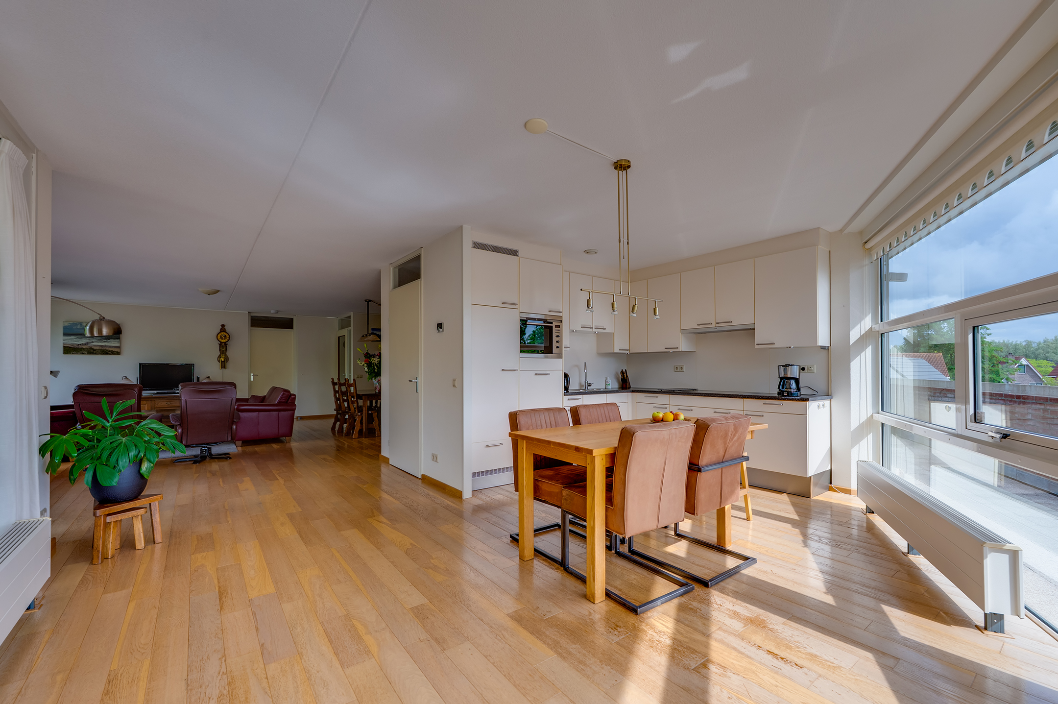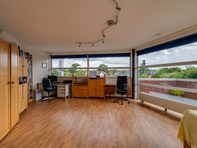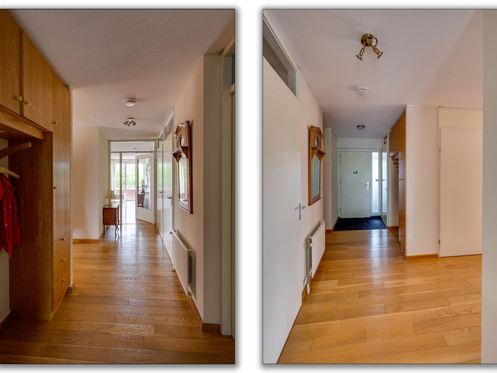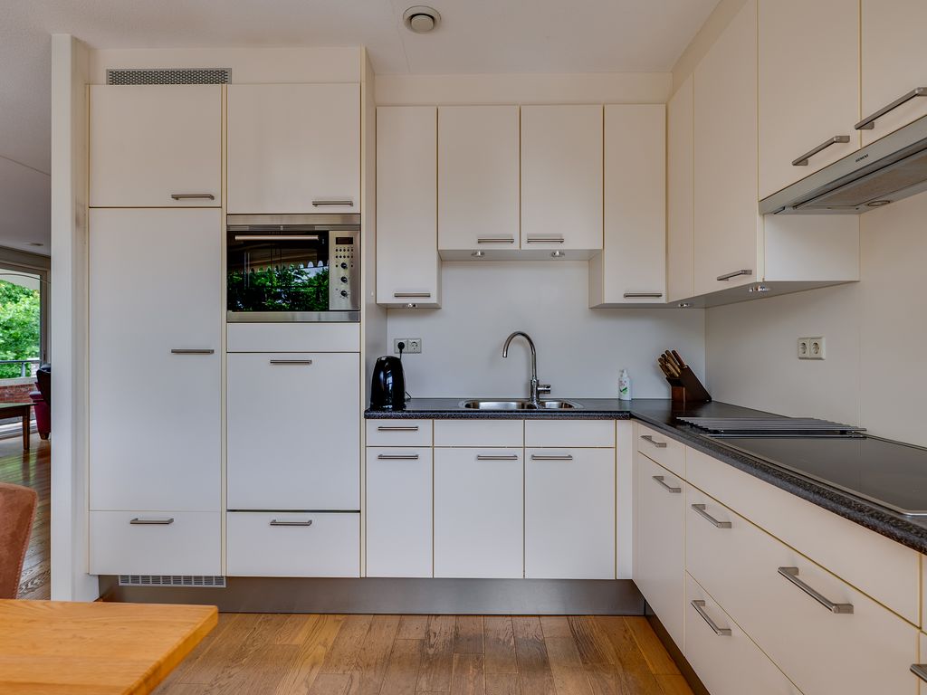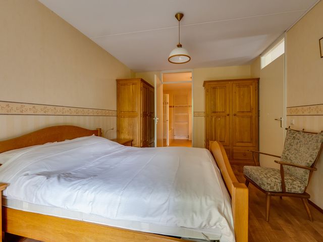 Aansluitend aan de keuken vind je een praktische bijkeuken met ruimte voor de wasmachine en een extra wastafel. Via de bijkeuken of de hal bereik je de grootste slaapkamer, een heerlijke lichte ruimte met ramen rondom. De tweede slaapkamer heeft toegang tot de badkamer en het balkon. De derde kamer is voorzien van een handige ingebouwde kastenwand.