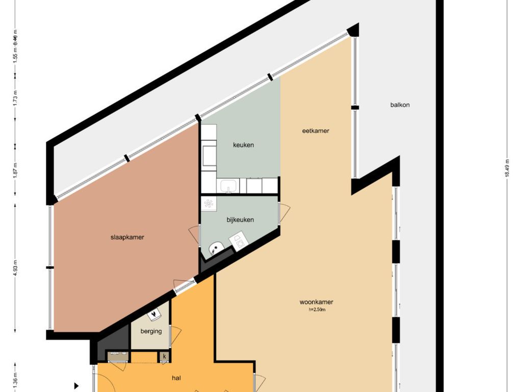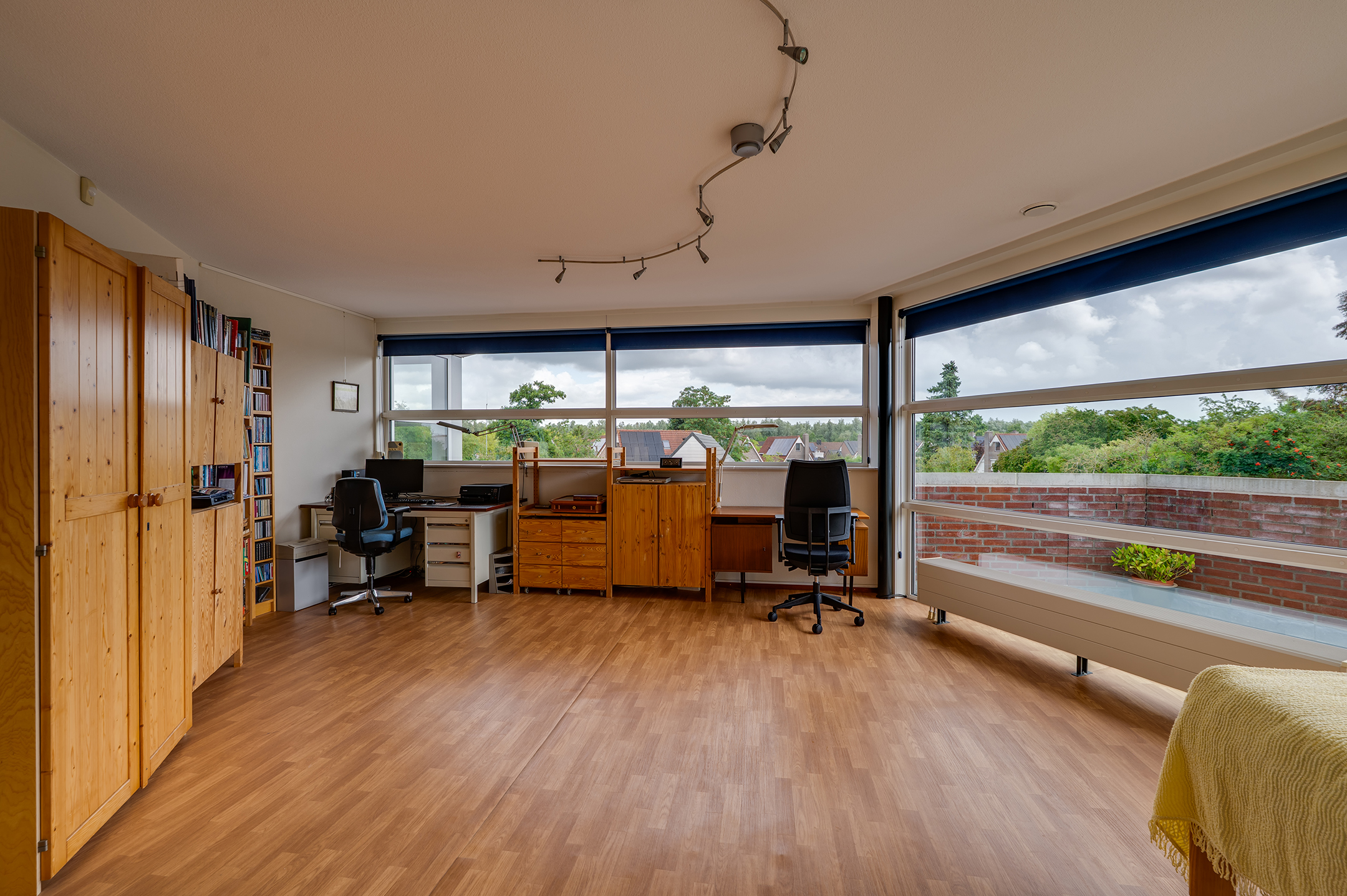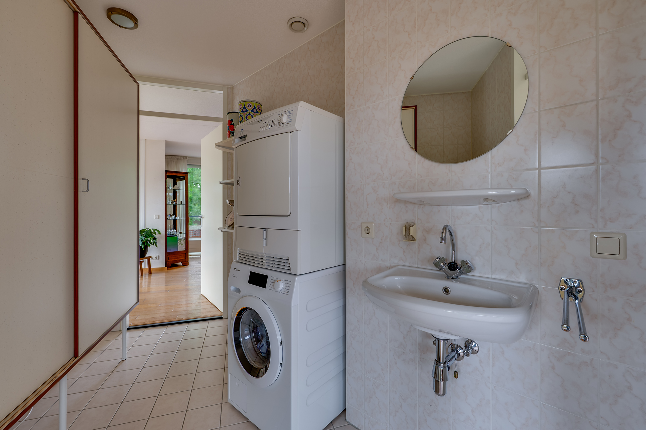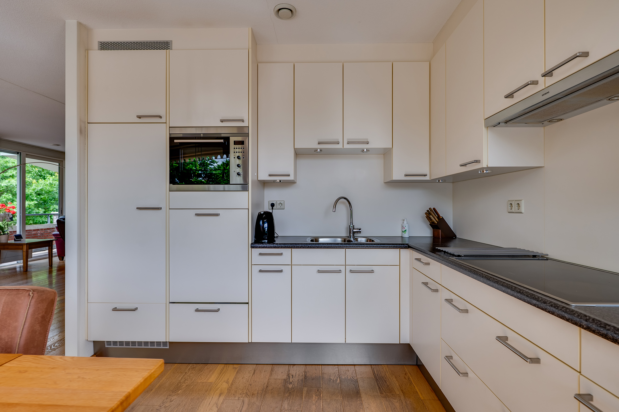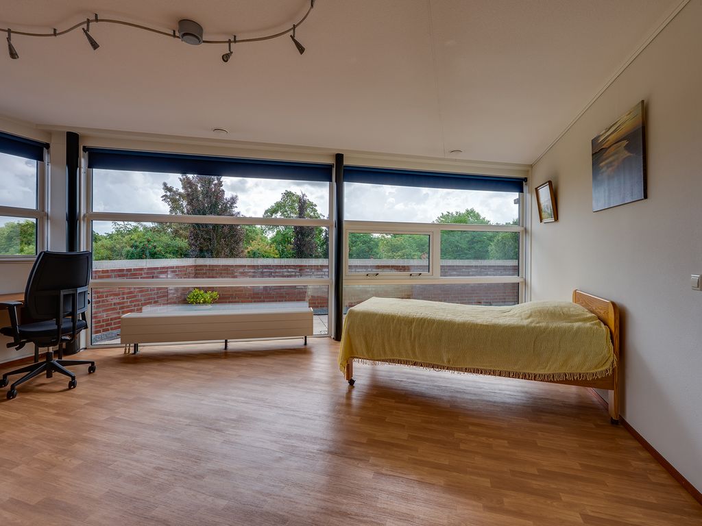 Aansluitend aan de keuken vind je een praktische bijkeuken met ruimte voor de wasmachine en een extra wastafel. Via de bijkeuken of de hal bereik je de grootste slaapkamer, een heerlijke lichte ruimte met ramen rondom. De tweede slaapkamer heeft toegang tot de badkamer en het balkon. De derde kamer is voorzien van een handige ingebouwde kastenwand.