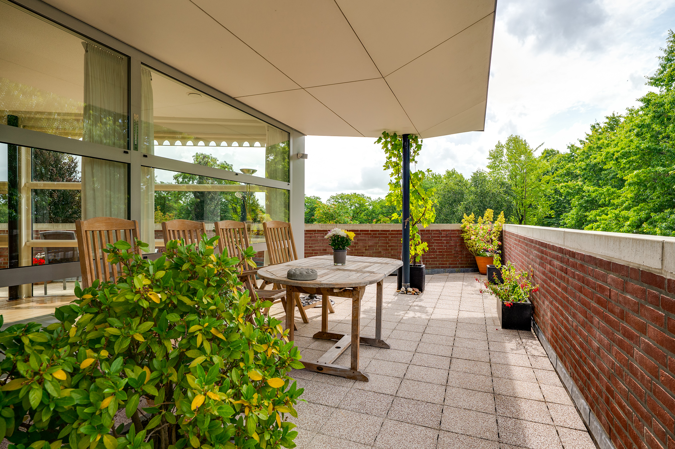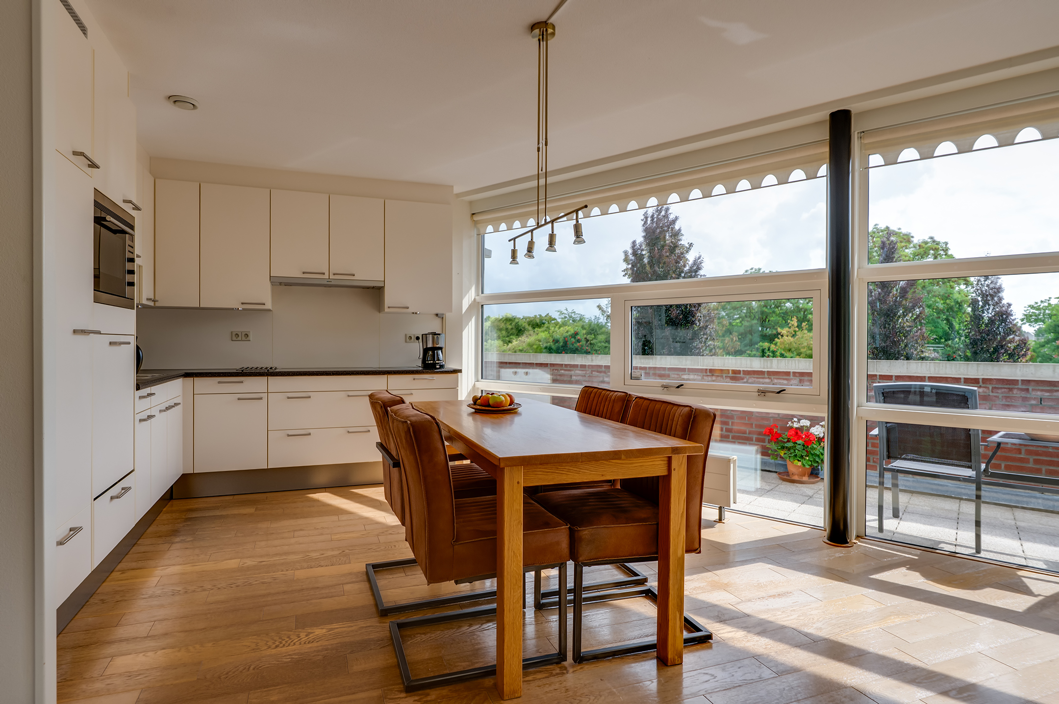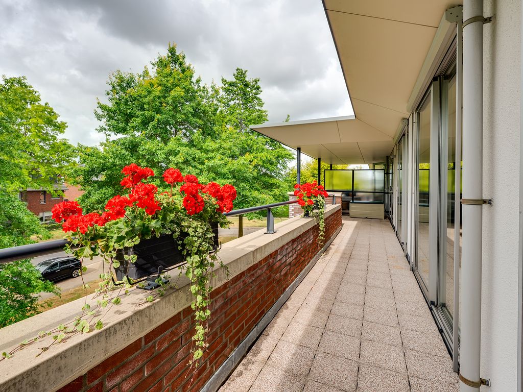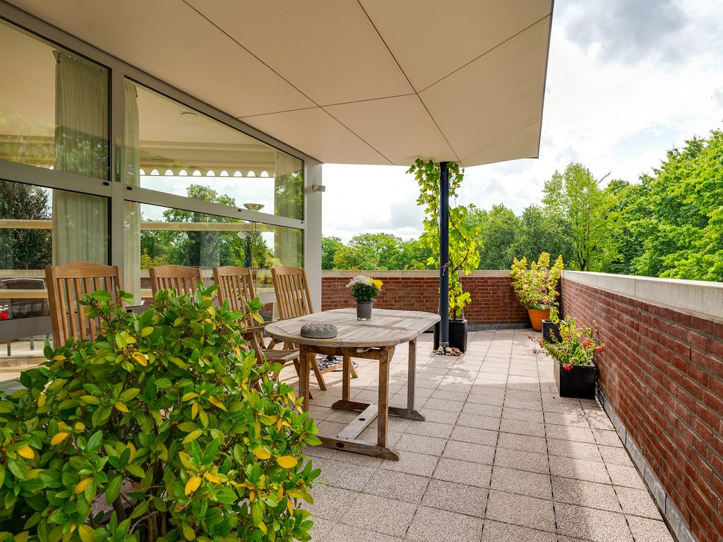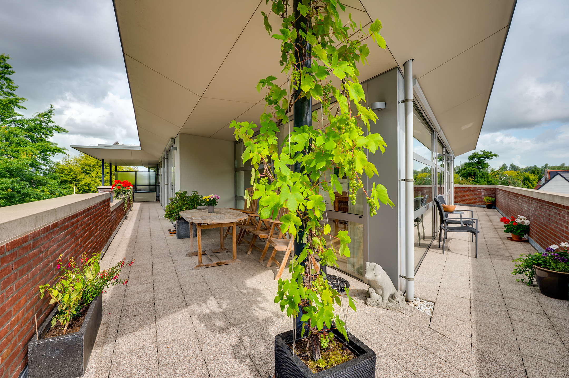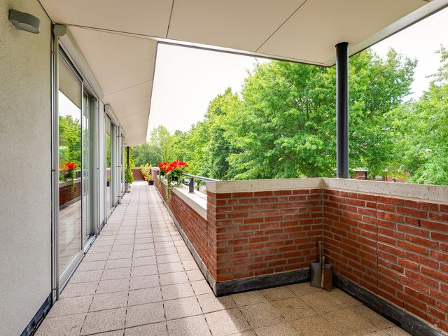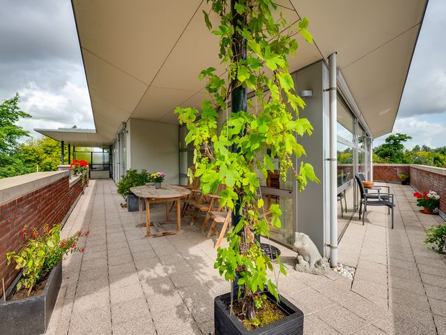 Het balkon loopt aan twee kanten langs het penthouse, waardoor je altijd een fijn plekje hebt in de zon of schaduw. Er is ruimte genoeg voor een tuinset en meerdere gezellige zitjes.