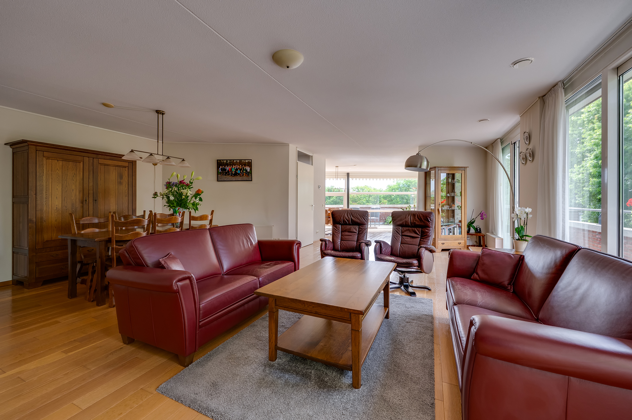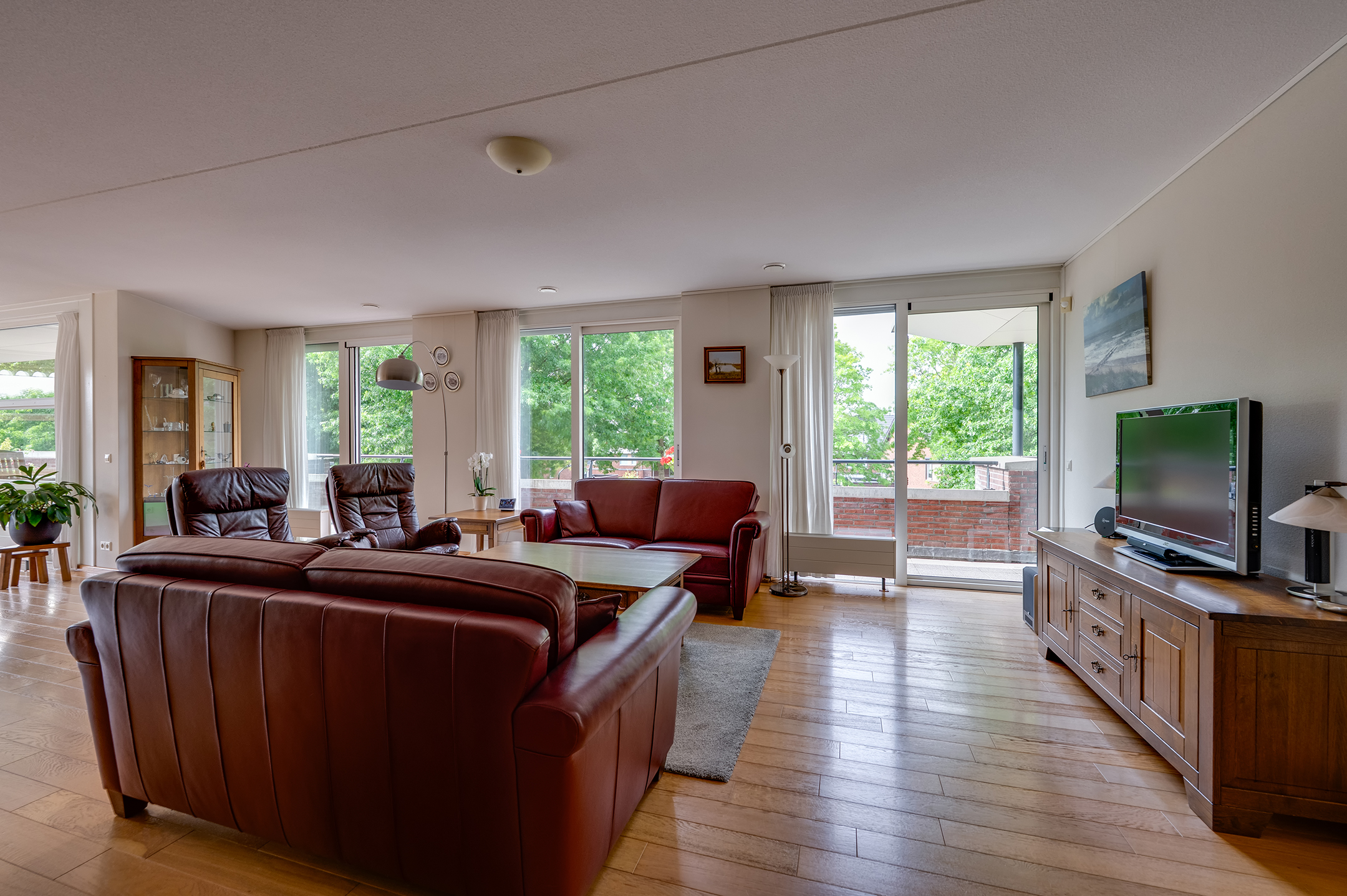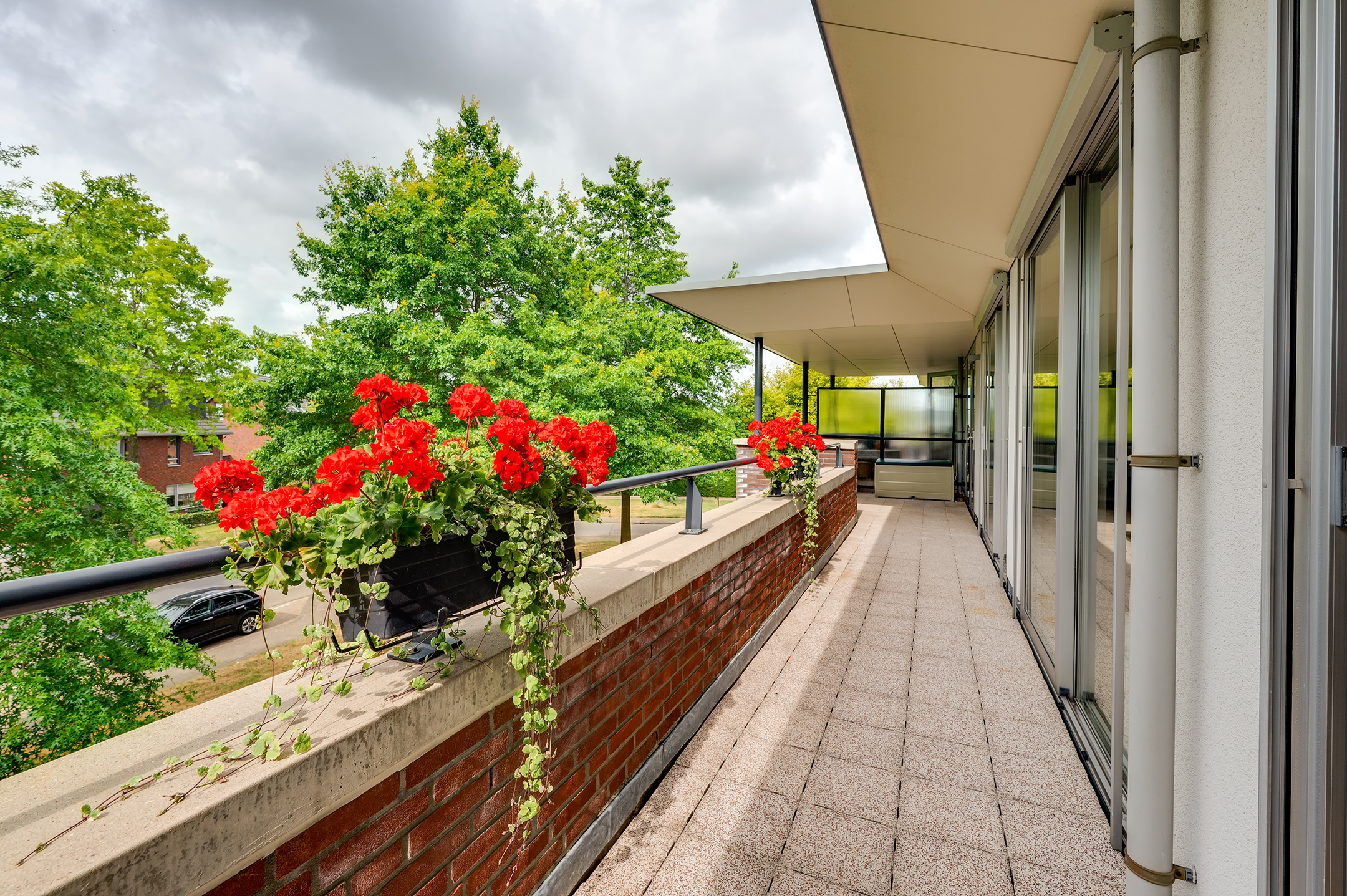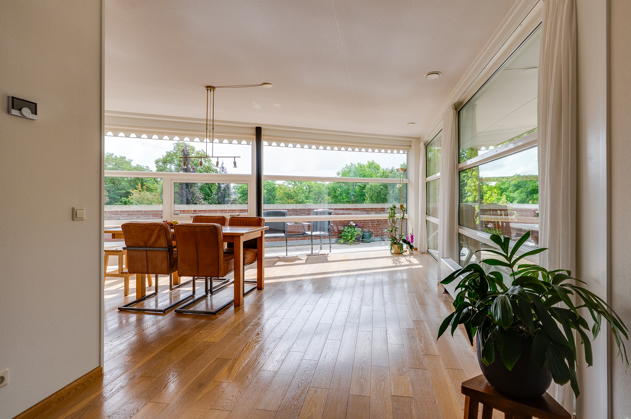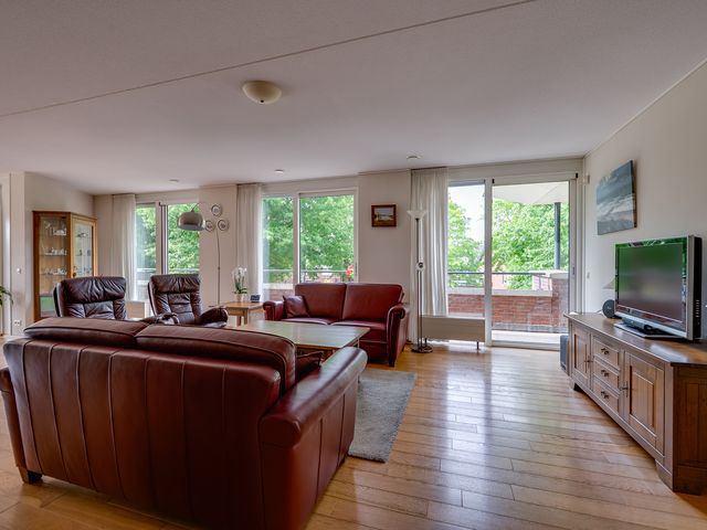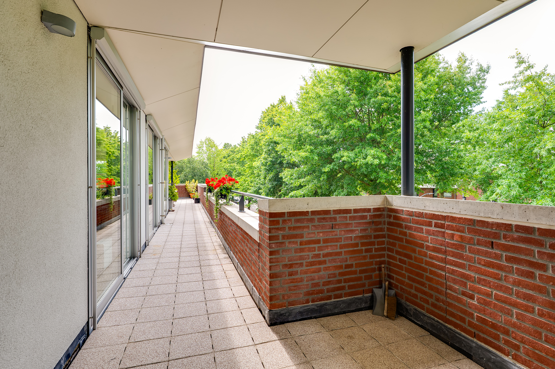 Het balkon loopt aan twee kanten langs het penthouse, waardoor je altijd een fijn plekje hebt in de zon of schaduw. Er is ruimte genoeg voor een tuinset en meerdere gezellige zitjes.