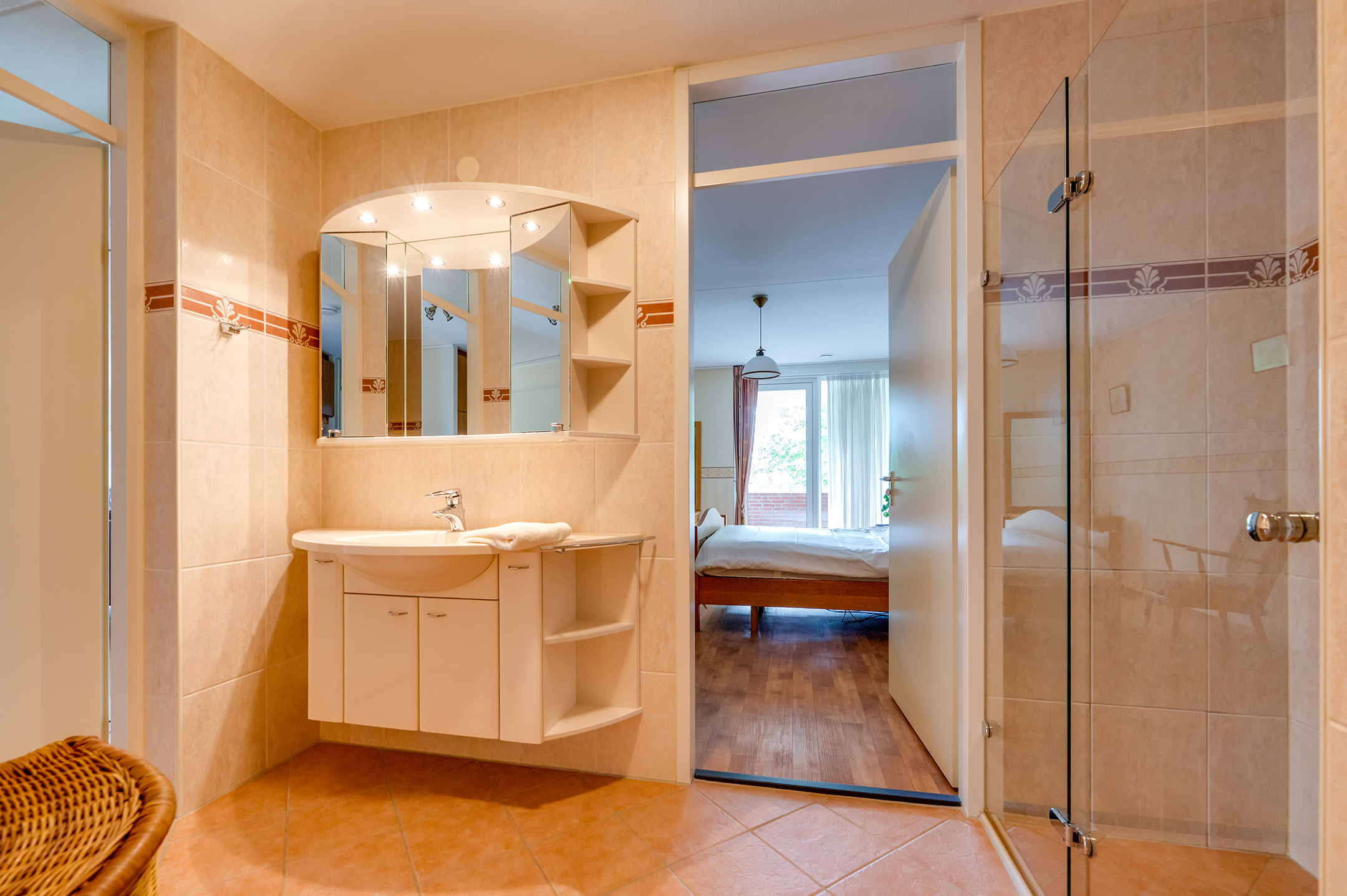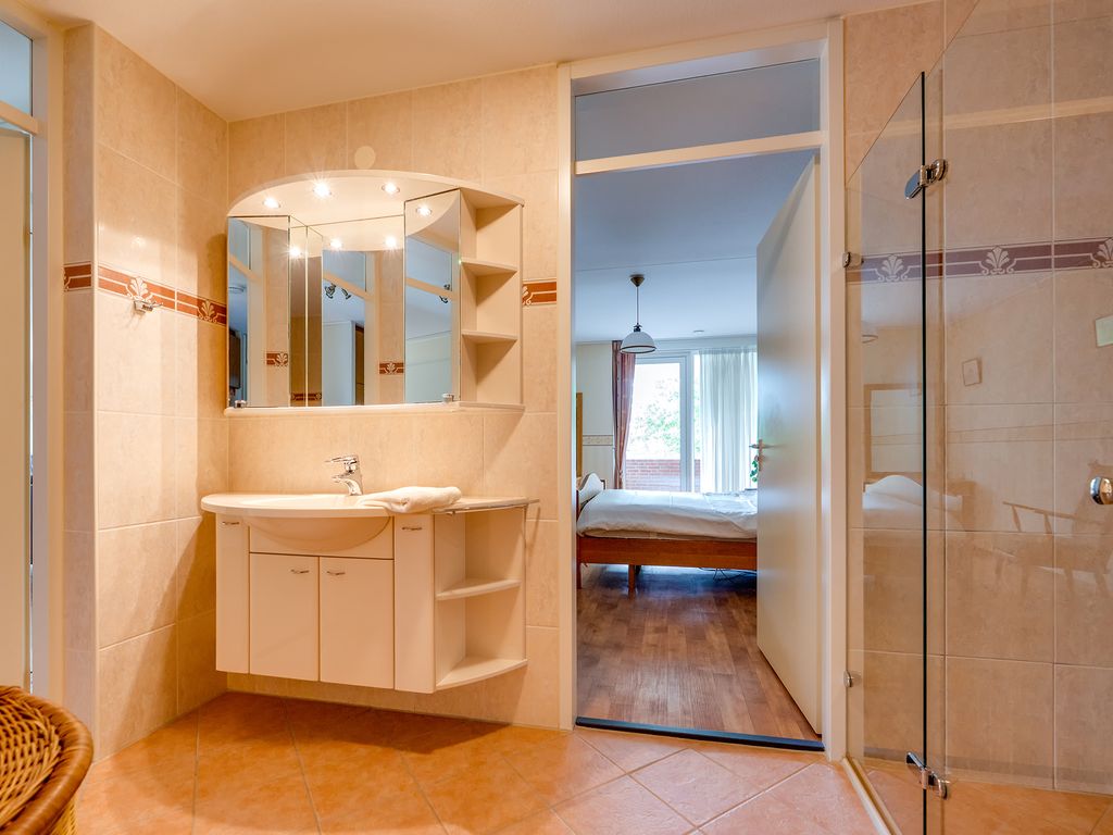 De badkamer is compleet uitgerust met een ligbad, douche, wastafelmeubel, toilet en handdoekradiator.