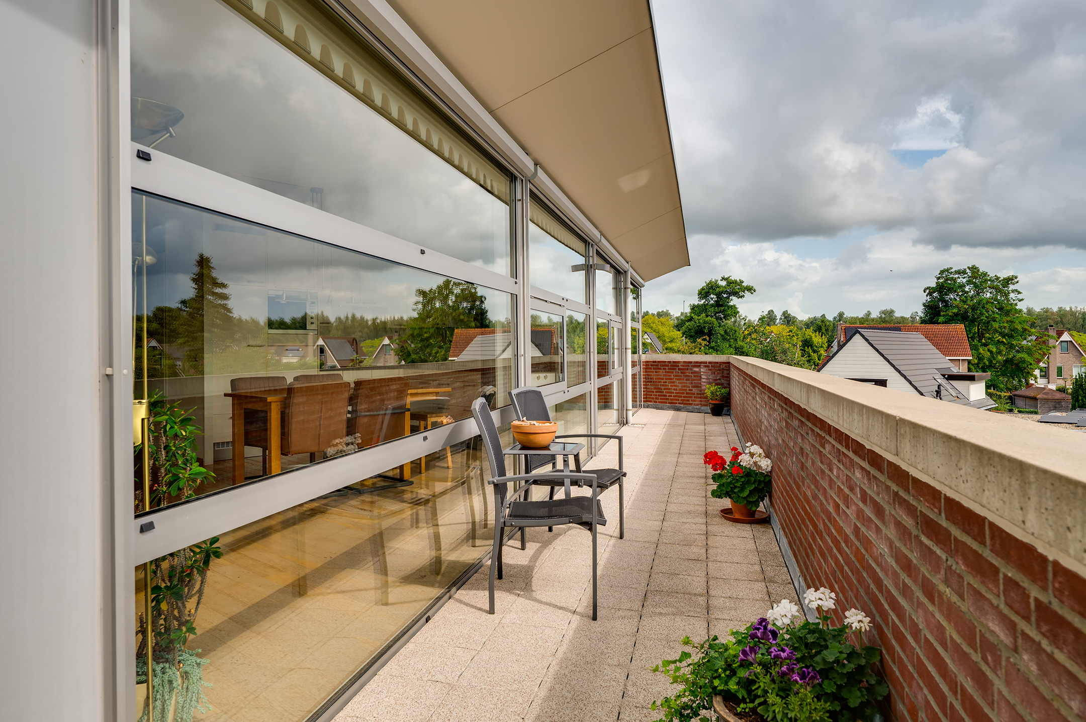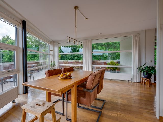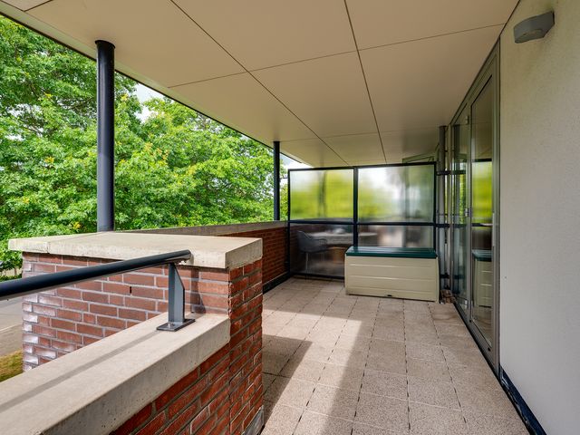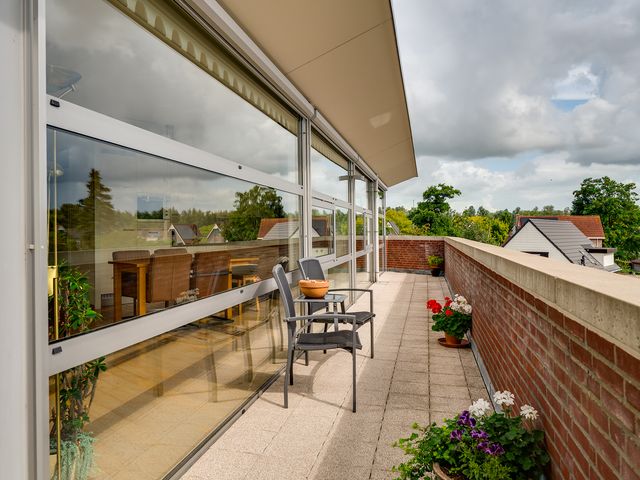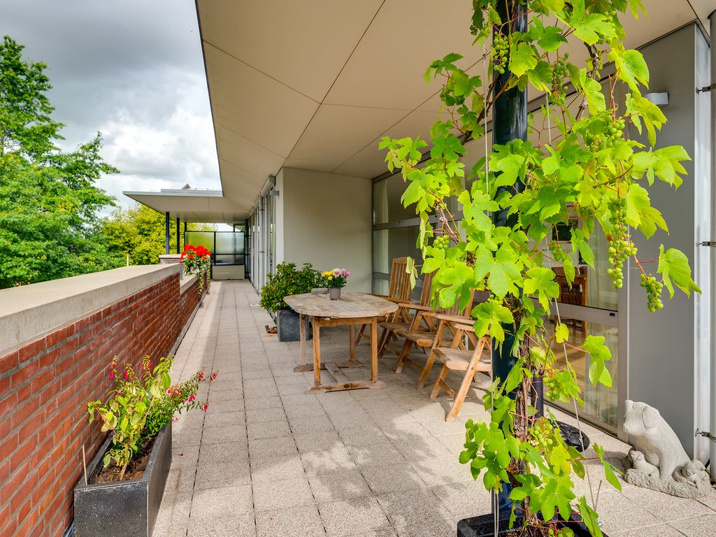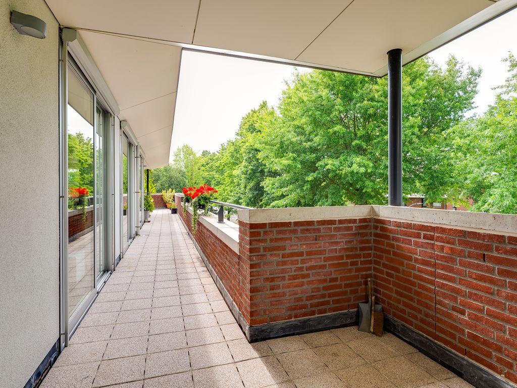 Het rondom gelegen balkon biedt volop ruimte voor meerdere zitplekken en een grote tuinset. Of je nu de zon opzoekt of juist verkoeling in de schaduw, hier vind je altijd een prettige plek buiten.