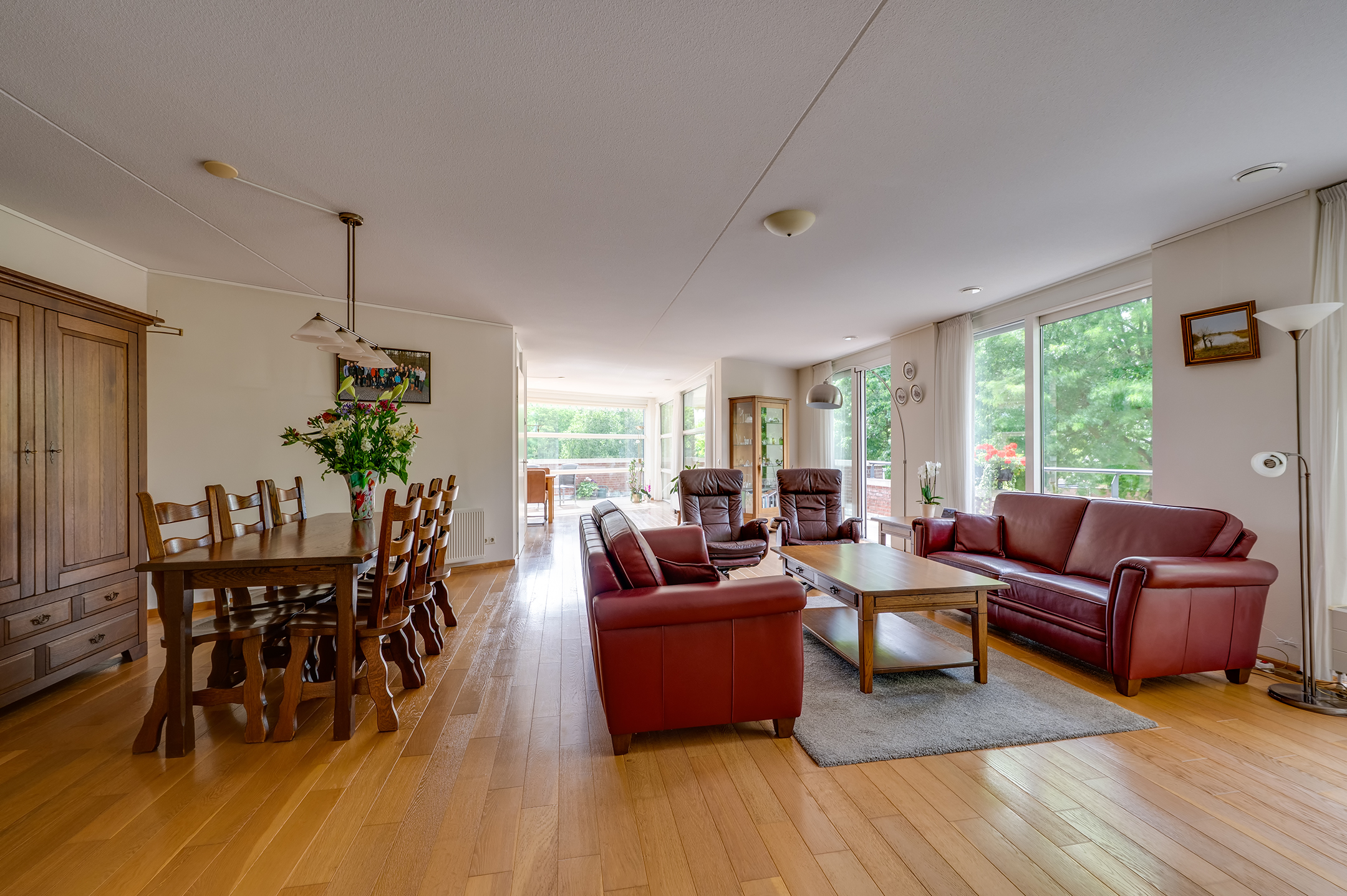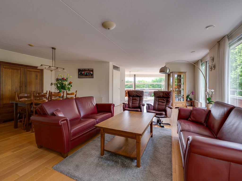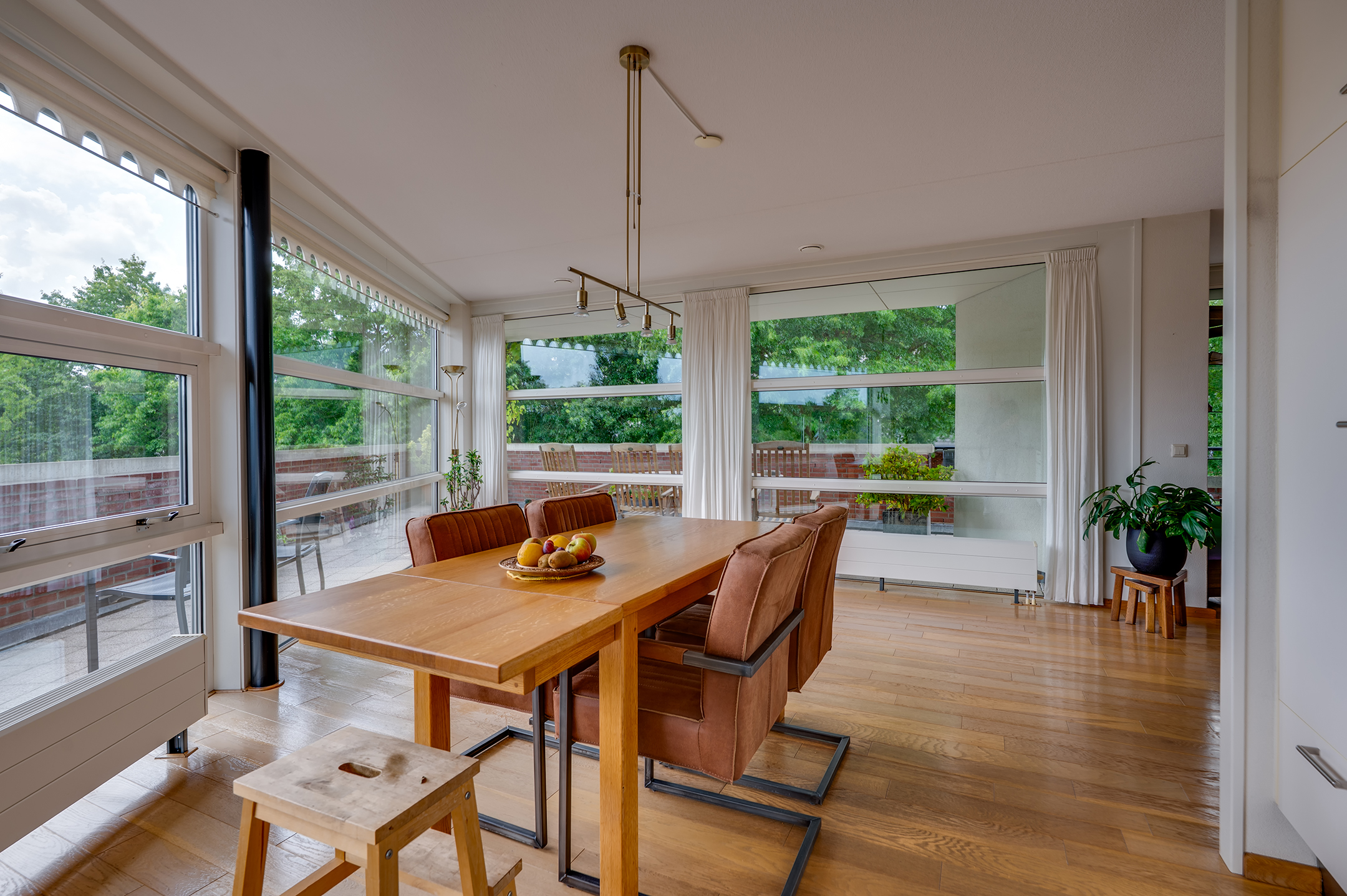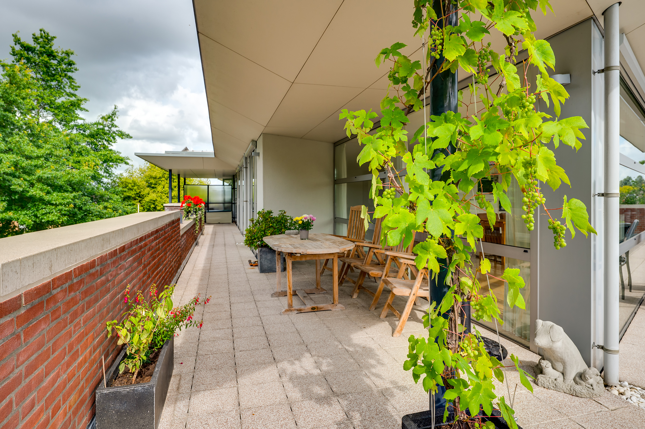 Het rondom gelegen balkon biedt volop ruimte voor meerdere zitplekken en een grote tuinset. Of je nu de zon opzoekt of juist verkoeling in de schaduw, hier vind je altijd een prettige plek buiten.