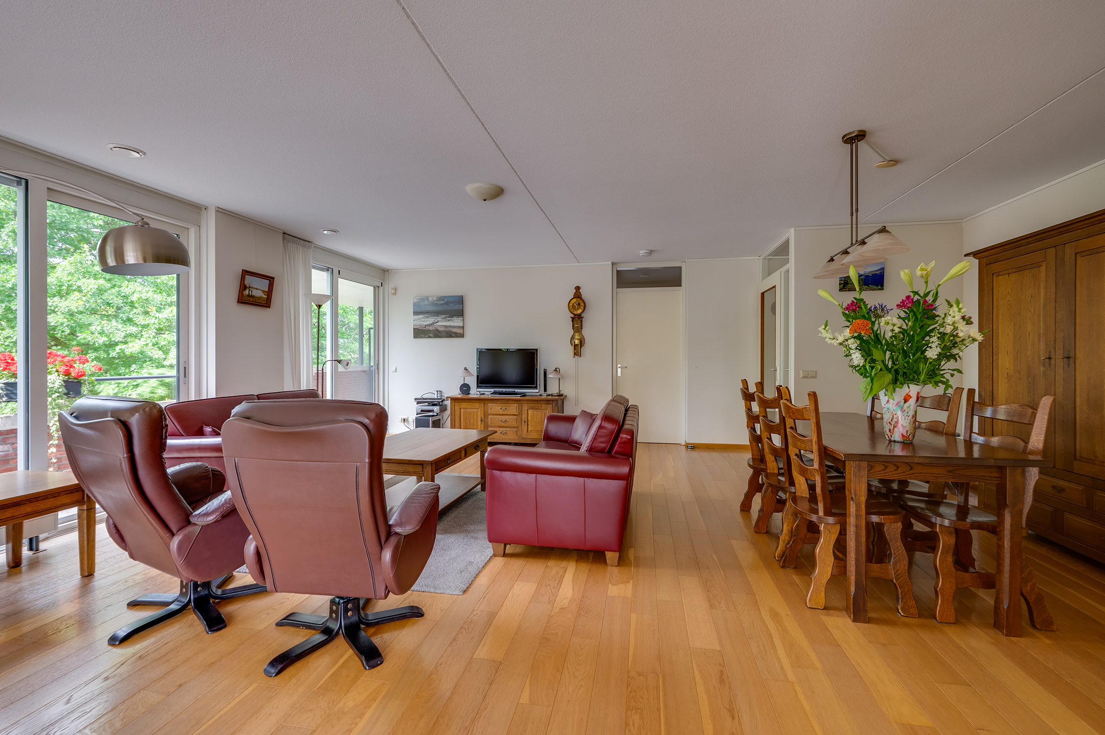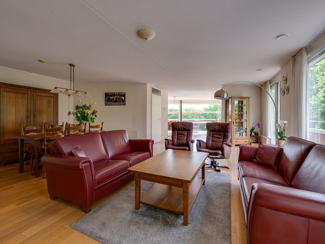 De woonkamer met aangrenzende eetkamer vormt het hart van de woning en biedt volop leefruimte. Hier geniet je van een fijne lichtinval en een open sfeer. Via de schuifpuien stap je zo het riante balkon op, dat zich rondom het penthouse uitstrekt – een heerlijke plek voor lange zomeravonden of een rustig kopje koffie in de ochtendzon.