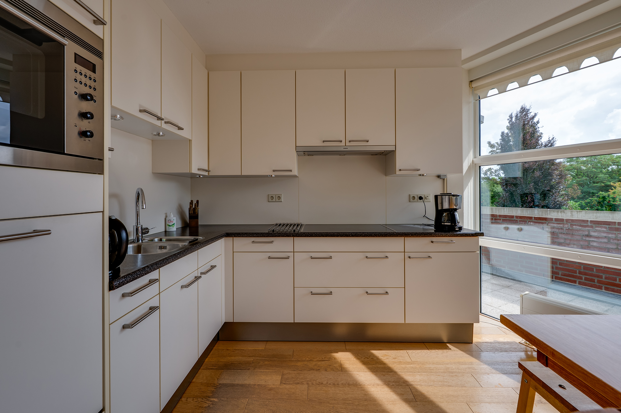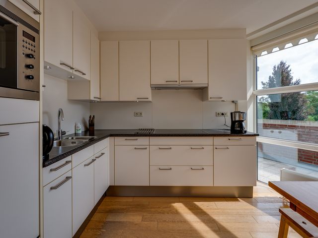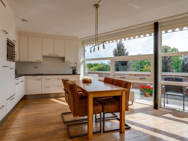 De open keuken sluit perfect aan op de eetkamer en is van alle gemakken voorzien, waaronder een koelkast, combi-oven, vaatwasser, inductiekookplaat, afzuigkap, 1,5 spoelbak en praktische opbergruimte zoals een carrouselkast. Ideaal voor kookliefhebbers en gezellige diners.