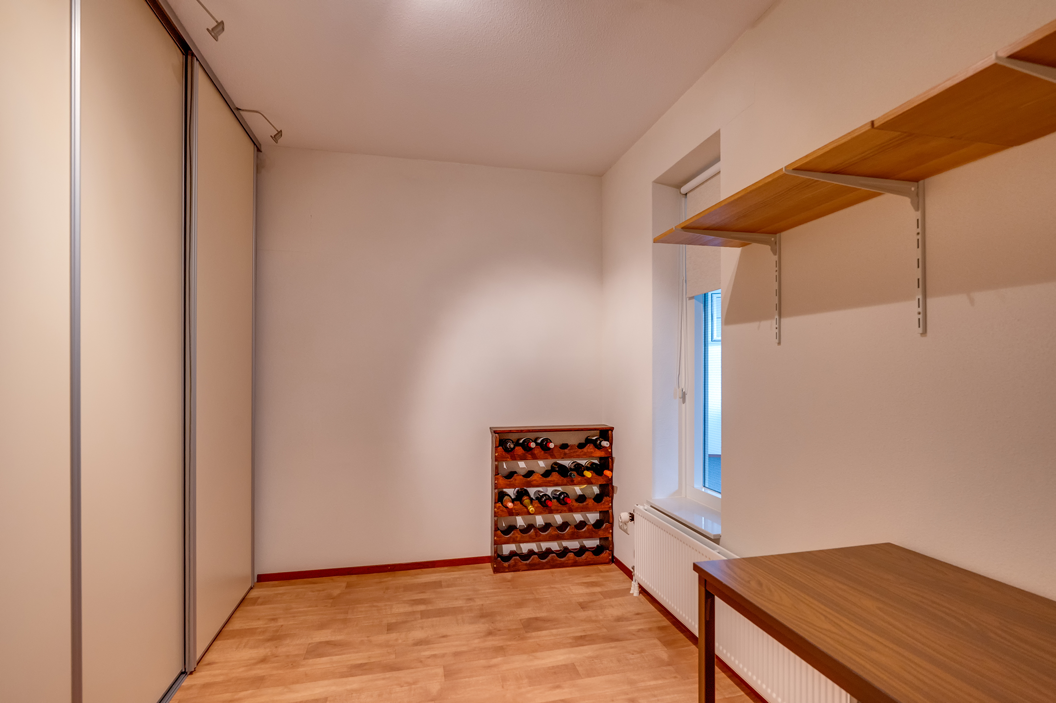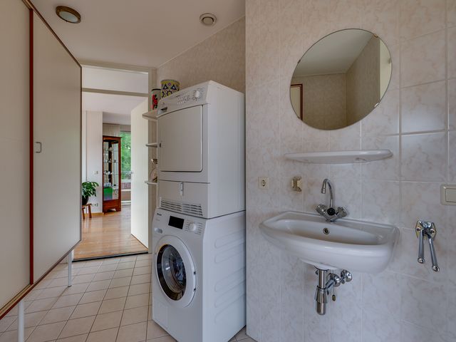 Aangrenzend bevindt zich de praktische bijkeuken met aansluitingen voor wasapparatuur en een extra wastafel.