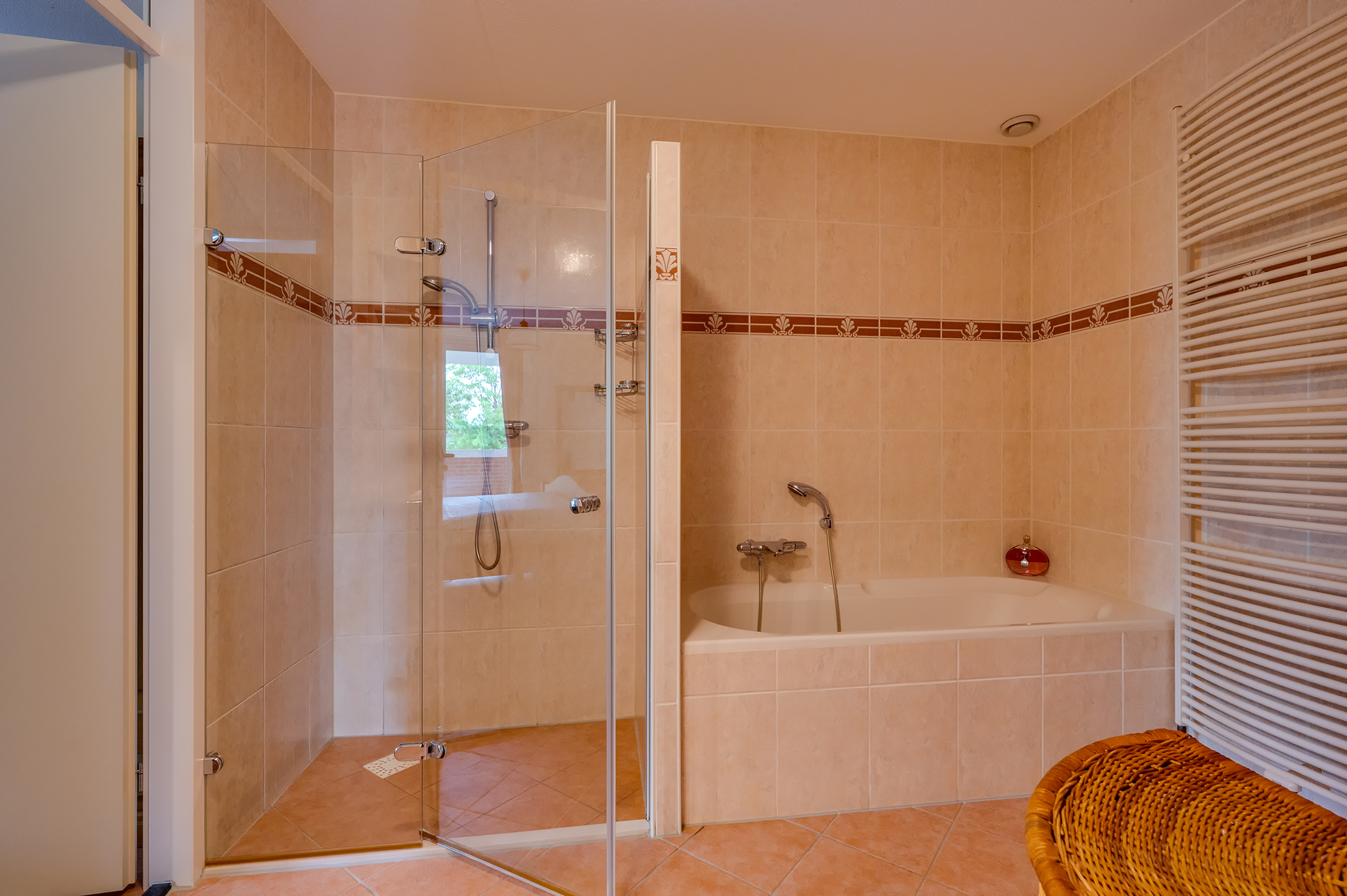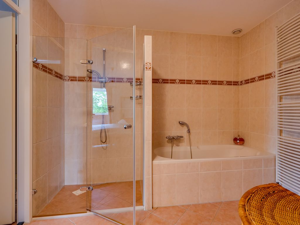 De complete badkamer is uitgerust met een ligbad, separate douche, wastafelmeubel, toilet en handdoekradiator – een fijne plek om te ontspannen.