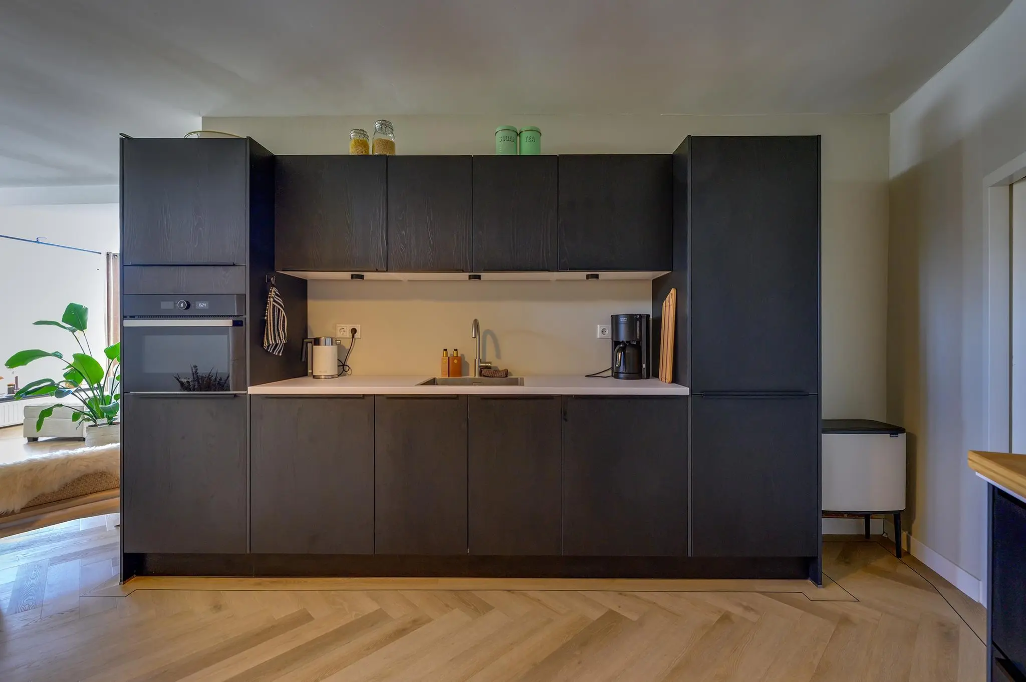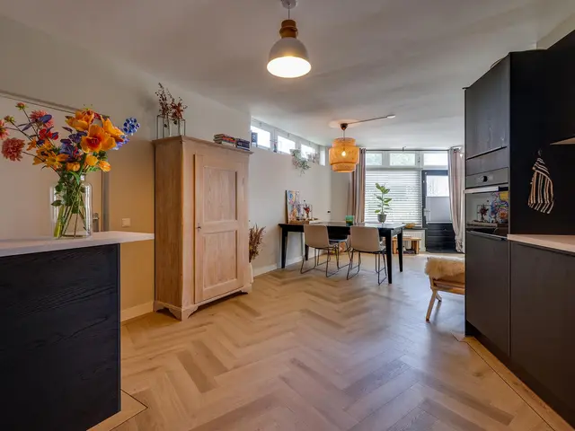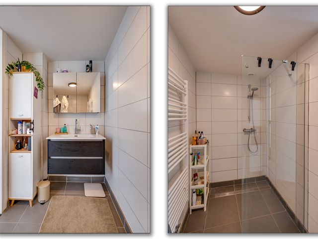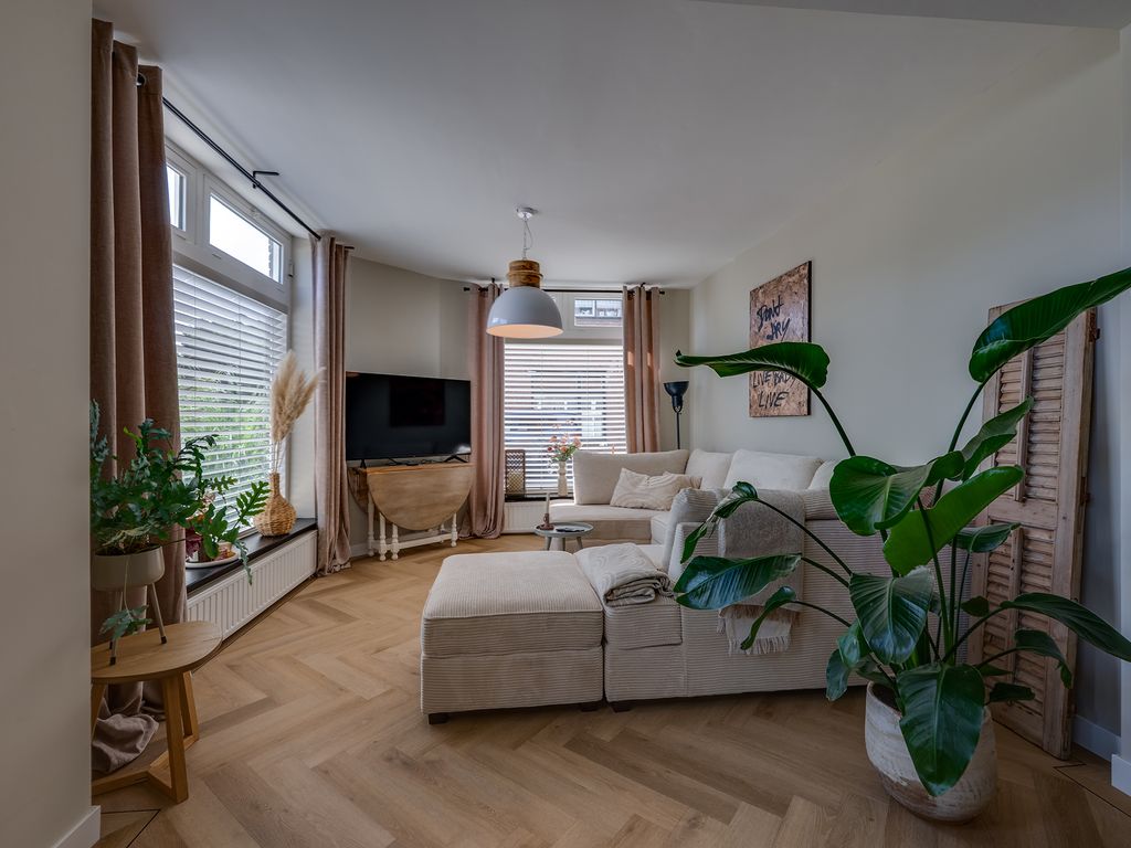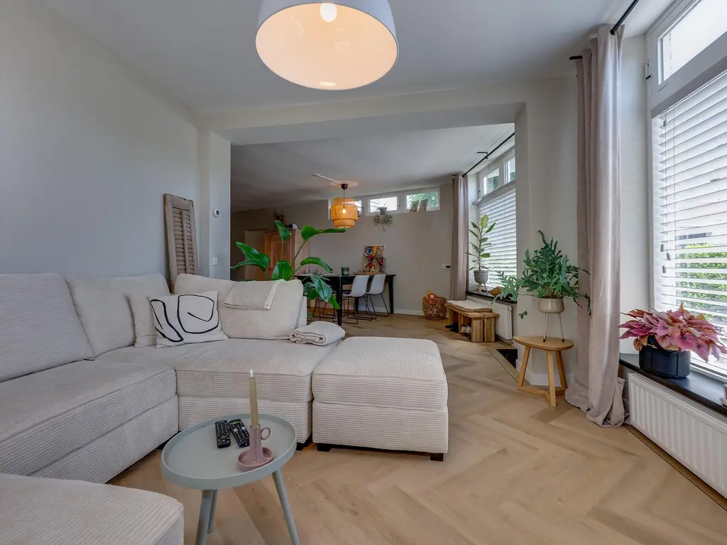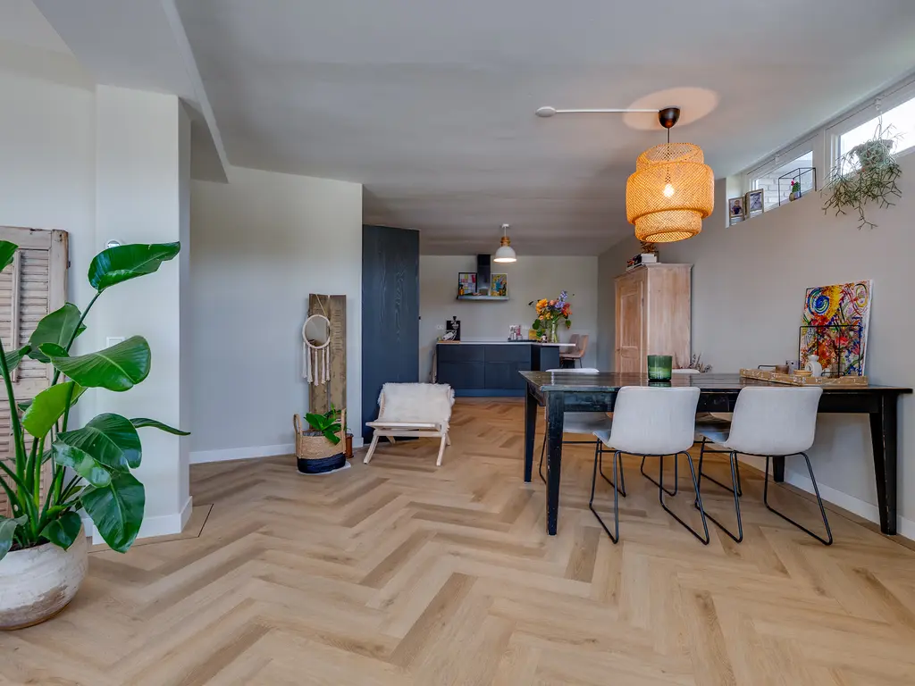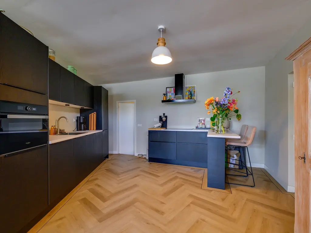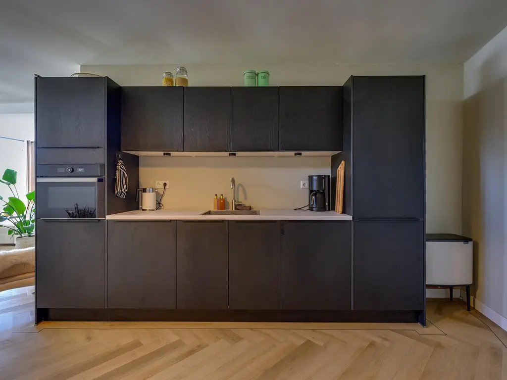 De woonkamer voelt ruim en toch knus dankzij de speelse hoek, ideaal voor een gezellige zit- én eethoek. De keuken heeft twee praktische keukenblokken en biedt toegang tot een extra berging met witgoedaansluiting. De keuken is voorzien van een combi-oven, spoelbak, vaatwasser, inductiekookplaat, en een recirculatie afzuigkap.