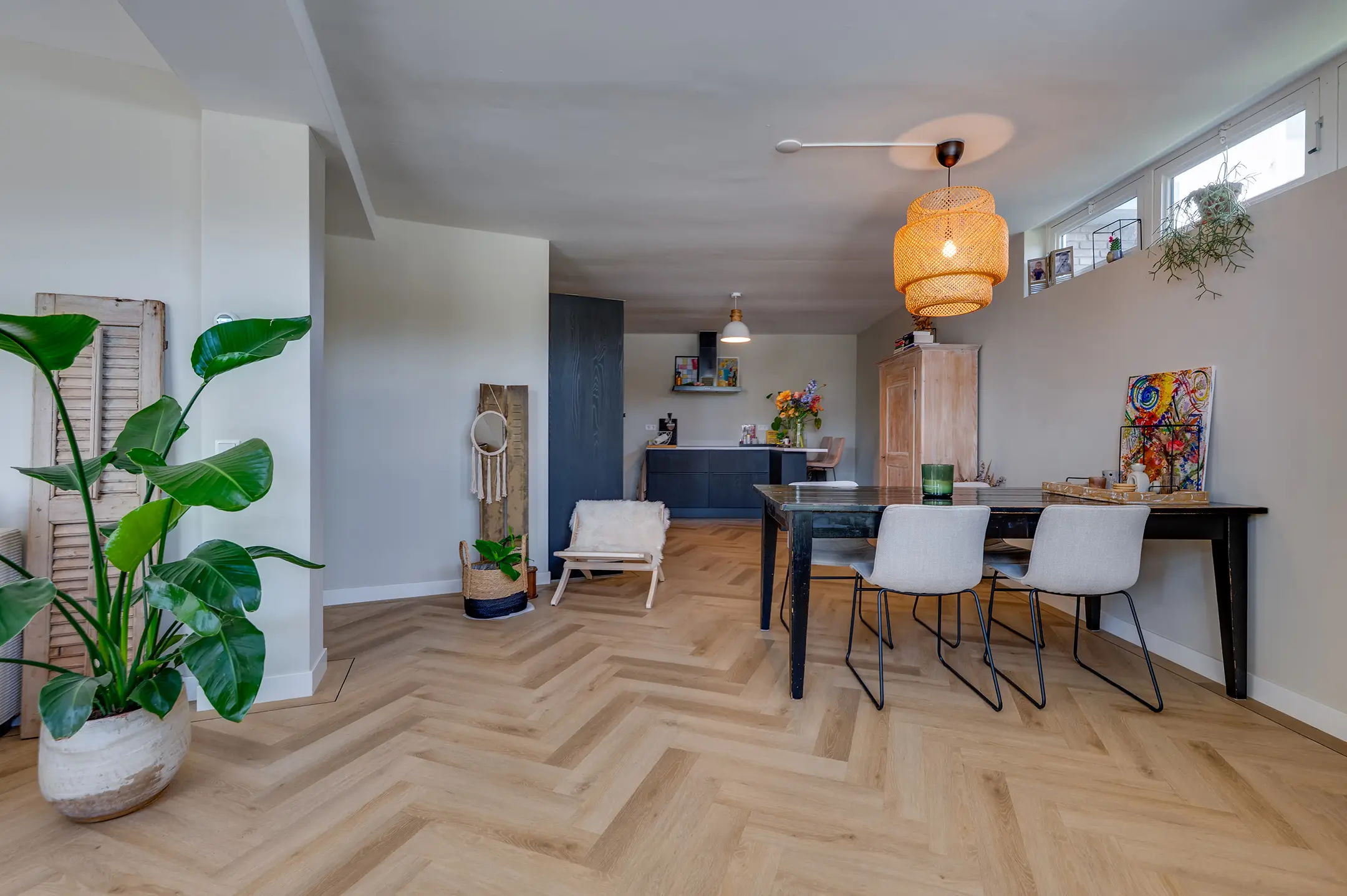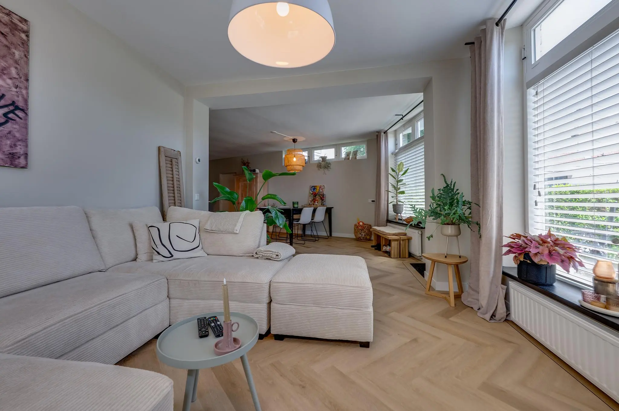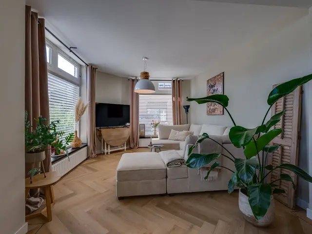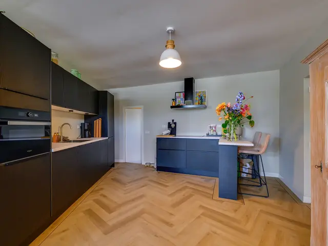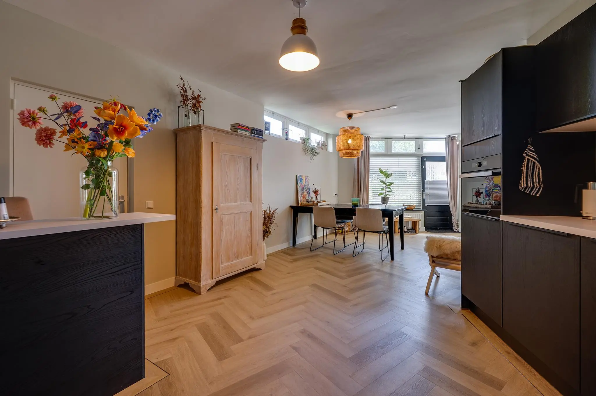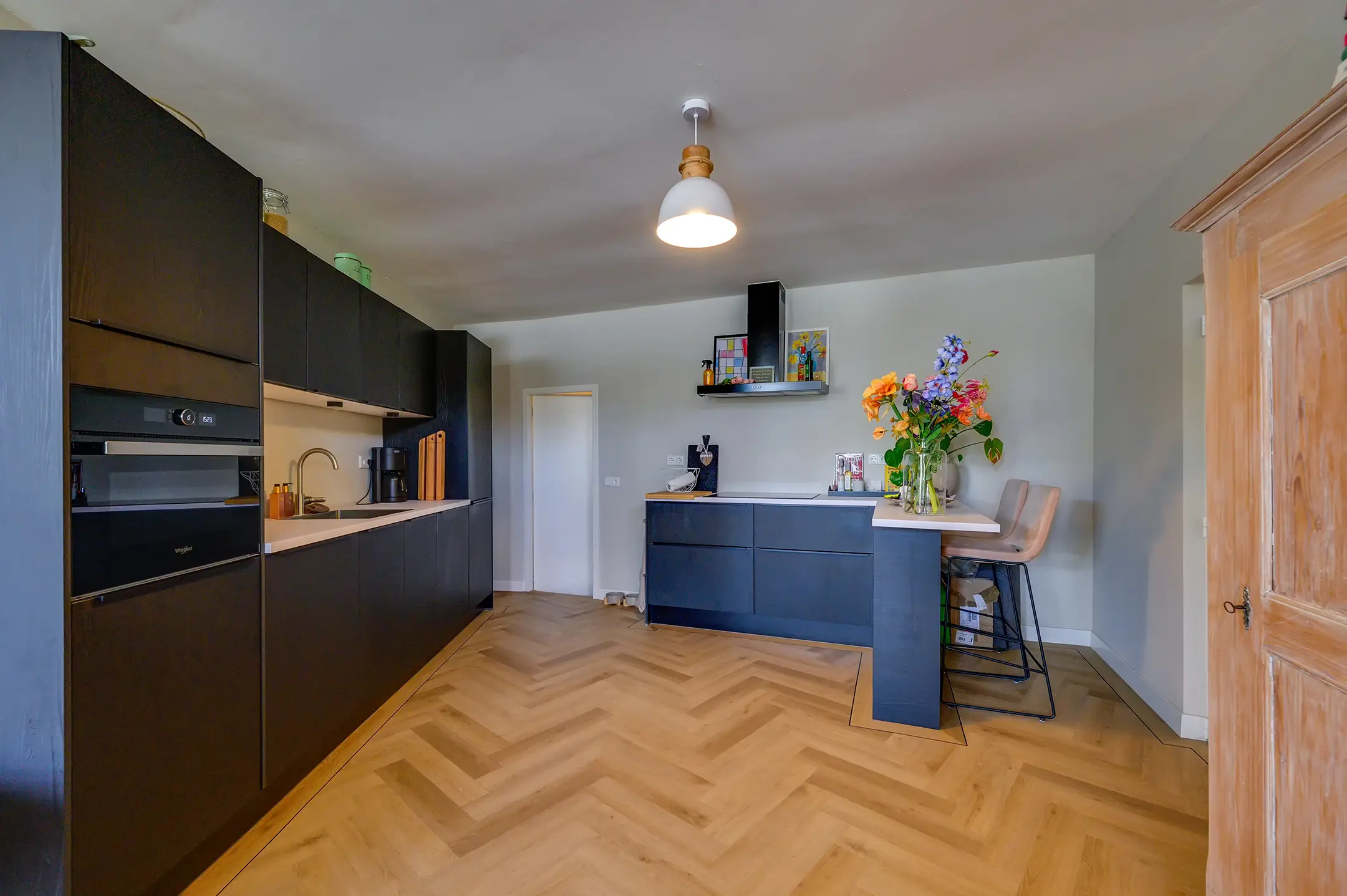 De woonkamer voelt ruim en toch knus dankzij de speelse hoek, ideaal voor een gezellige zit- én eethoek. De keuken heeft twee praktische keukenblokken en biedt toegang tot een extra berging met witgoedaansluiting. De keuken is voorzien van een combi-oven, spoelbak, vaatwasser, inductiekookplaat, en een recirculatie afzuigkap.