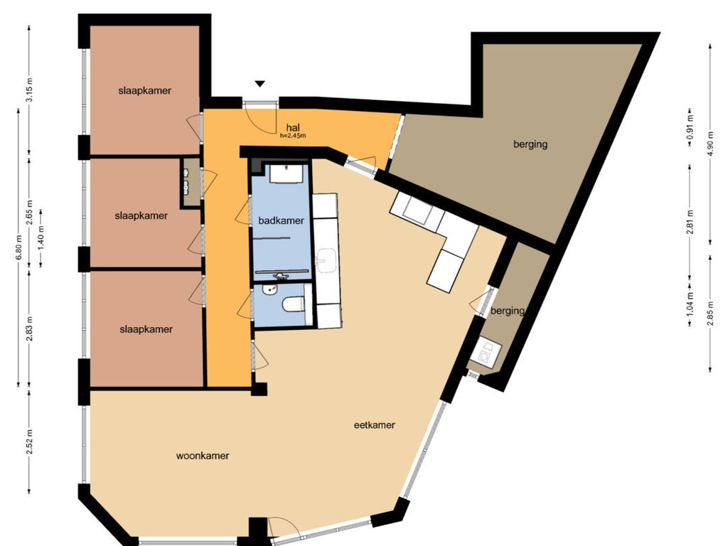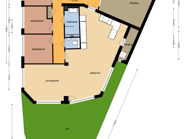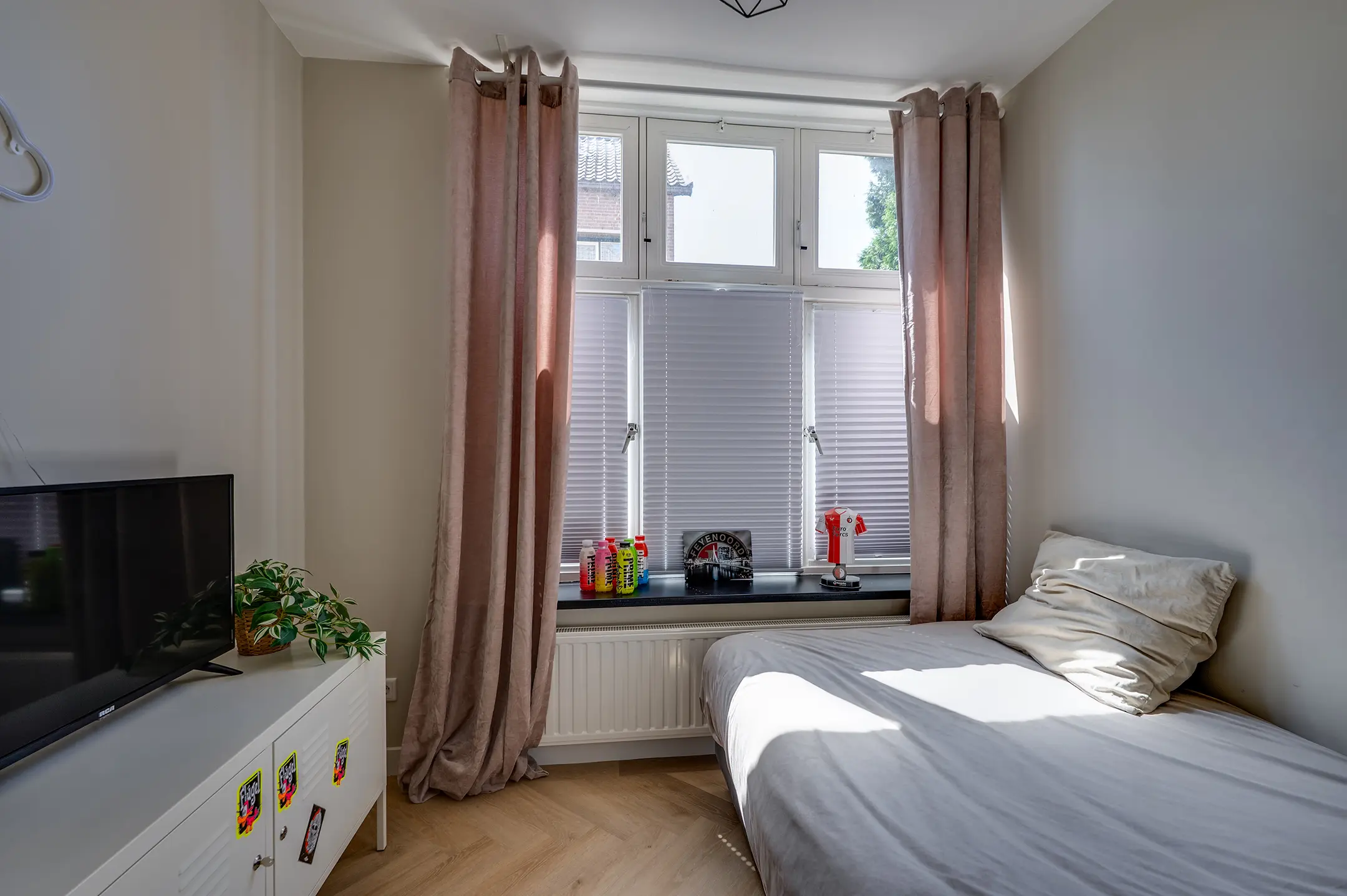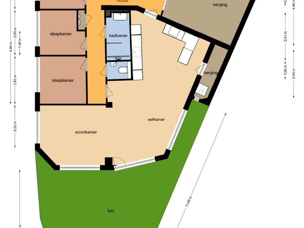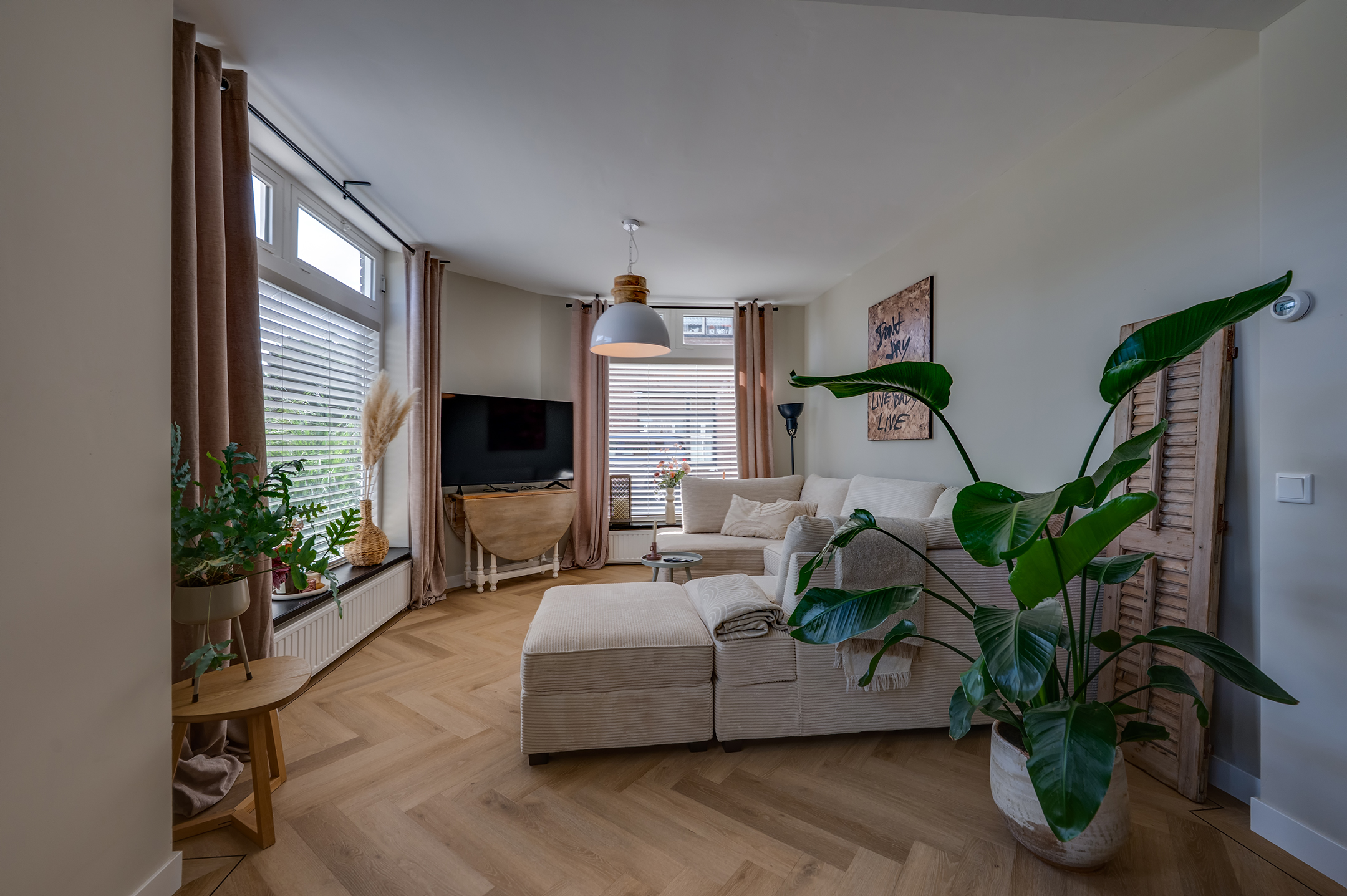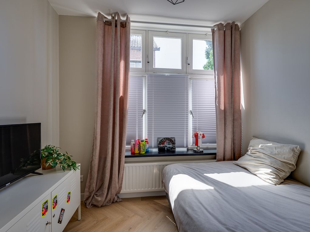 De woonkamer voelt ruim en toch knus dankzij de speelse hoek, ideaal voor een gezellige zit- én eethoek. De keuken heeft twee praktische keukenblokken en biedt toegang tot een extra berging met witgoedaansluiting. De keuken is voorzien van een combi-oven, spoelbak, vaatwasser, inductiekookplaat, en een recirculatie afzuigkap.