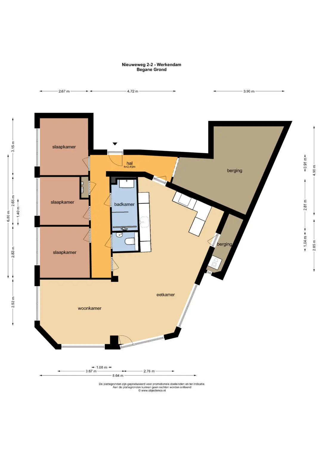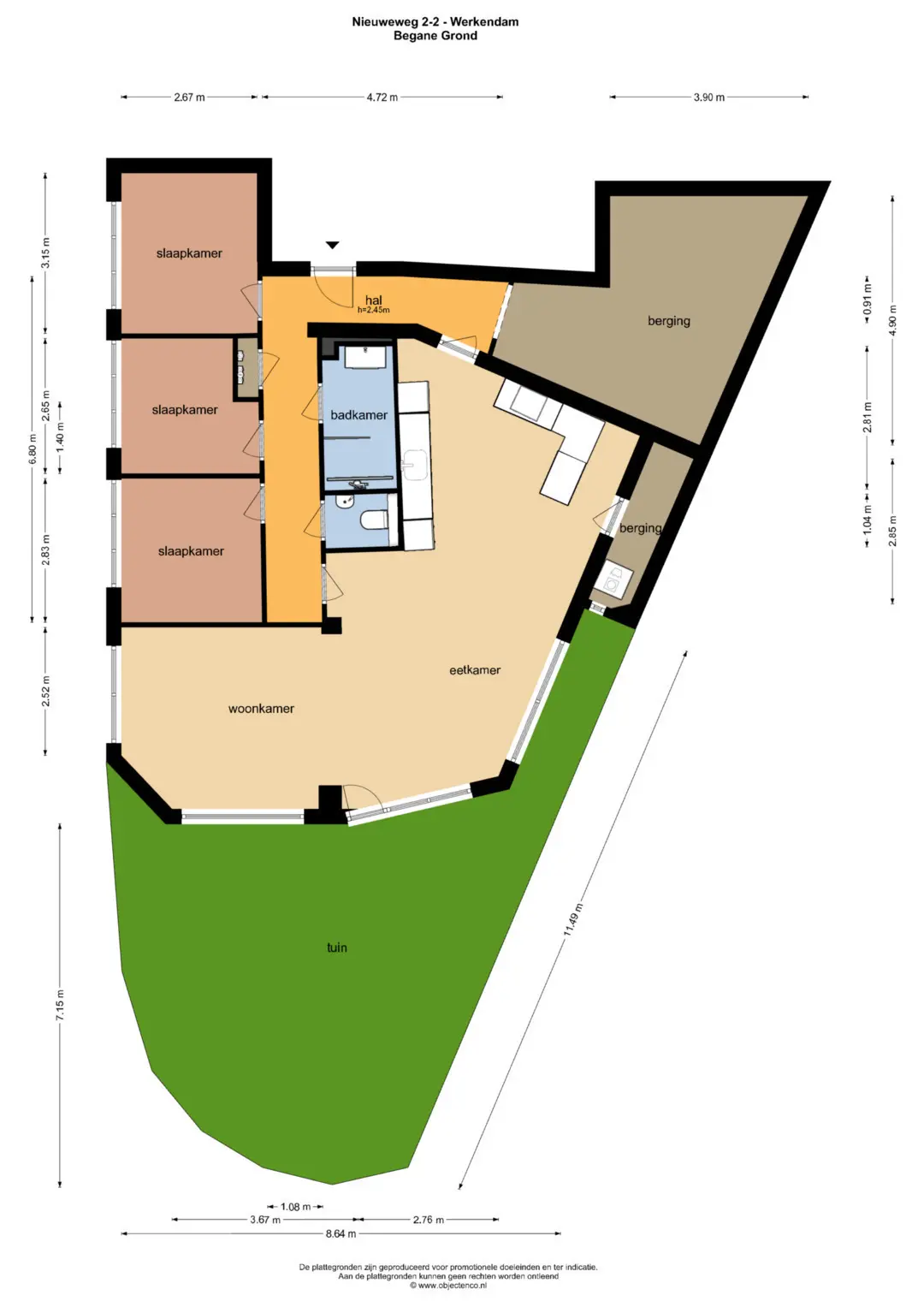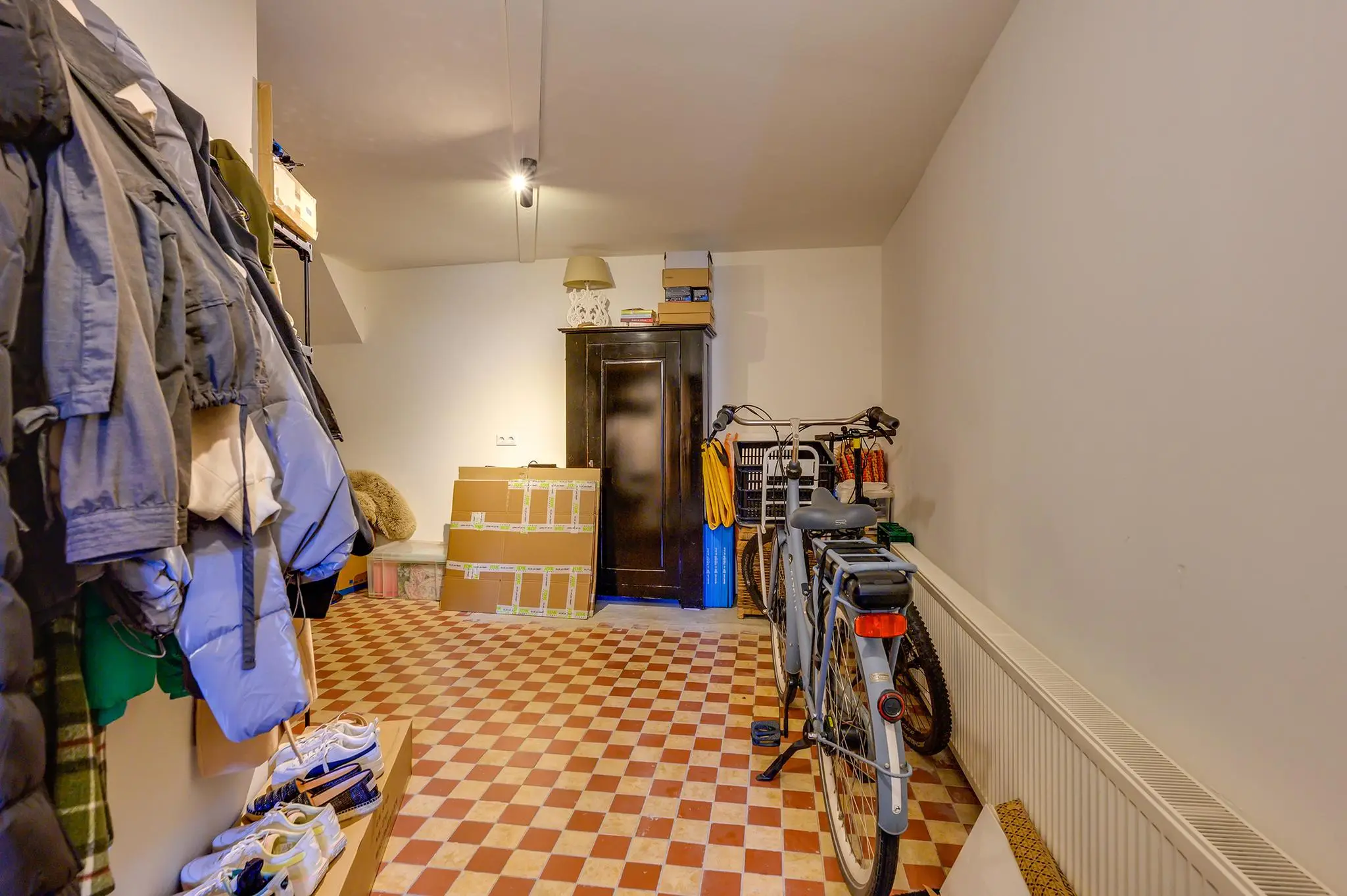 Je komt binnen in een royale hal die toegang geeft tot alle vertrekken. Aan de rechterkant vind je een handige berging voor de fietsen en extra spullen. Links loop je door de gang naar drie fijne slaapkamers, een nette badkamer met douche, wastafelmeubel en een handdoekradiator, een apart toilet en de woonkamer.