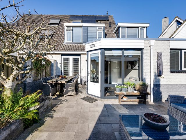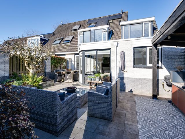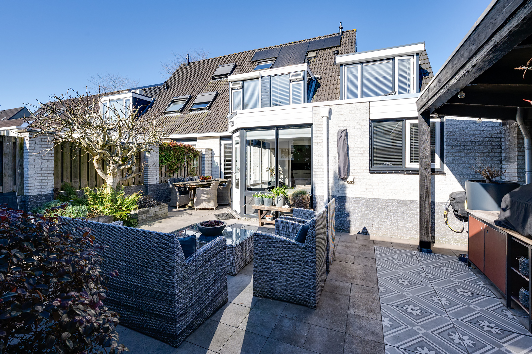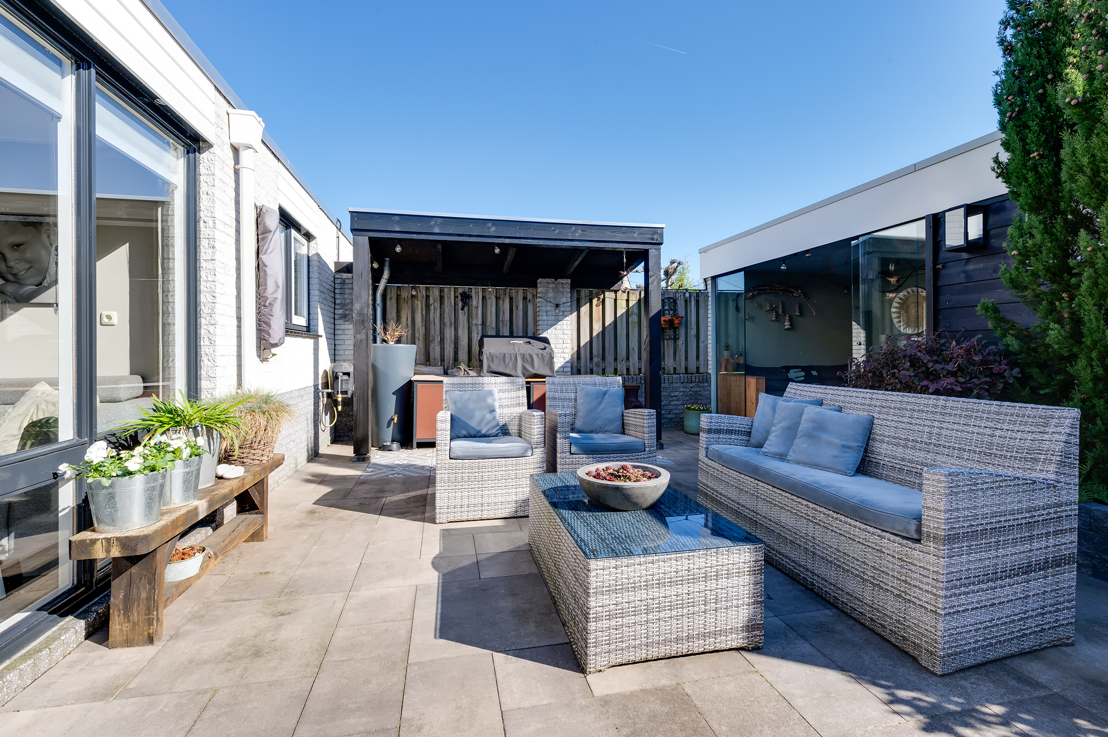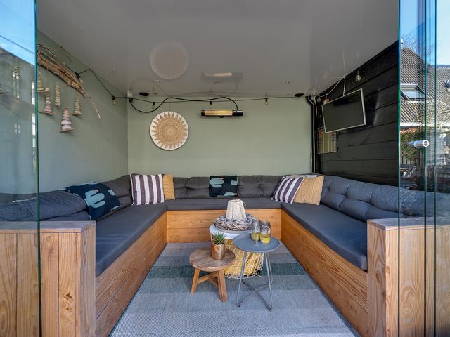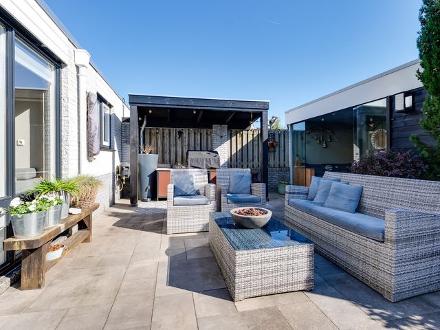 Via de openslaande deuren komt u in de fraai aangelegde tuin, welke gelegen is op het zuidoosten. Er is een terras voor bijvoorbeeld een eettafel, maar verderop in de tuin is ook nog voldoende ruimte voor een grote loungeset. Onder de overkapping kunt u bijvoorbeeld uw barbecue kwijt. Verder is er een grote veranda met glazen schuifdeuren, zodat u ook met minder mooi weer lekker in uw tuin kunt zitten. Naast de veranda is ook nog een houten schuur. De tuin is voorzien van sierbestrating en een groene border. De erfafscheiding is deels van steen en deels van hout. Al met al een heerlijke buitenruimte, volledig in dezelfde stijl als de rest van het huis.