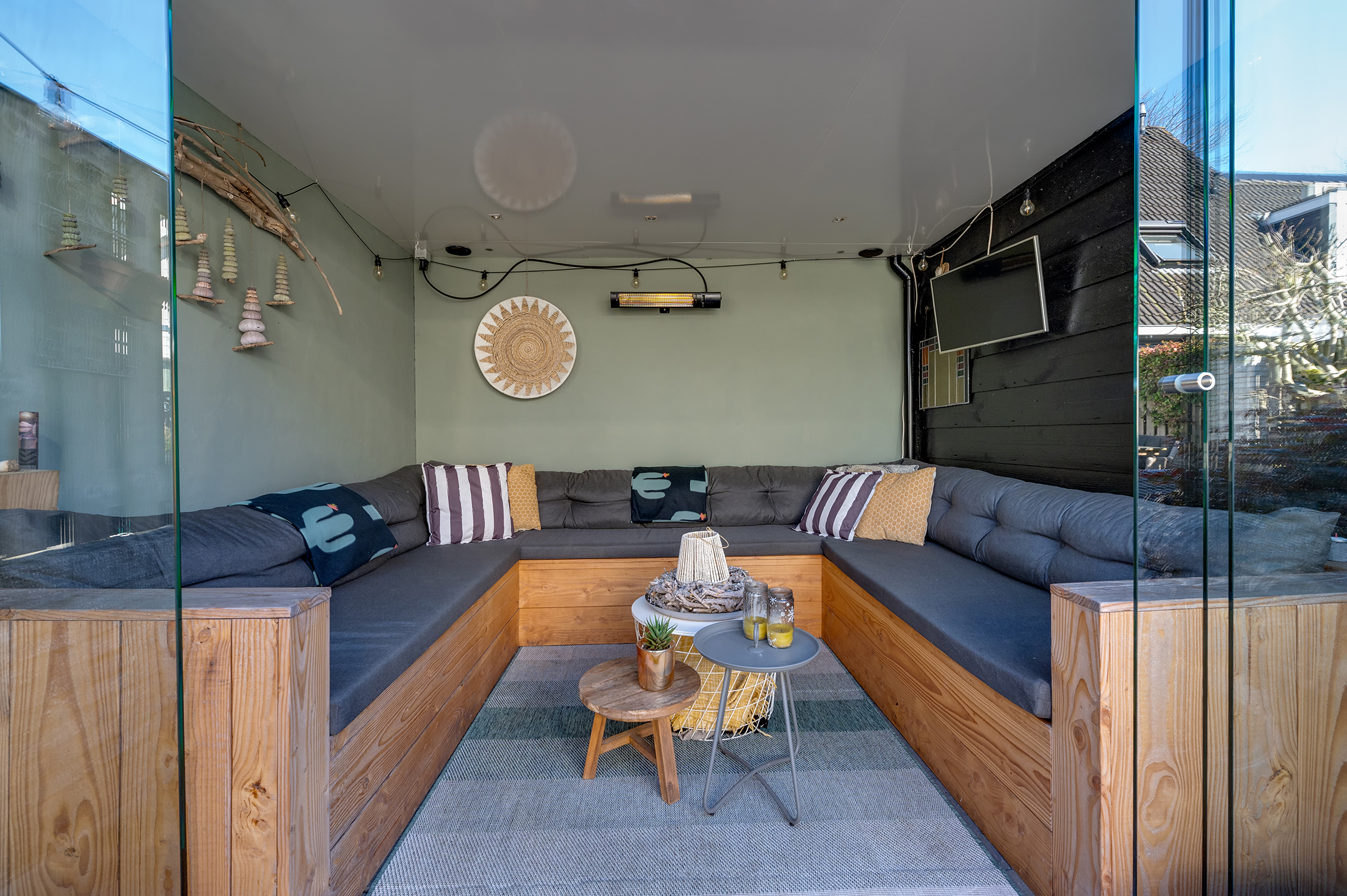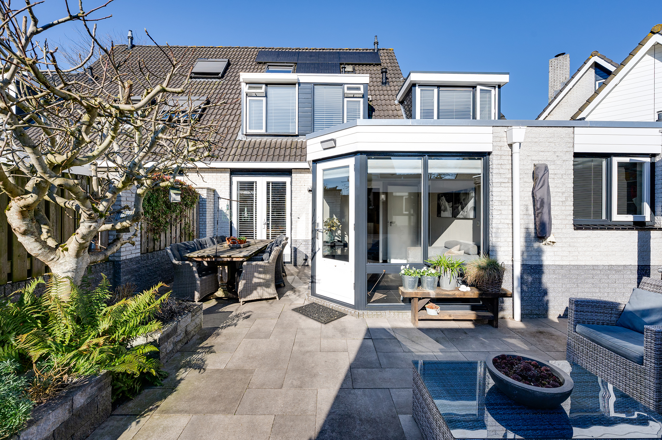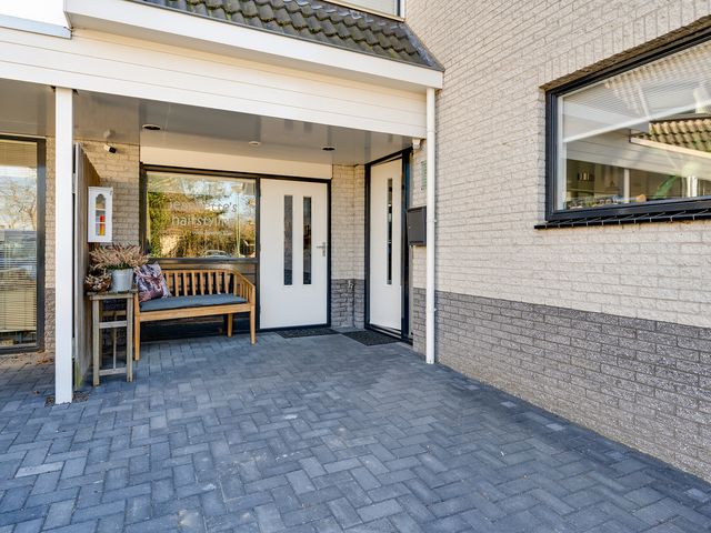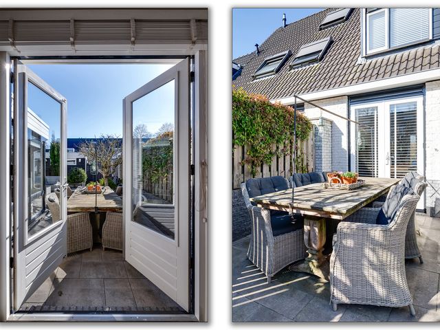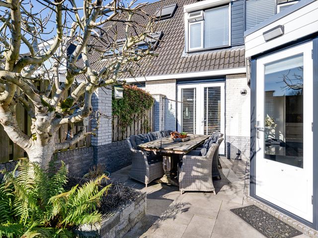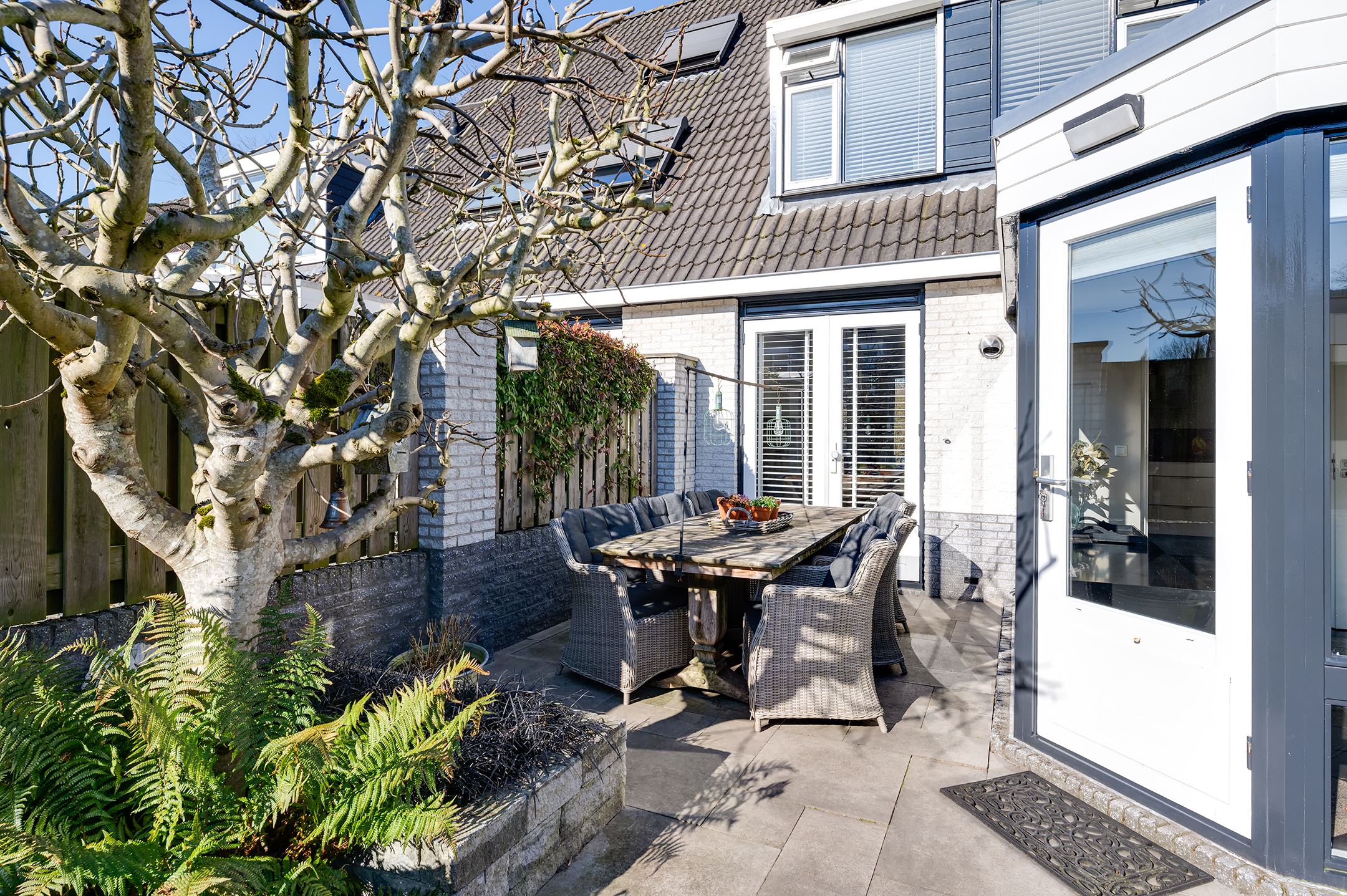 Via de openslaande deuren komt u in de fraai aangelegde tuin, welke gelegen is op het zuidoosten. Er is een terras voor bijvoorbeeld een eettafel, maar verderop in de tuin is ook nog voldoende ruimte voor een grote loungeset. Onder de overkapping kunt u bijvoorbeeld uw barbecue kwijt. Verder is er een grote veranda met glazen schuifdeuren, zodat u ook met minder mooi weer lekker in uw tuin kunt zitten. Naast de veranda is ook nog een houten schuur. De tuin is voorzien van sierbestrating en een groene border. De erfafscheiding is deels van steen en deels van hout. Al met al een heerlijke buitenruimte, volledig in dezelfde stijl als de rest van het huis.