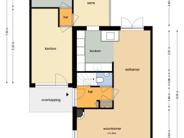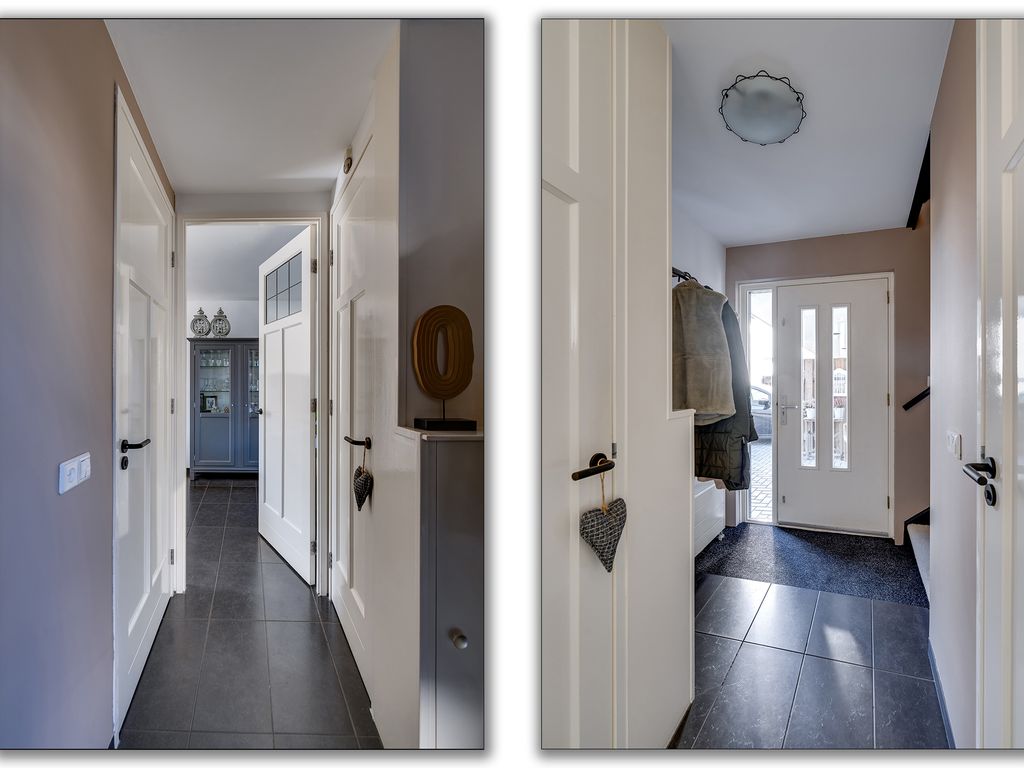 De overdekte entree van de woning bevindt zich aan de zijkant, onder de overkapping. Hier komt u binnen in de hal, waar zich het toilet, de meterkast en de trapopgang naar de verdieping zich bevinden. Ook geeft de hal toegang tot de woonkamer.