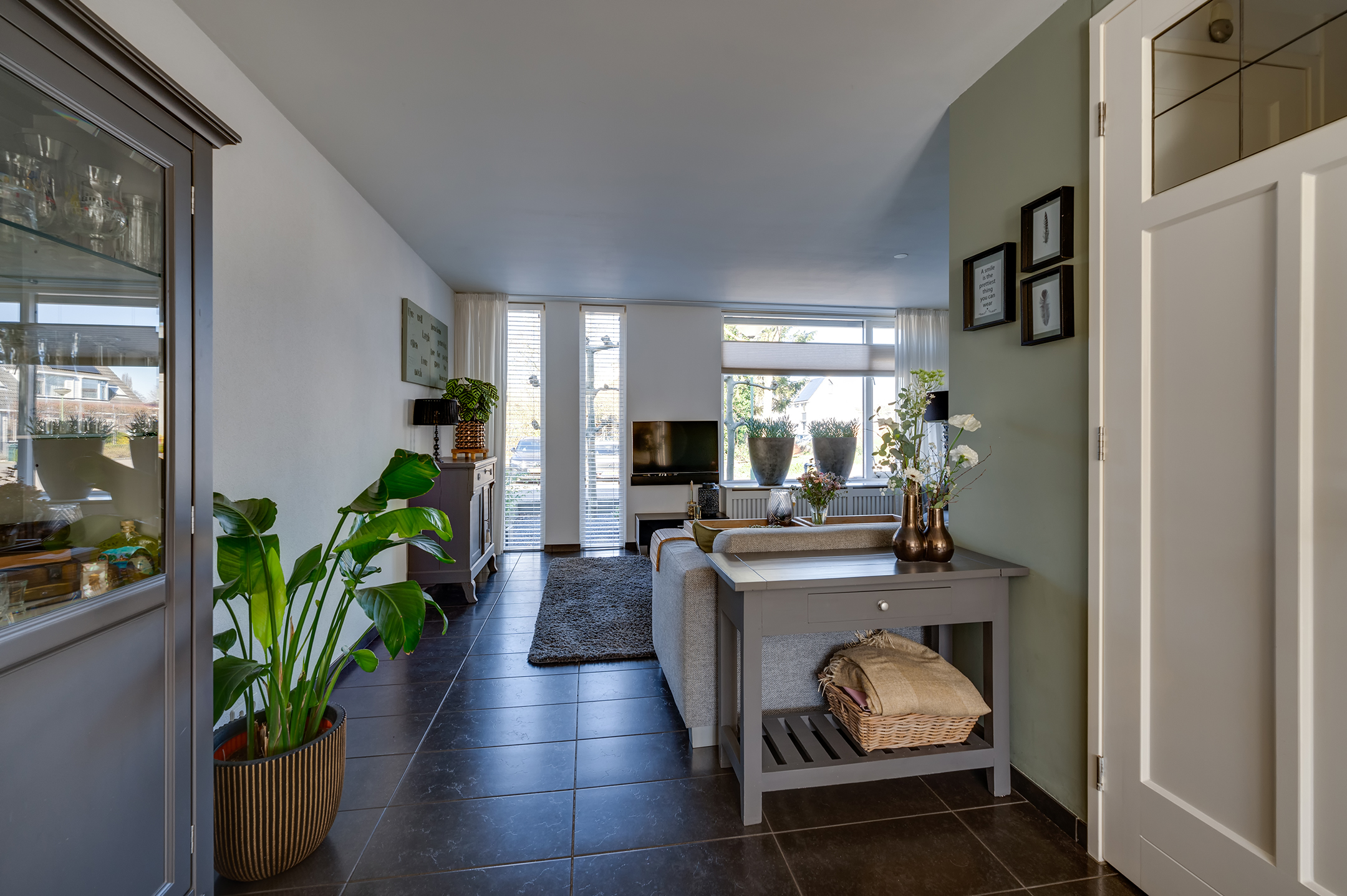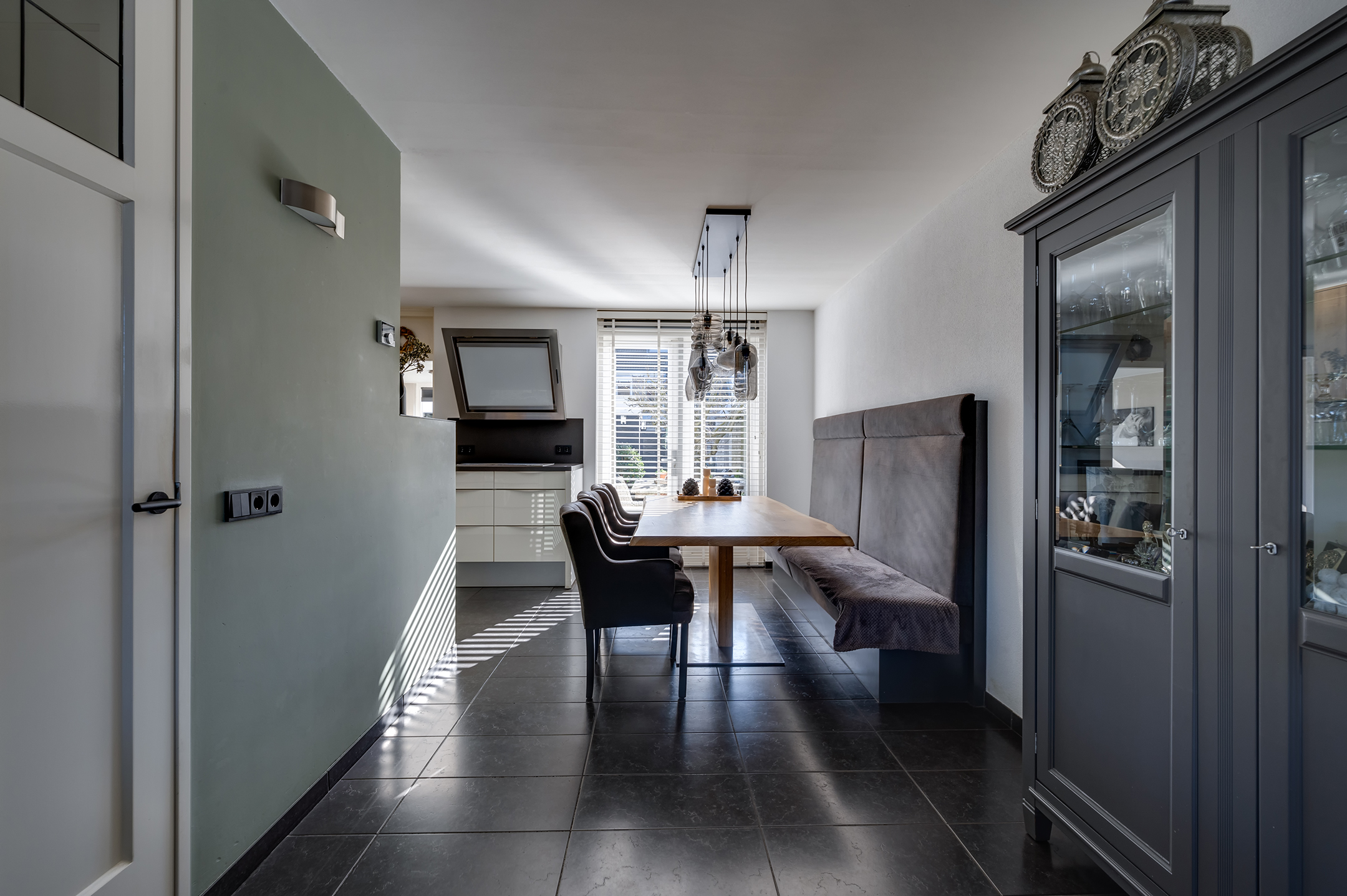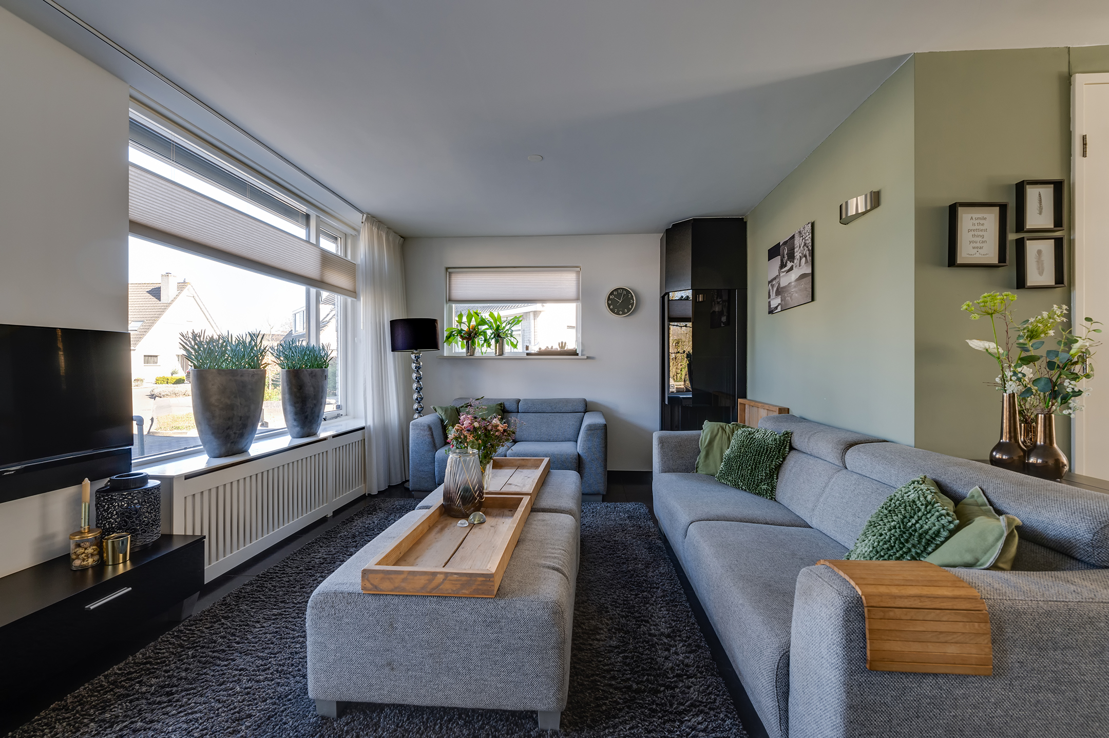 De L-vormige woonkamer is heerlijk licht vanwege de vele raampartijen. Aan de voorzijde bevindt zich het zitgedeelte, voorzien van gashaard. U heeft hiervandaan een leuk uitzicht over de straat. Het eetgedeelte bevindt zich aan de achterzijde. De openslaande deuren geven toegang tot de fraai aangelegde tuin.