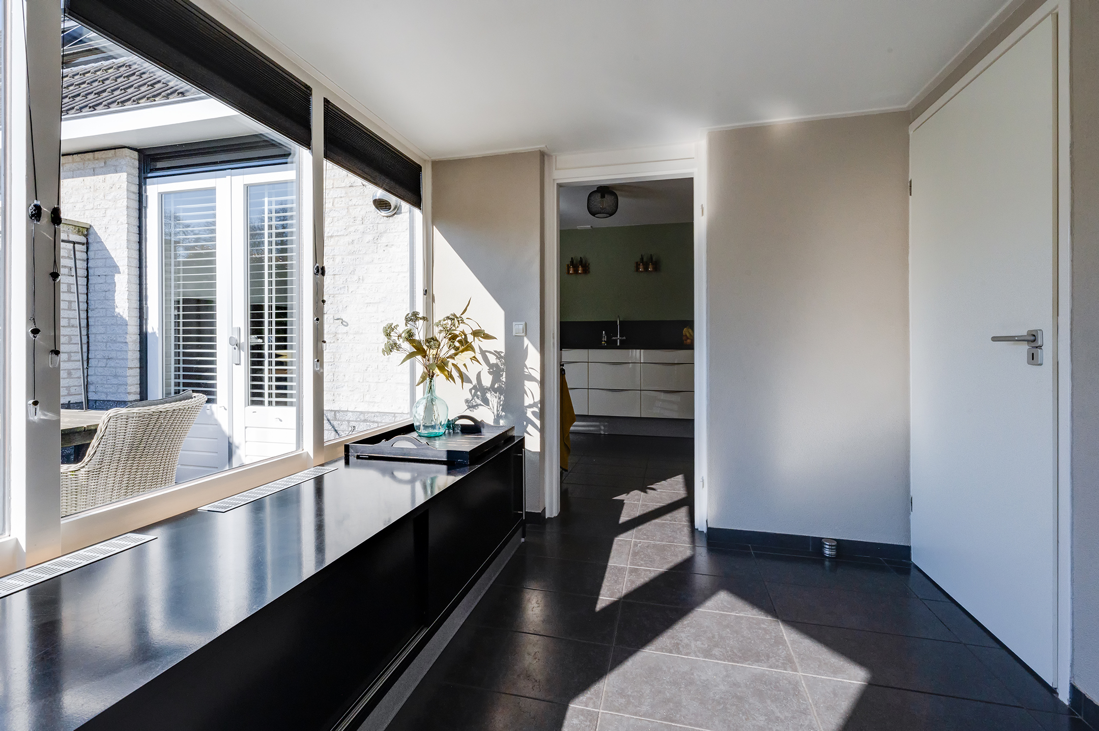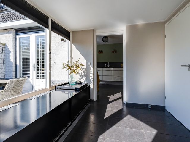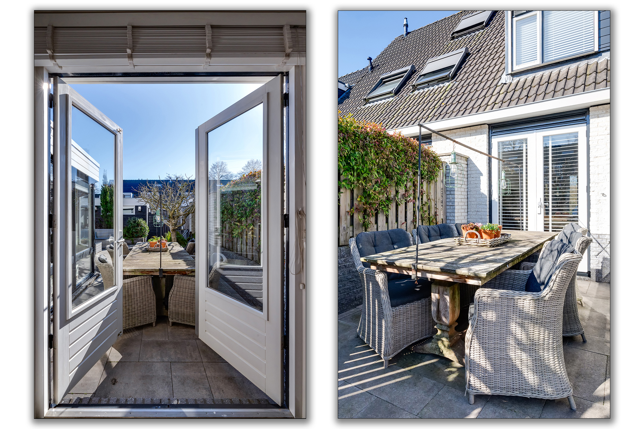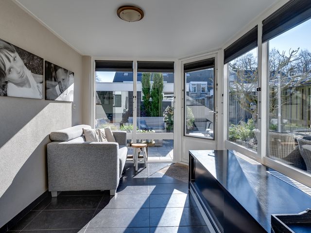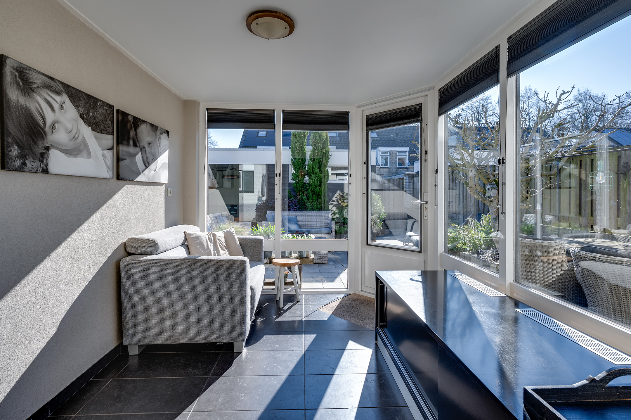 De L-vormige woonkamer is heerlijk licht vanwege de vele raampartijen. Aan de voorzijde bevindt zich het zitgedeelte, voorzien van gashaard. U heeft hiervandaan een leuk uitzicht over de straat. Het eetgedeelte bevindt zich aan de achterzijde. De openslaande deuren geven toegang tot de fraai aangelegde tuin.