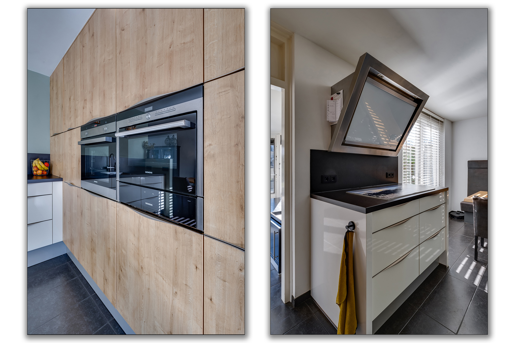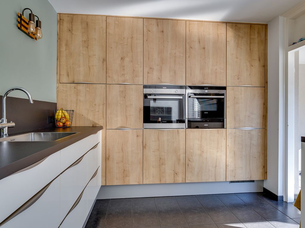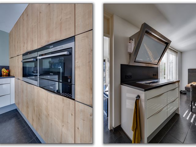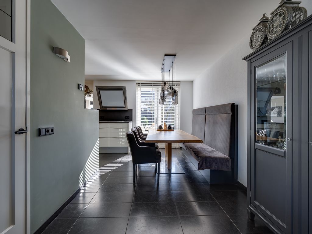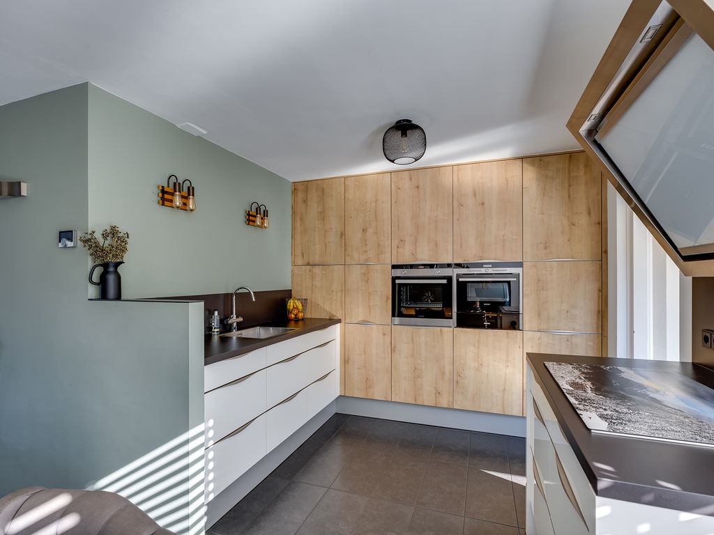 De aangrenzende open keuken beschikt over 2 keukenblokken en een kastenwand, voorzien van inbouwapparatuur. Qua apparatuur beschikt deze uitgebreide keuken over een inductie kookplaat en afzuigkap, 100 graden kraan, vaatwasser, magic corner, oven, warmhoudlade en magnetron. Er is veel kastruimte aanwezig. Vanuit de keuken loopt u de serre in.