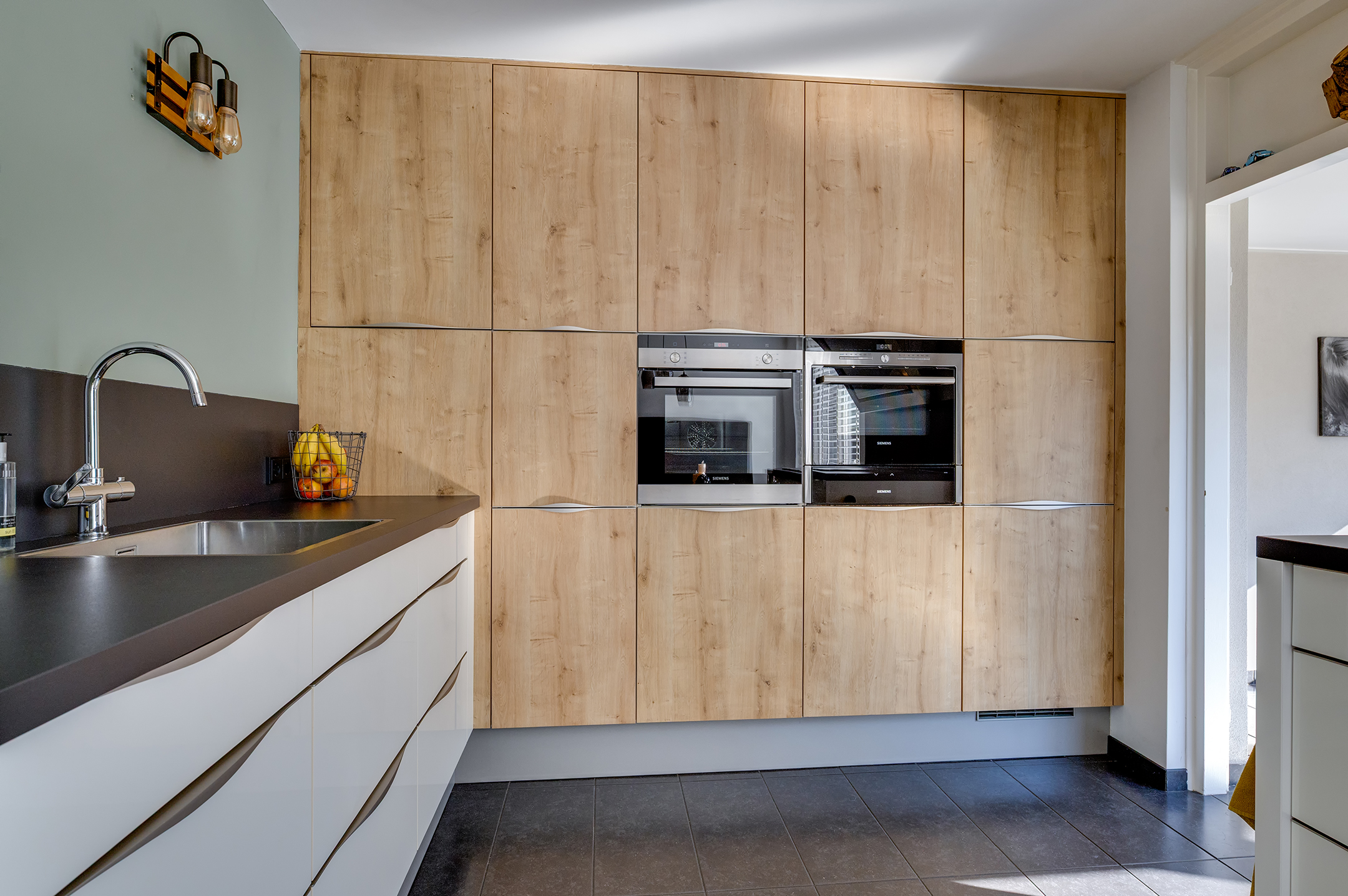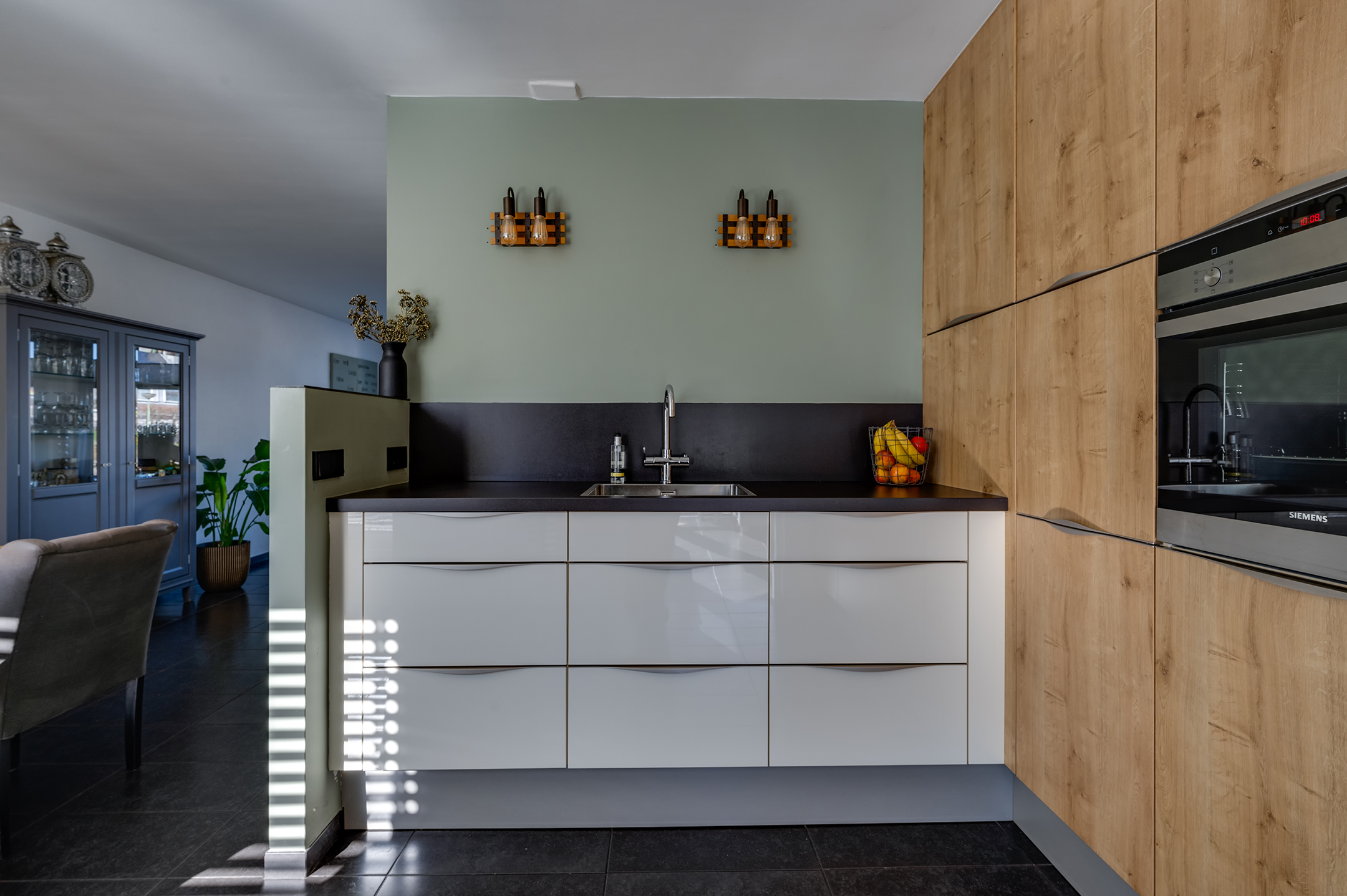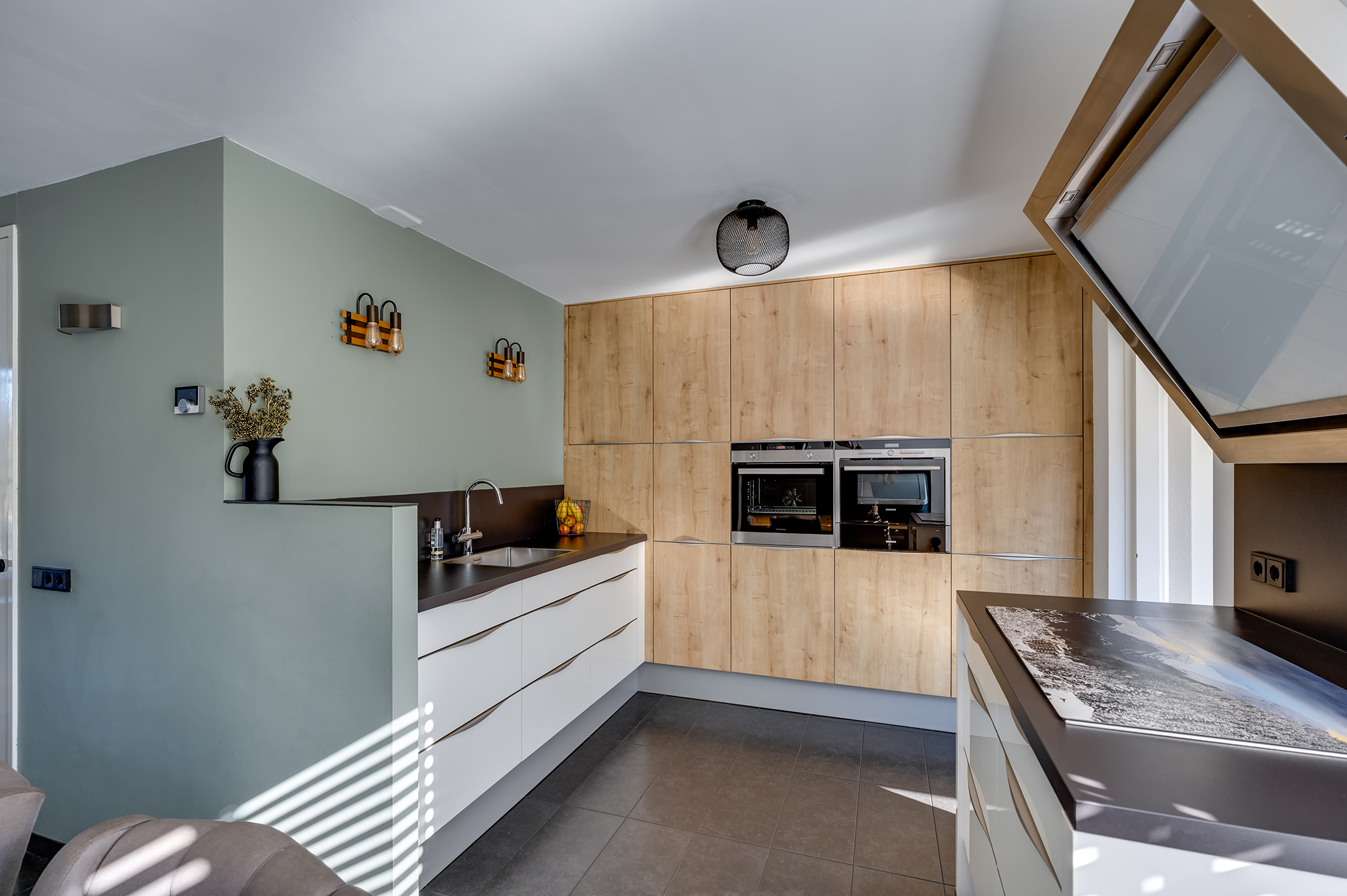 De aangrenzende open keuken beschikt over 2 keukenblokken en een kastenwand, voorzien van inbouwapparatuur. Qua apparatuur beschikt deze uitgebreide keuken over een inductie kookplaat en afzuigkap, 100 graden kraan, vaatwasser, magic corner, oven, warmhoudlade en magnetron. Er is veel kastruimte aanwezig. Vanuit de keuken loopt u de serre in.