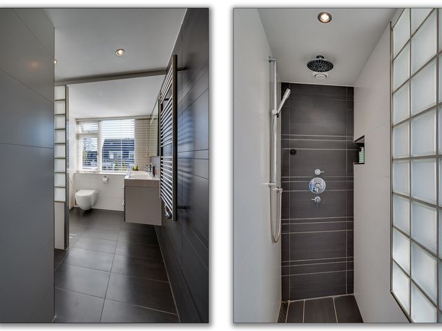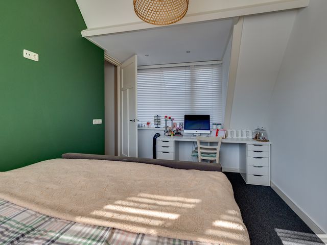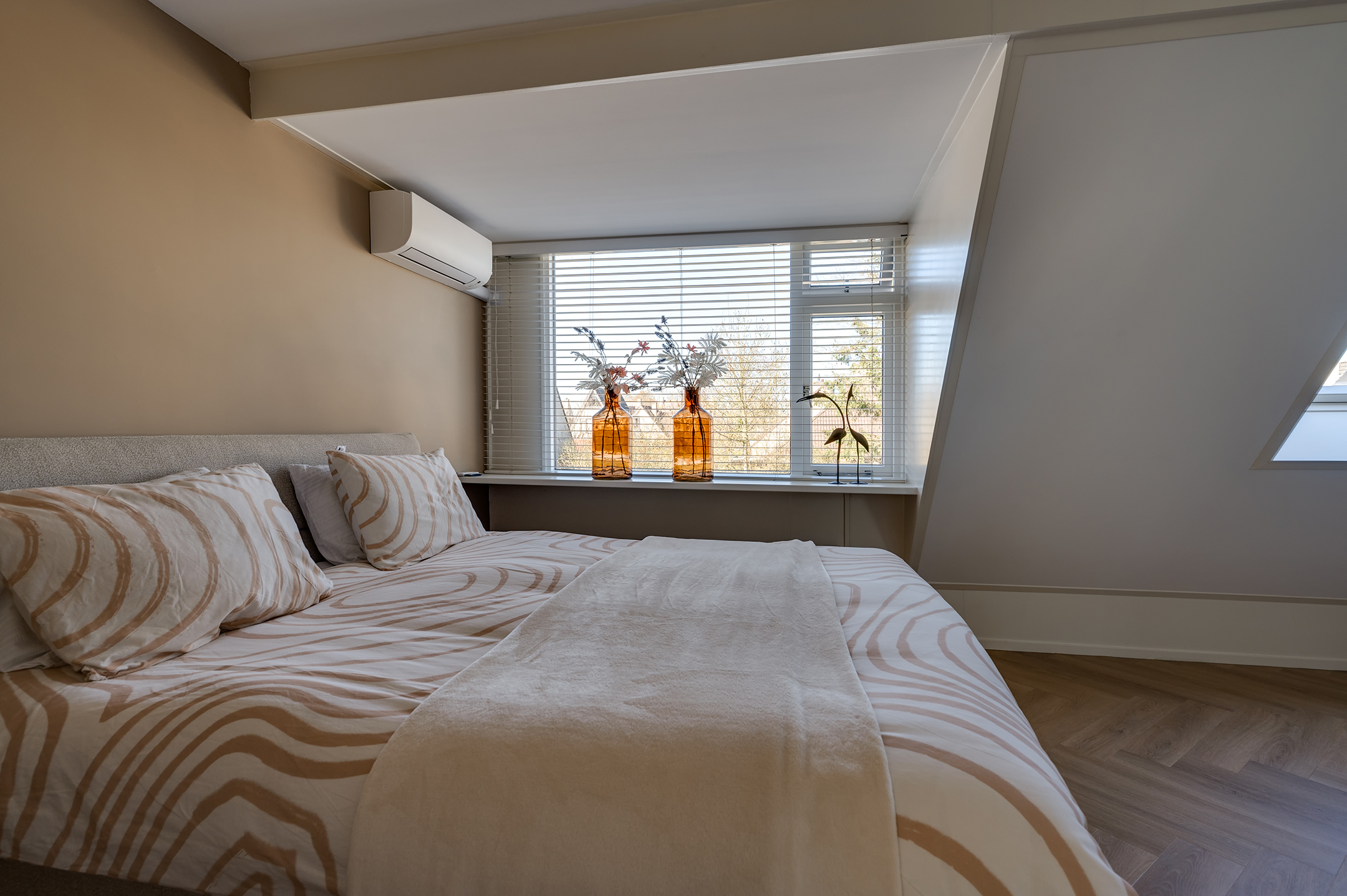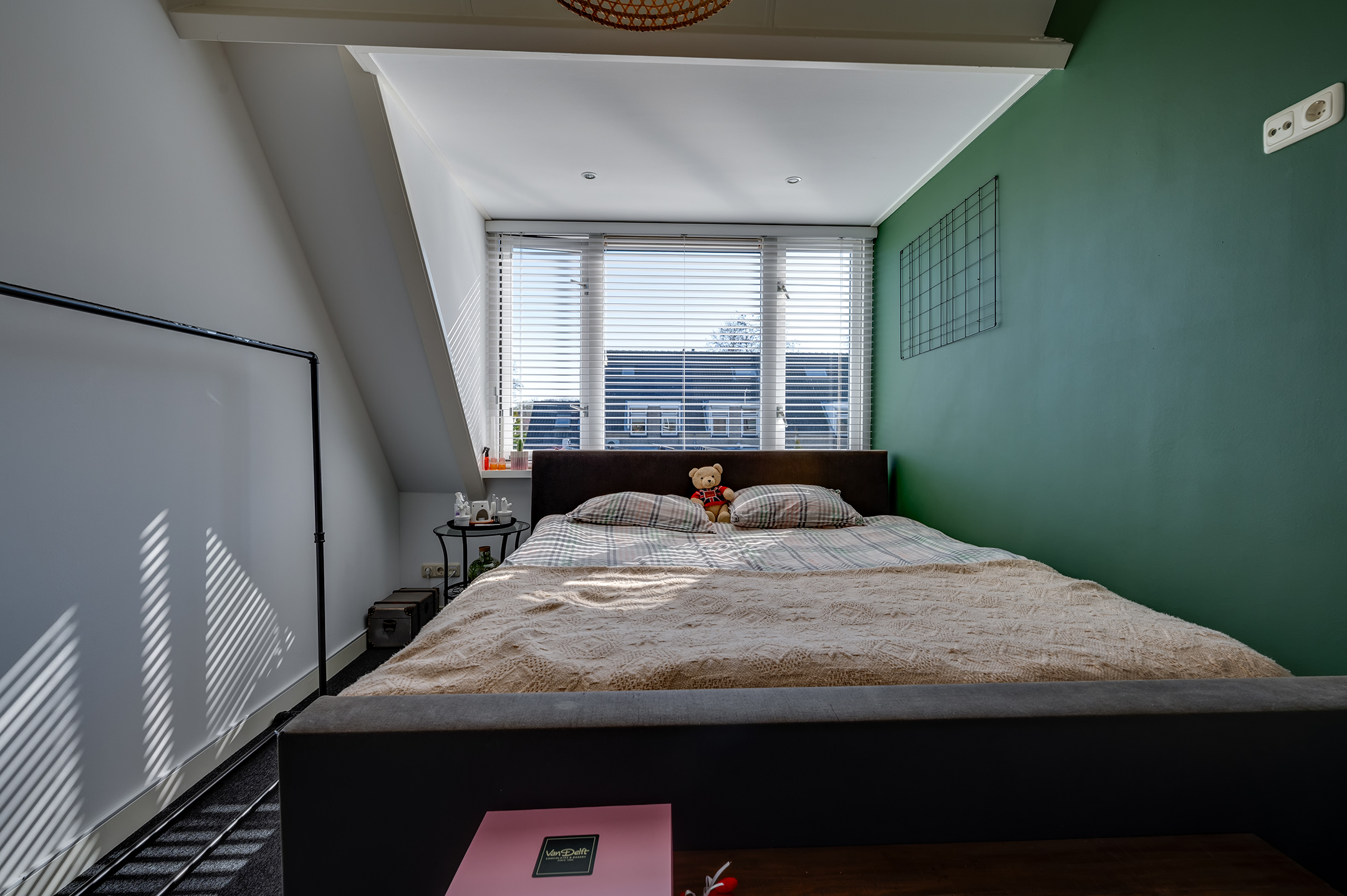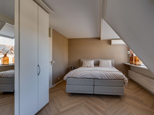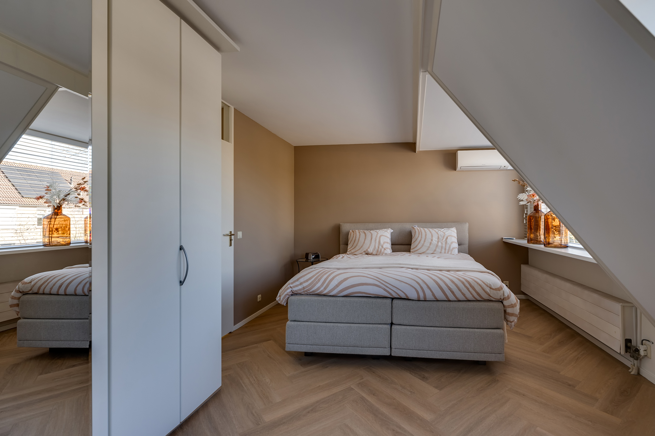 Op de verdieping treft u de overloop, drie slaapkamers en de badkamer. De ouderslaapkamer ligt aan de voorzijde van de woning en is voorzien van airconditioning, een Velux dakraam en een dakkapel met rolluik. Slaapkamer twee is gesitueerd boven de garage en is voorzien van een dakkapel aan de voorzijde én aan de achterzijde. De kleinste slaapkamer is momenteel ingericht als kleedkamer, met een grote inbouw kastenwand en met dakkapel met rolluik. De luxe badkamer is voorzien van een inloopdouche, dubbele wastafelmeubel, toilet en handdoekradiator.