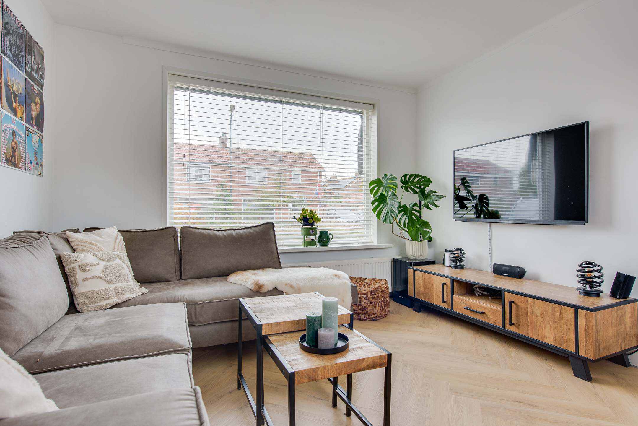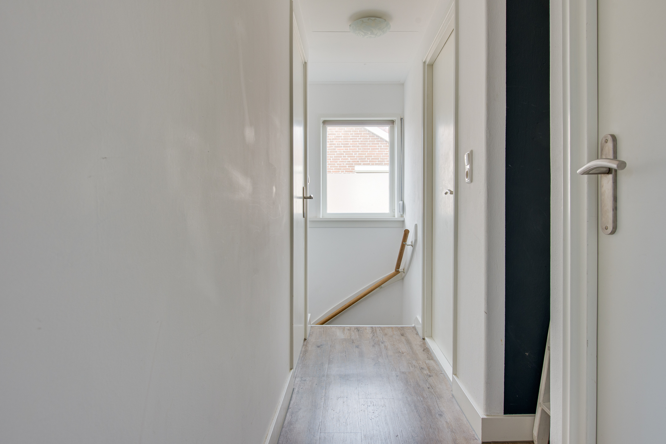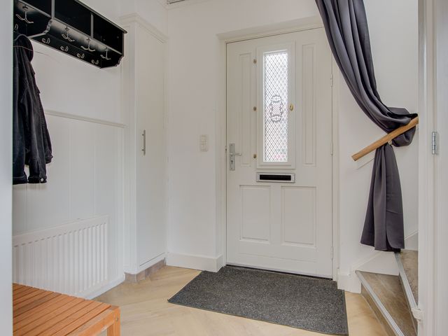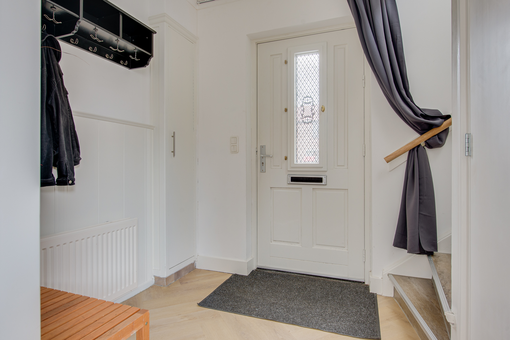 Via de voordeur stap je binnen in de hal, met toegang tot de trapopgang en de lichte woonkamer en keuken. De woonkamer is ruim en sfeervol, met veel natuurlijk licht door de grote ramen aan zowel de voor- als achterzijde.