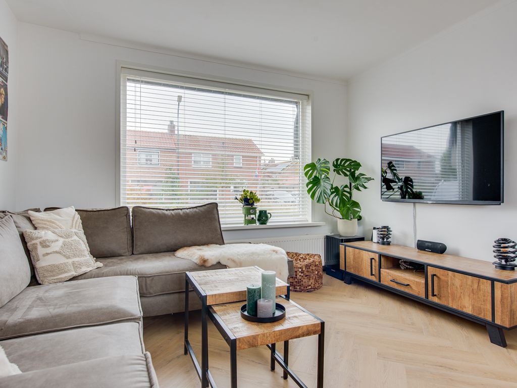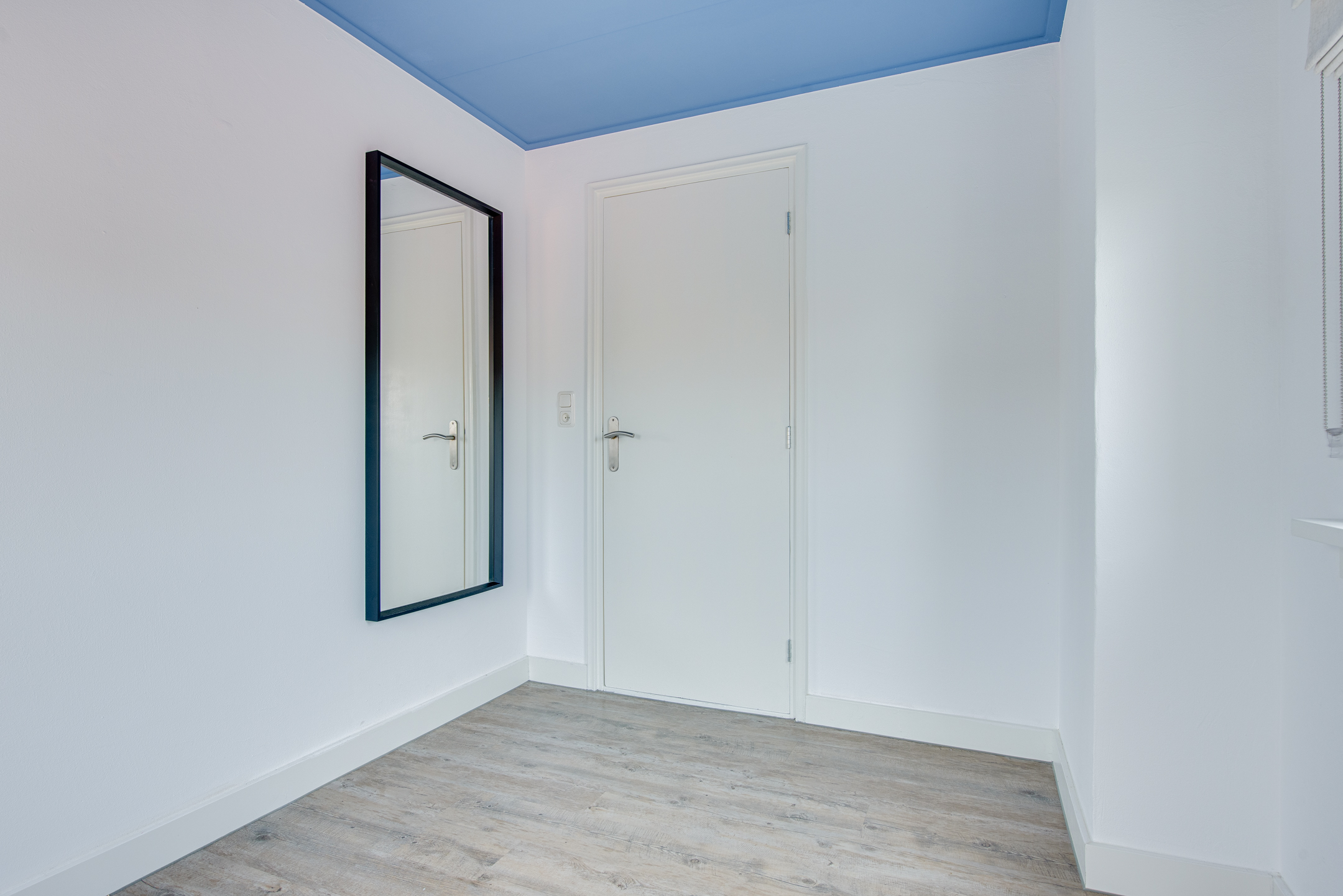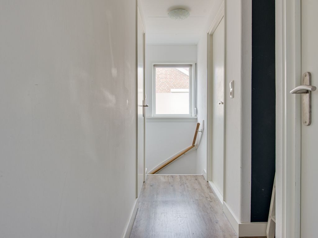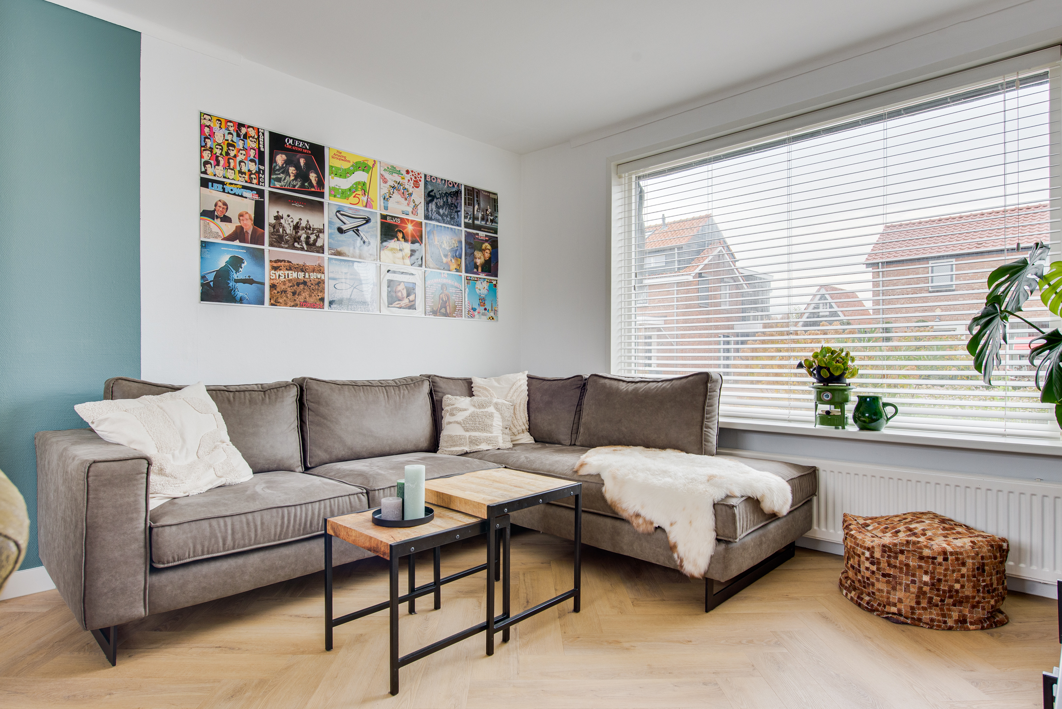Via de voordeur stap je binnen in de hal, met toegang tot de trapopgang en de lichte woonkamer en keuken. De woonkamer is ruim en sfeervol, met veel natuurlijk licht door de grote ramen aan zowel de voor- als achterzijde.