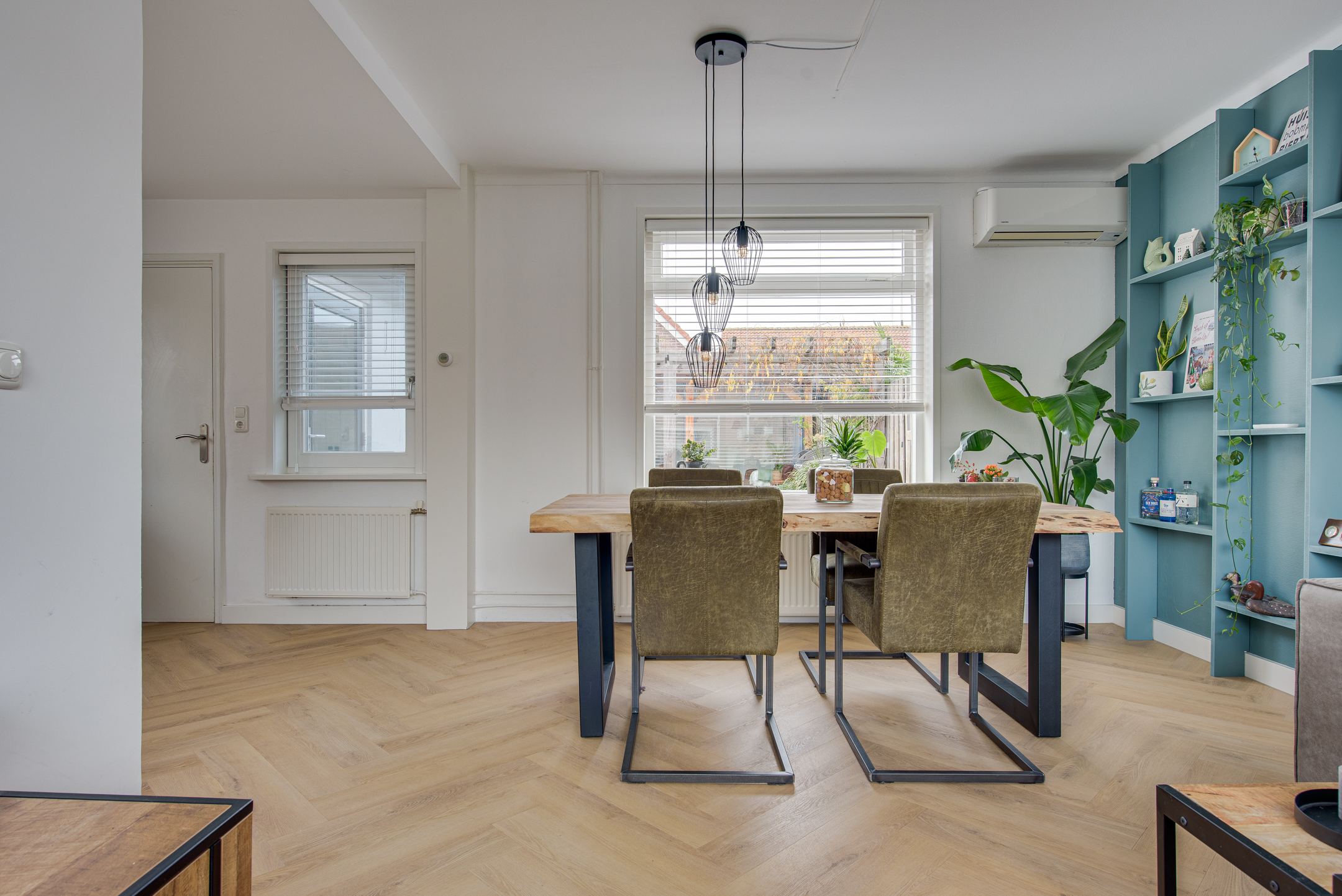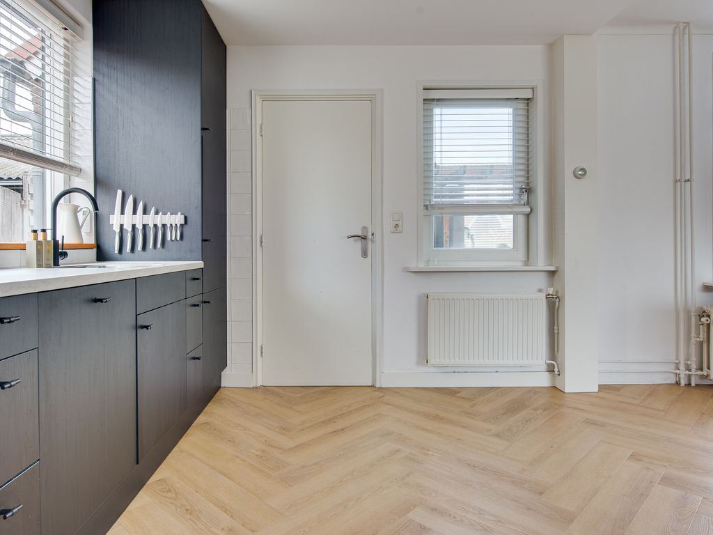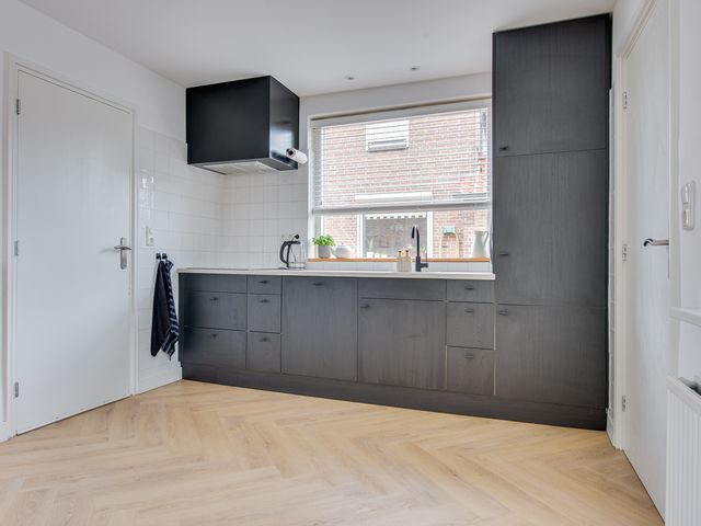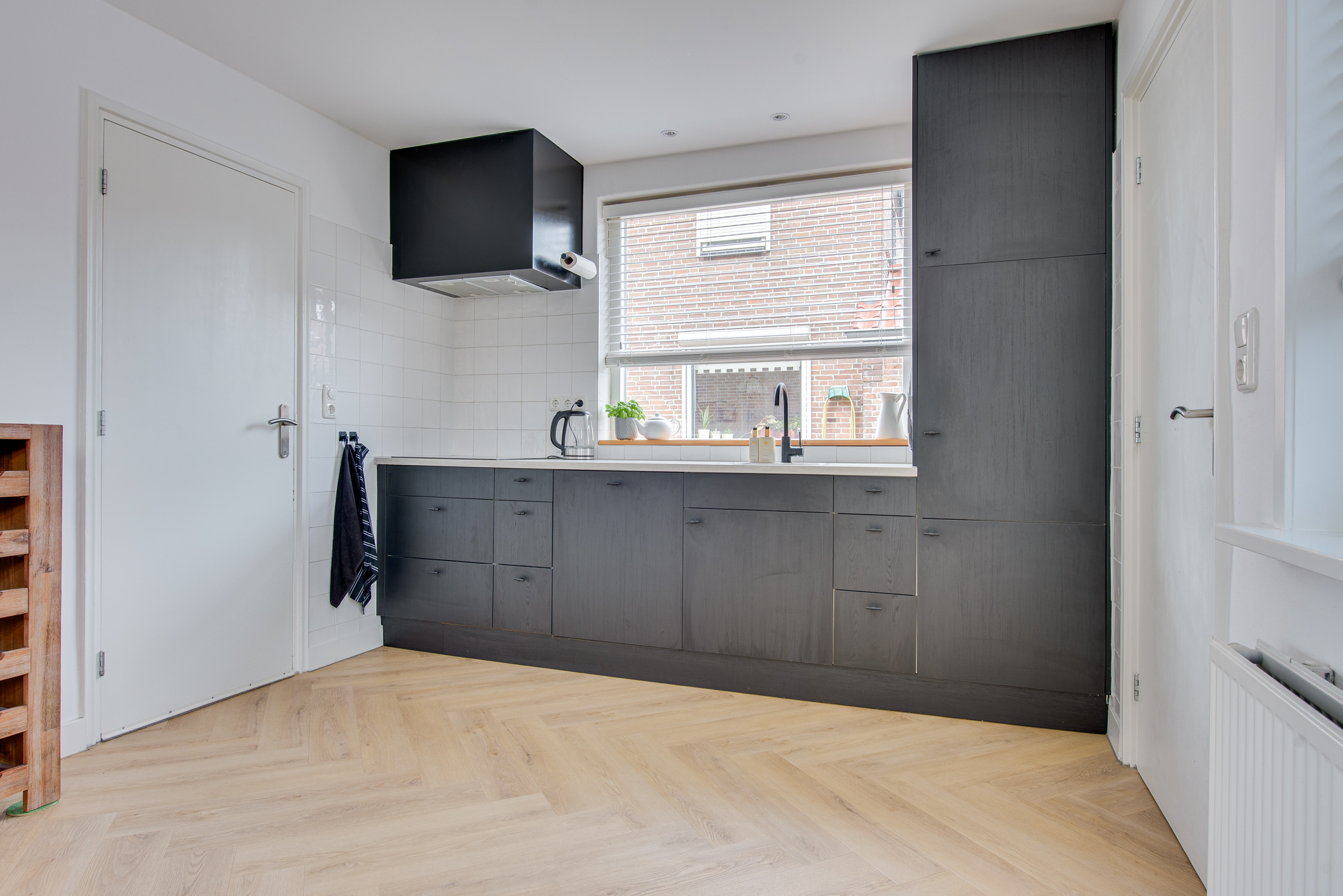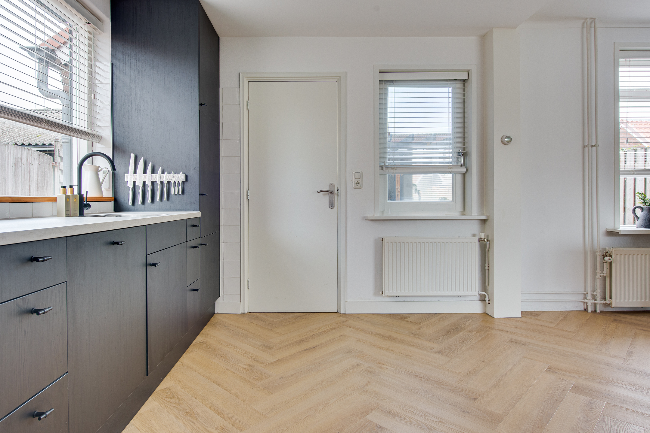De open keuken is praktisch én stijlvol ingericht met een inductiekookplaat, afzuigkap, spoelbak, vaatwasser en koelkast. Vanuit de keuken bereik je de achterhal met een apart toilet en toegang tot de tuin. Aangrenzend bevindt zich de bijkeuken met handige extra bergruimte en een plek voor de wasmachine, netjes weggewerkt achter schuifdeuren.