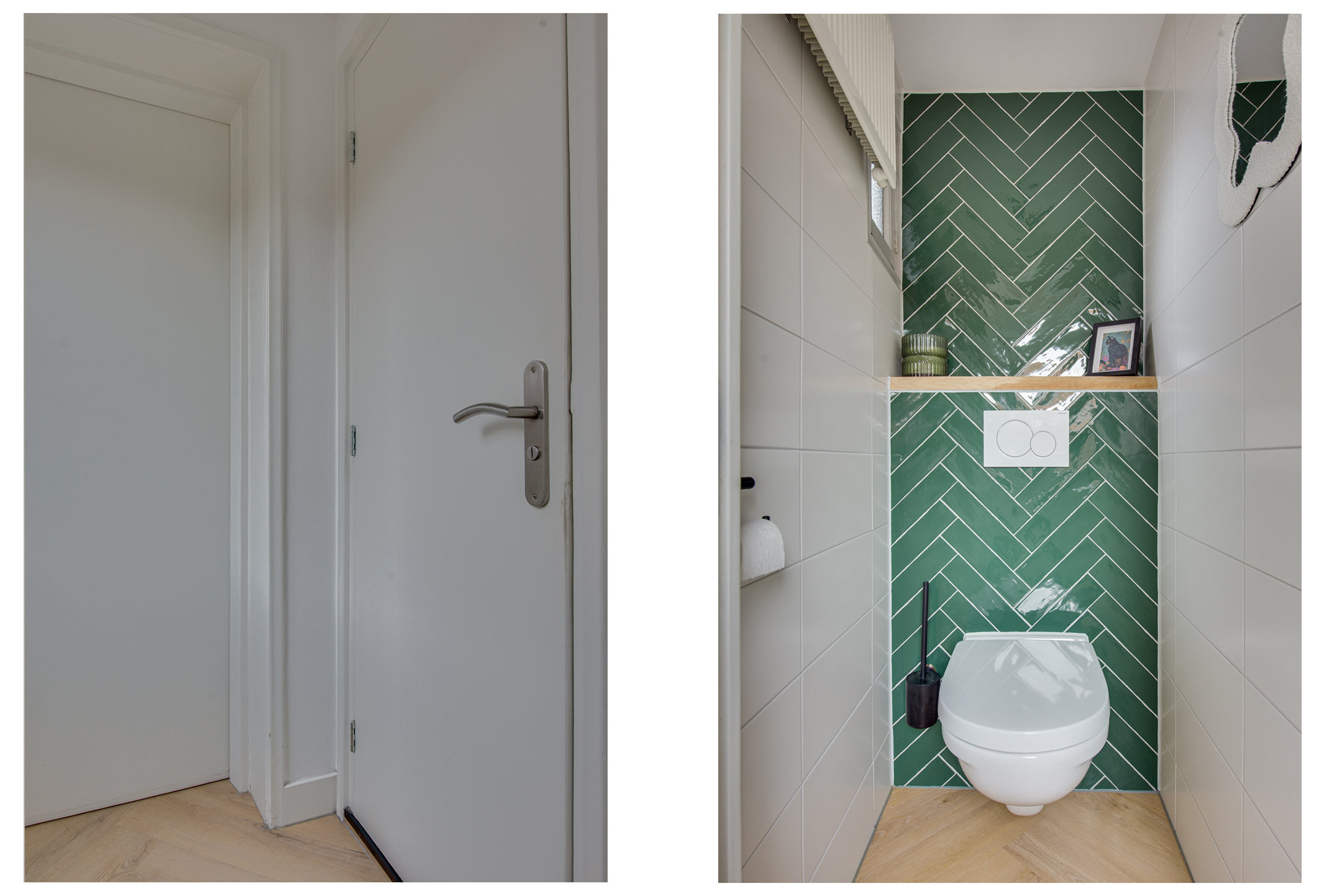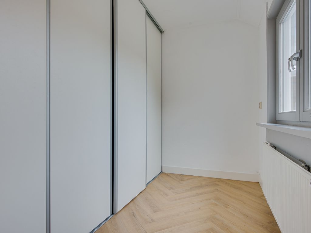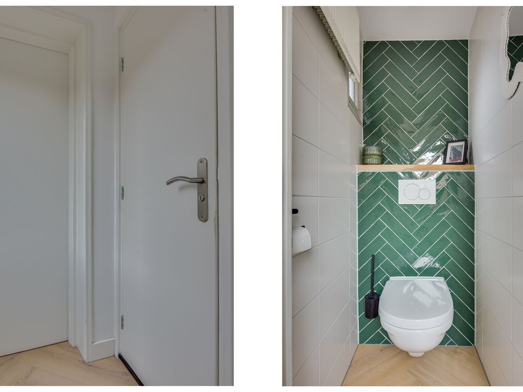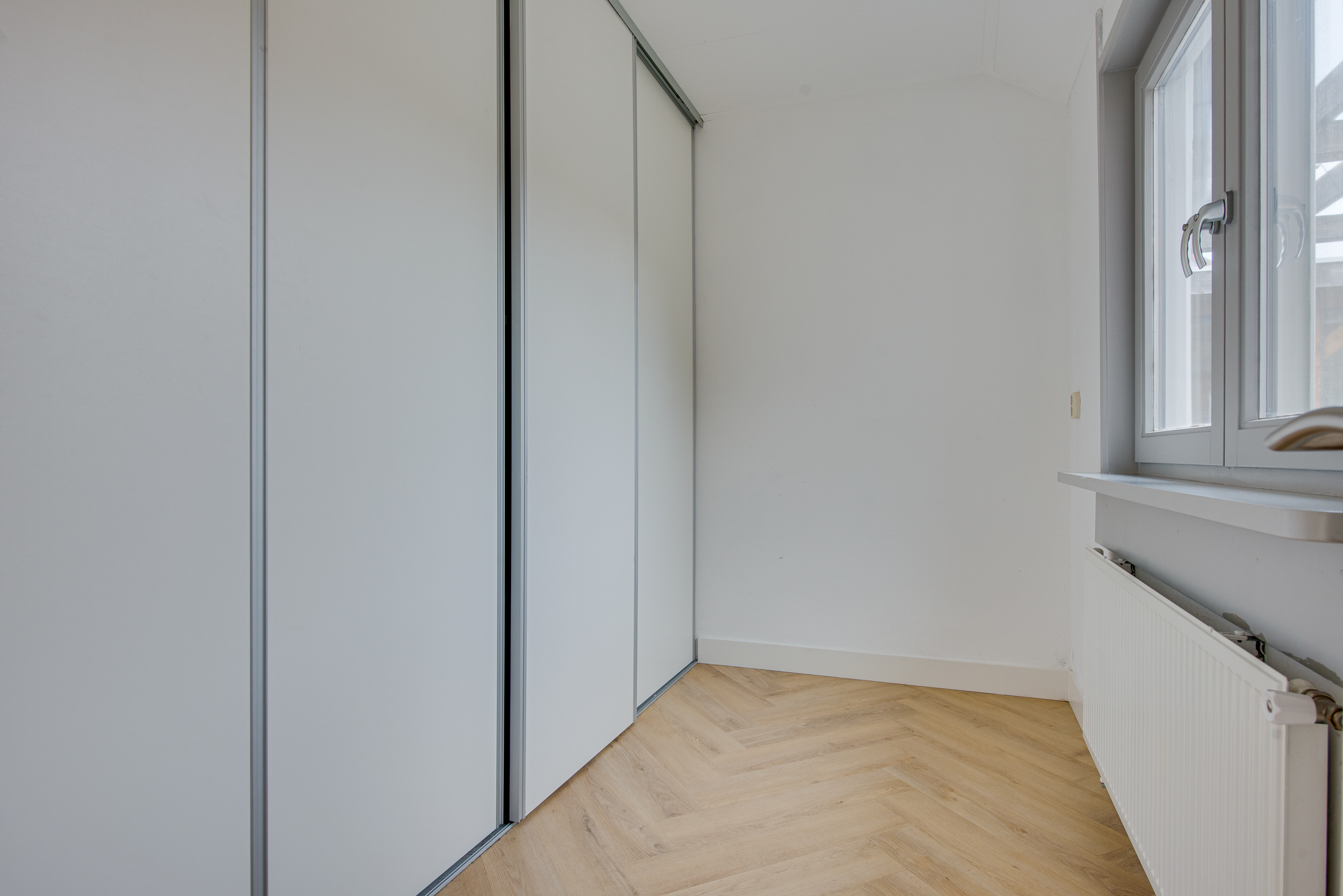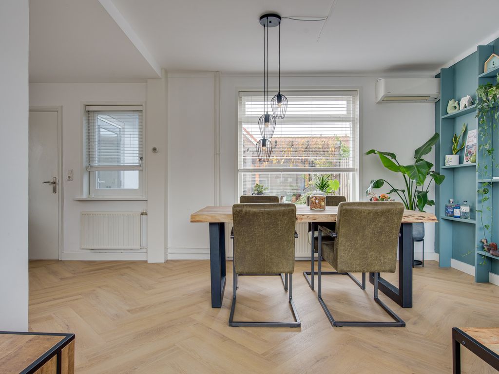 De open keuken is praktisch én stijlvol ingericht met een inductiekookplaat, afzuigkap, spoelbak, vaatwasser en koelkast. Vanuit de keuken bereik je de achterhal met een apart toilet en toegang tot de tuin. Aangrenzend bevindt zich de bijkeuken met handige extra bergruimte en een plek voor de wasmachine, netjes weggewerkt achter schuifdeuren.