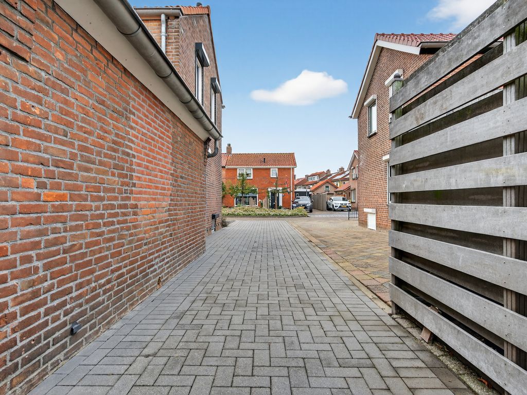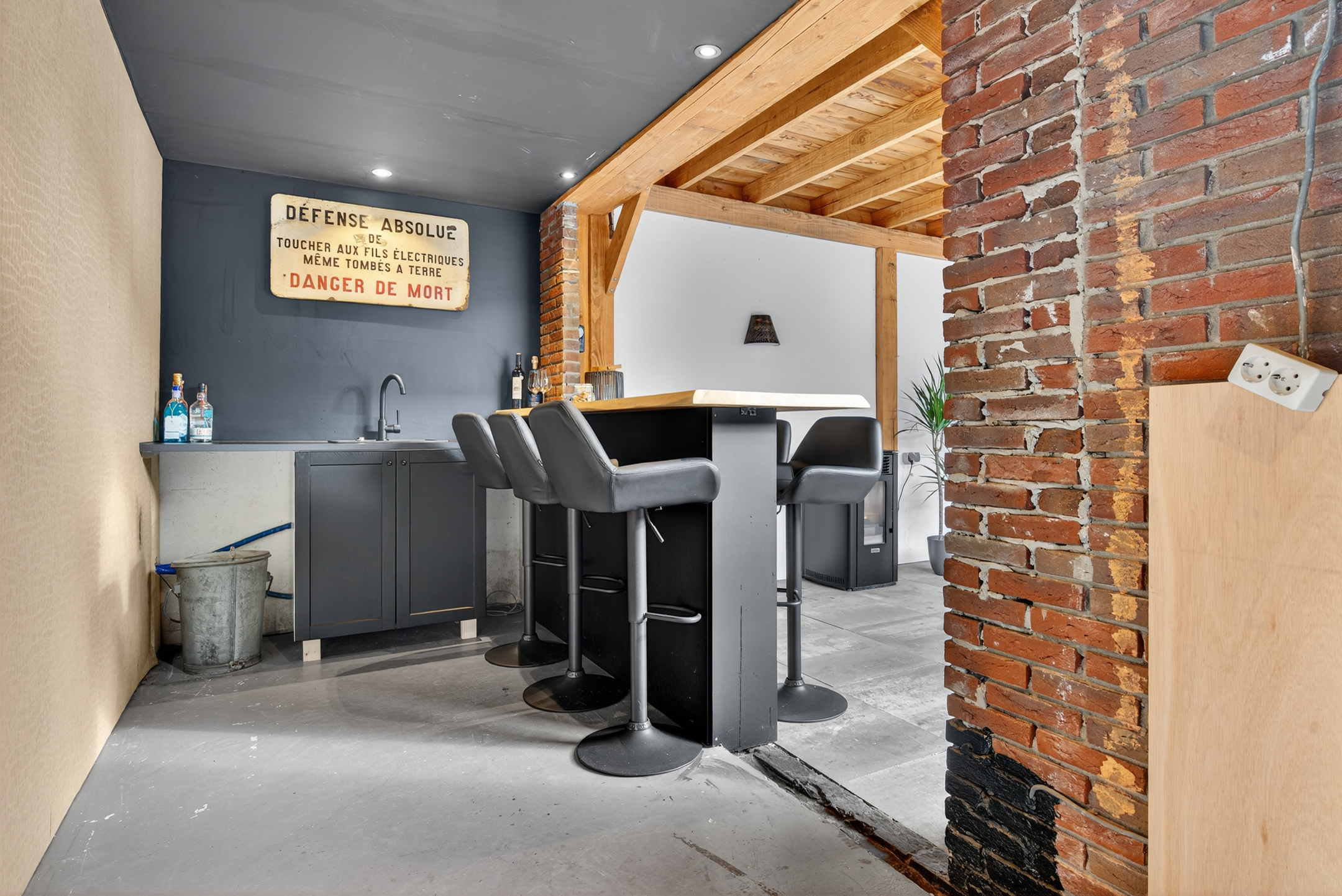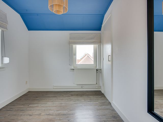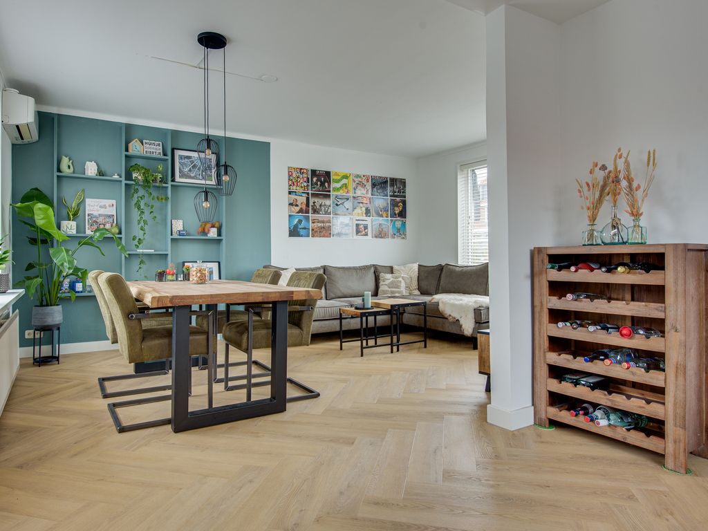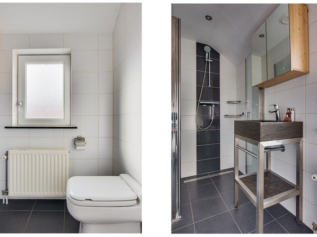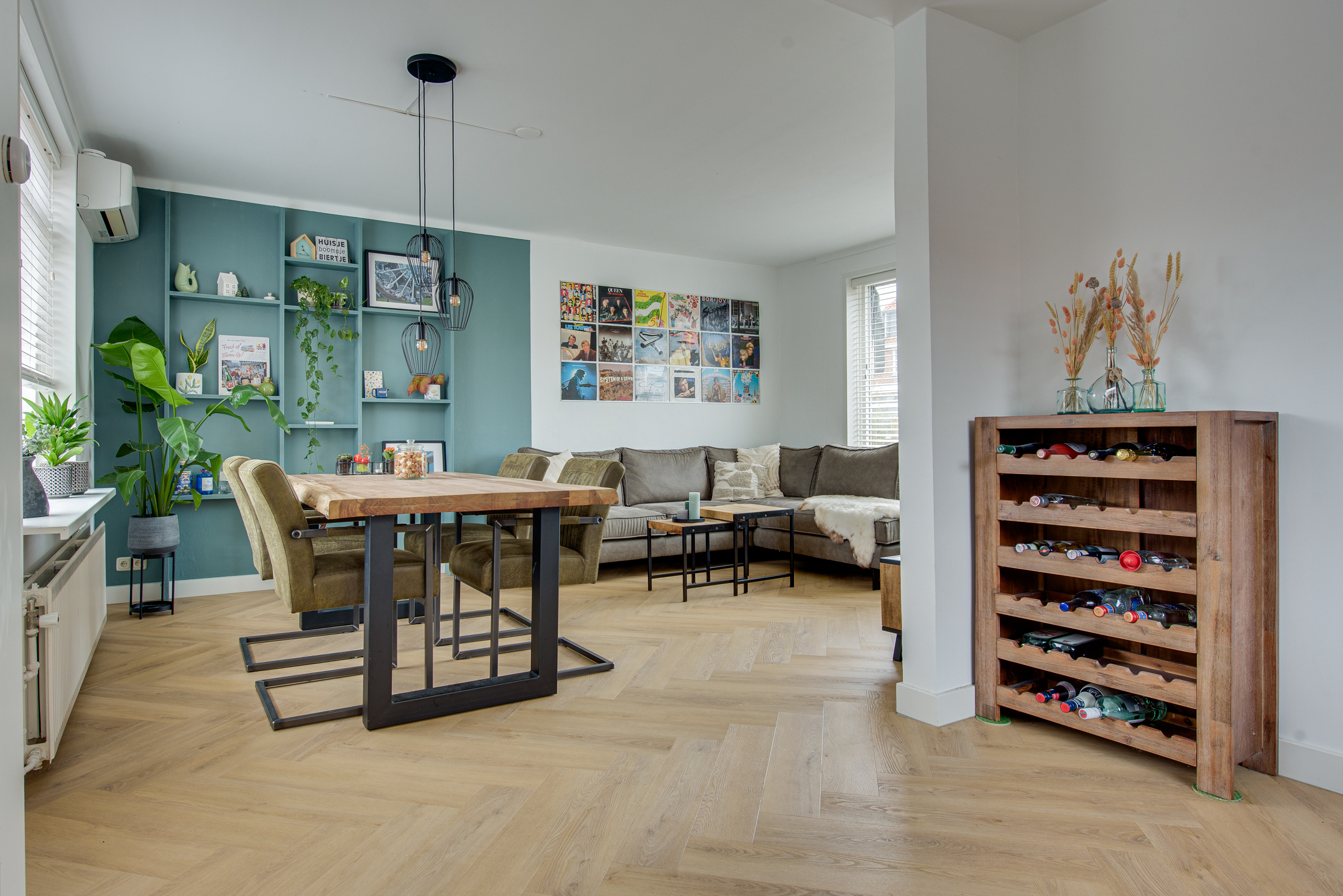 De open keuken is praktisch én stijlvol ingericht met een inductiekookplaat, afzuigkap, spoelbak, vaatwasser en koelkast. Vanuit de keuken bereik je de achterhal met een apart toilet en toegang tot de tuin. Aangrenzend bevindt zich de bijkeuken met handige extra bergruimte en een plek voor de wasmachine, netjes weggewerkt achter schuifdeuren.