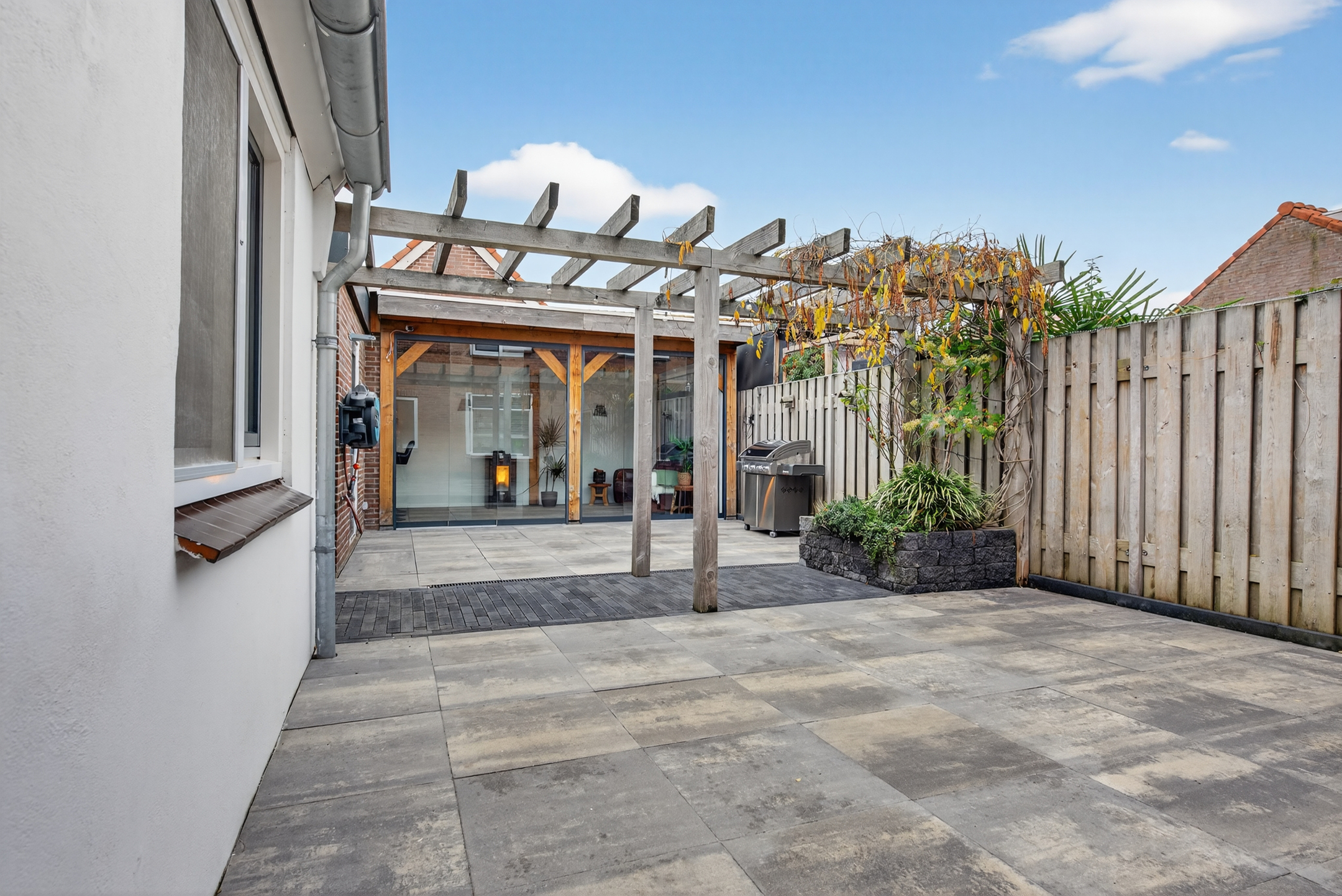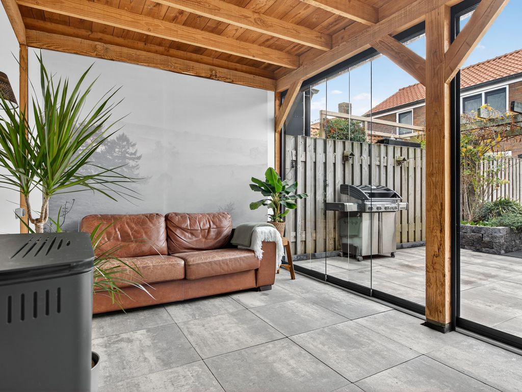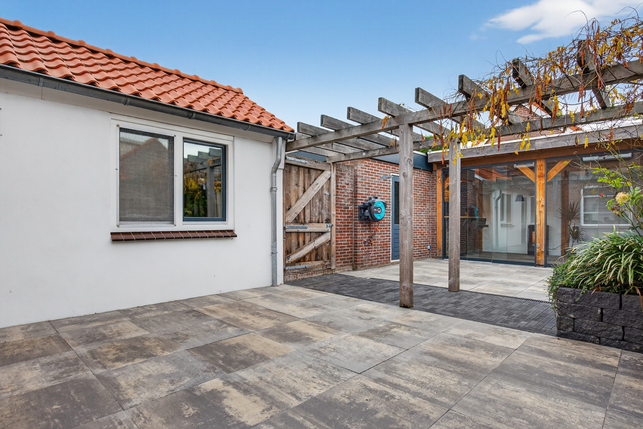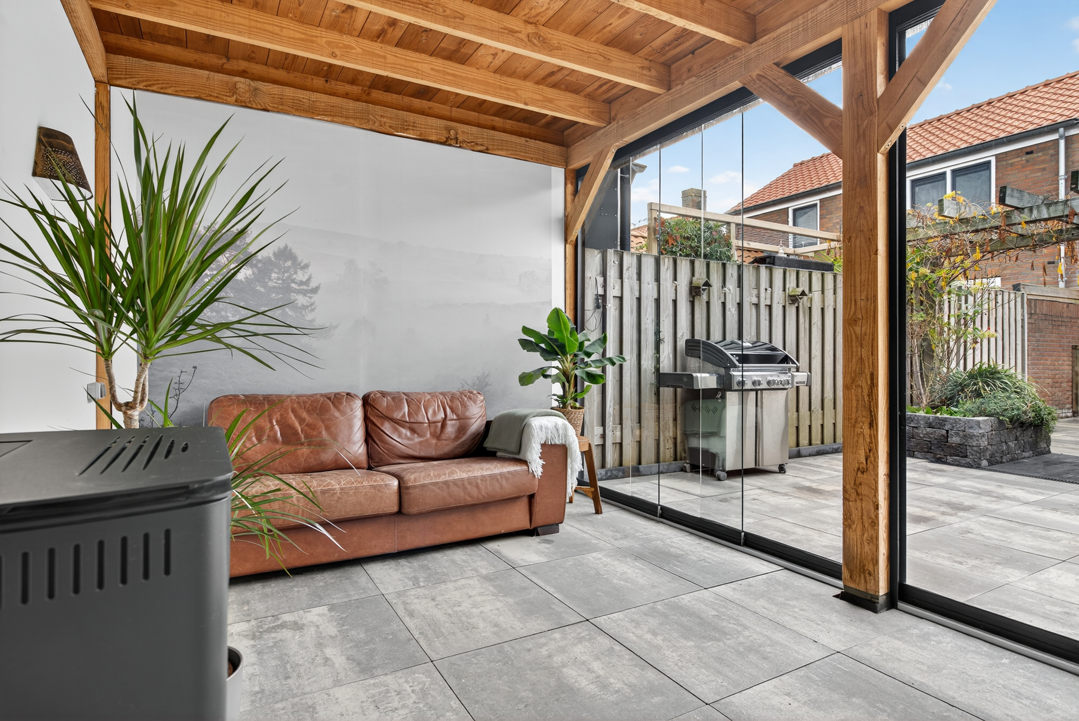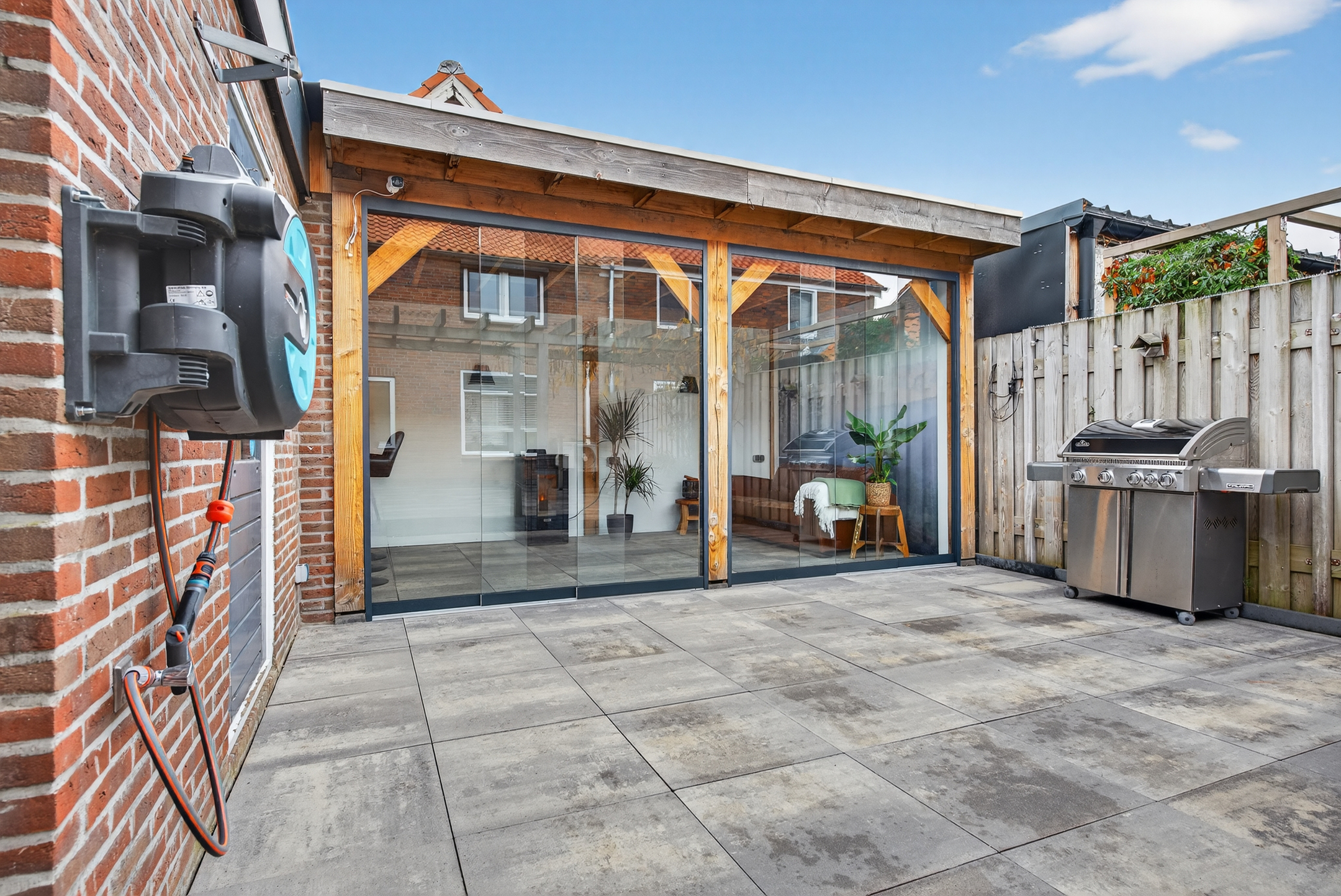 De ruime achtertuin is een heerlijke plek om te ontspannen of gezellig samen te zijn. Achterin de tuin vind je een sfeervolle veranda met glazen schuifpui – perfect om open te zetten op warme zomerdagen of juist dicht te houden tijdens koelere avonden. Hier is bovendien een toilet, bar en zithoek aanwezig: ideaal voor gezellige borrels of een ontspannen avond.