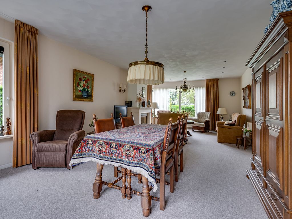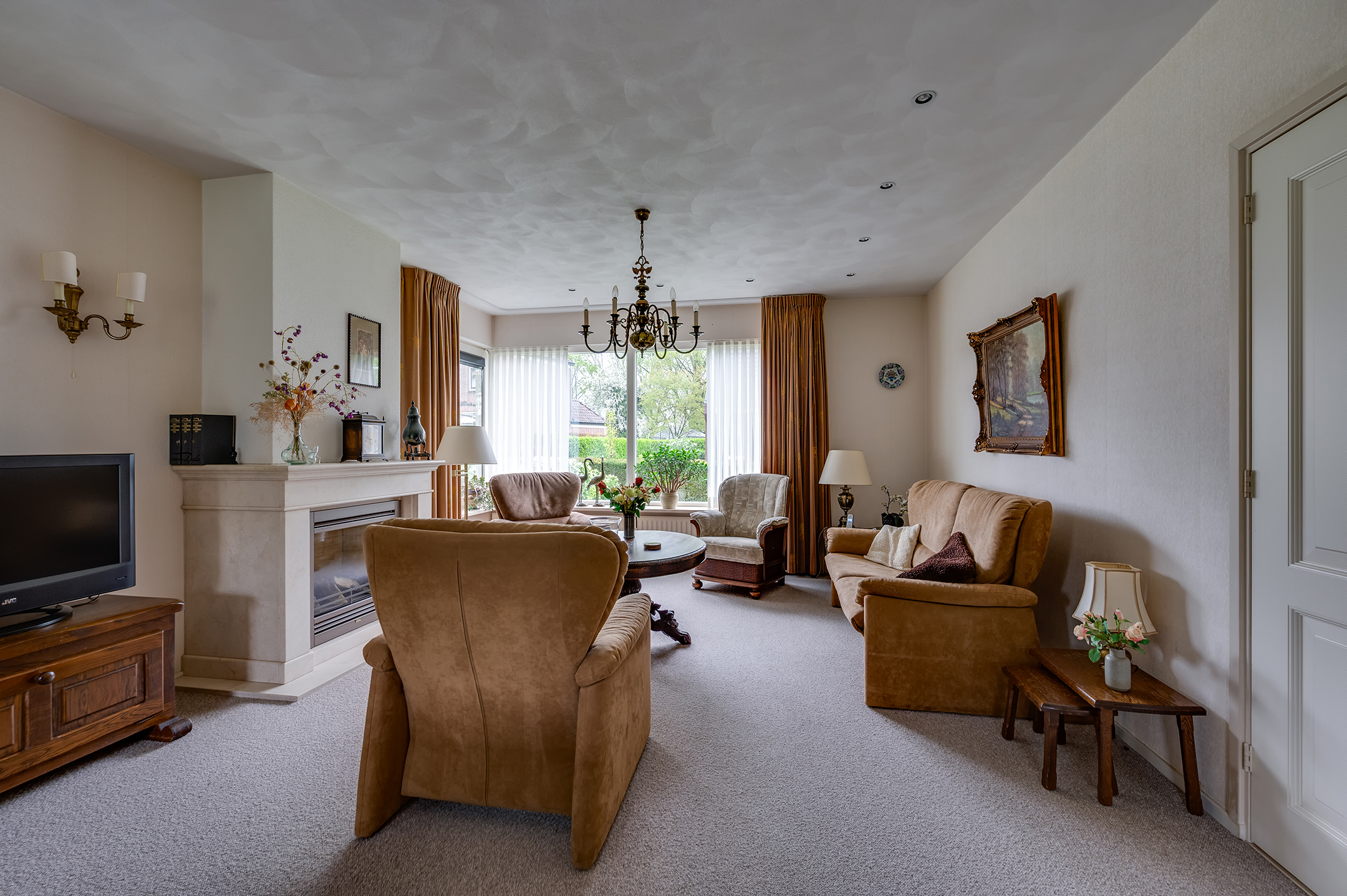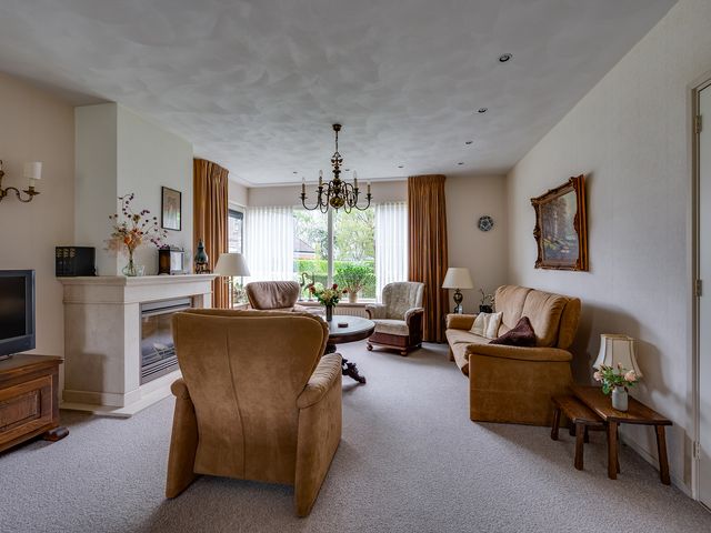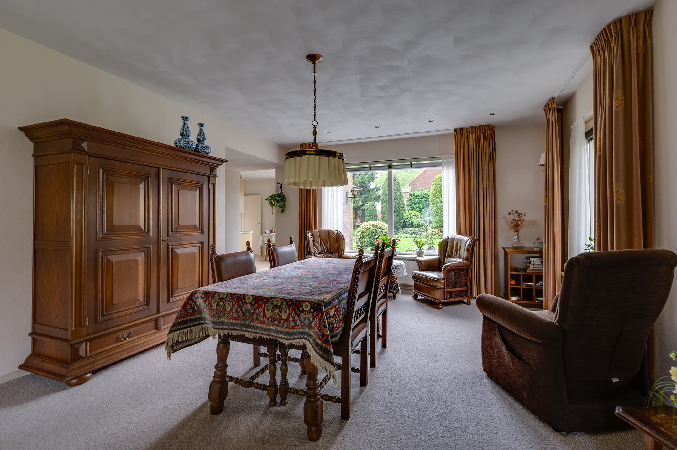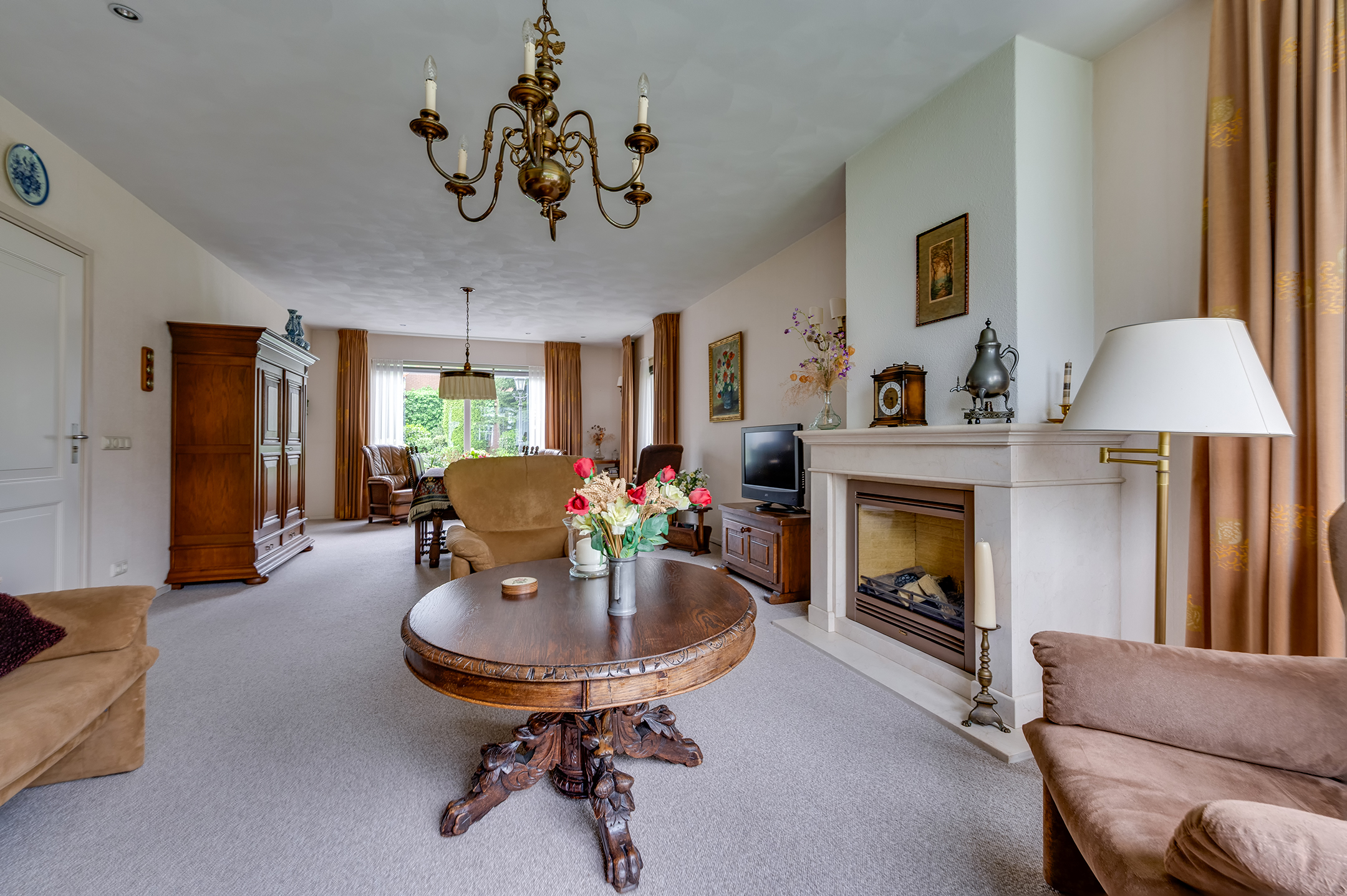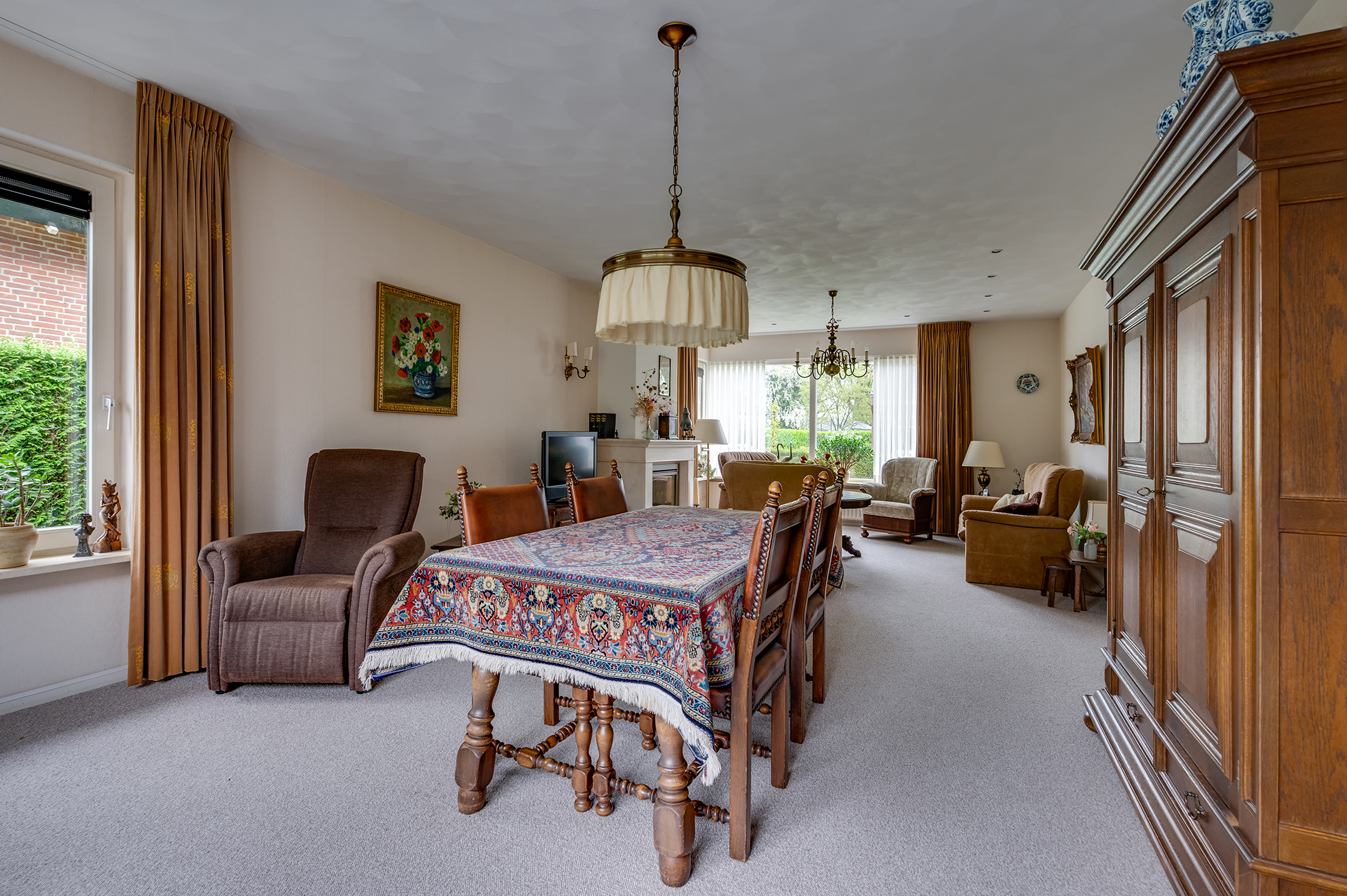 Je komt binnen in een ruime hal die direct toegang geeft tot de woonkamer, het toilet en een slaapkamer op de begane grond. De woonkamer is heerlijk licht dankzij het grote raam aan de voorzijde. De gezellige gashaard zorgt voor extra sfeer, zeker op koude dagen. De woonkamer loopt naadloos over in de eetkamer waardoor er een fijne open leefruimte ontstaat.