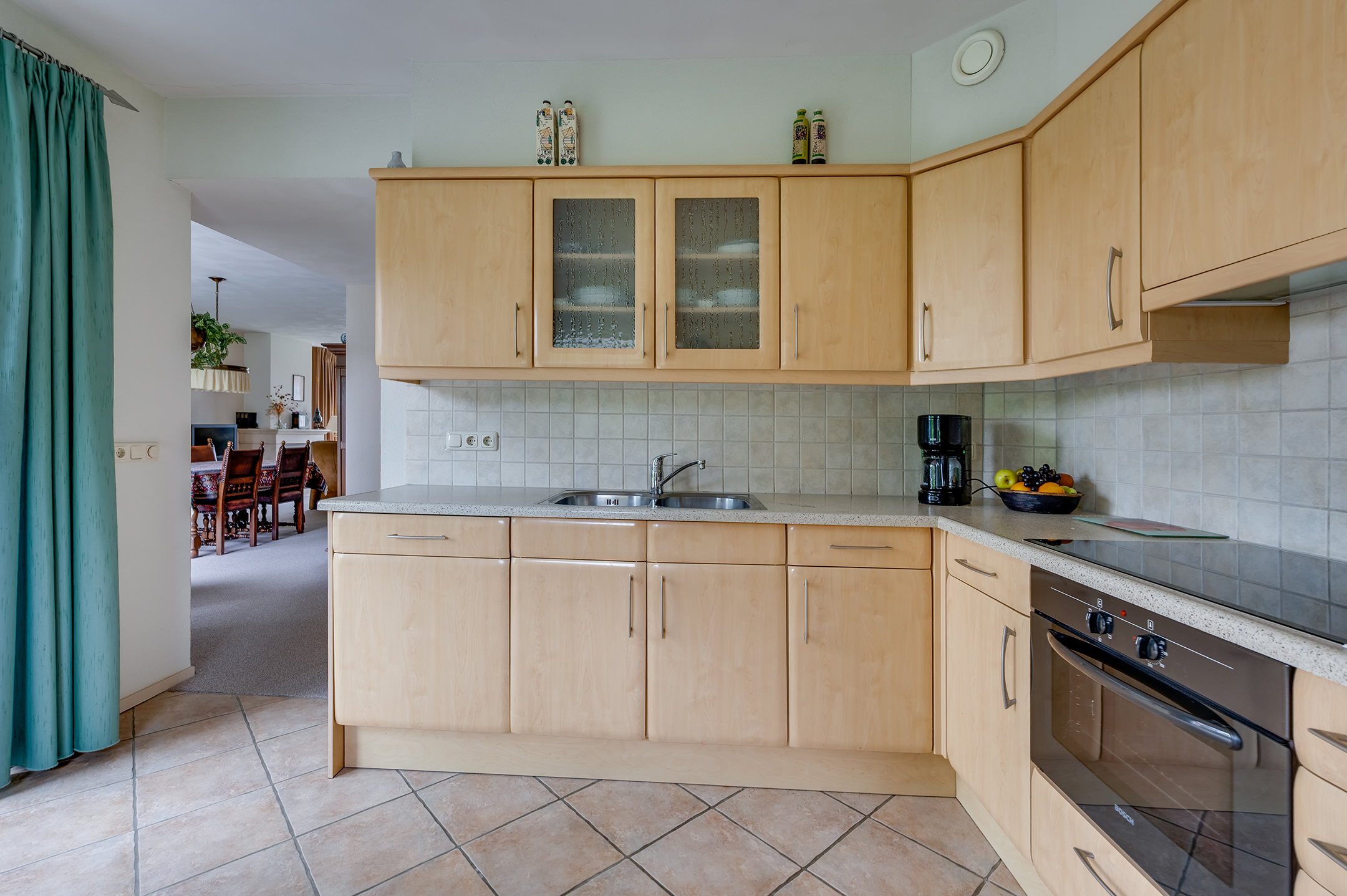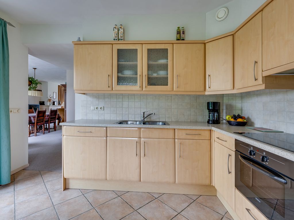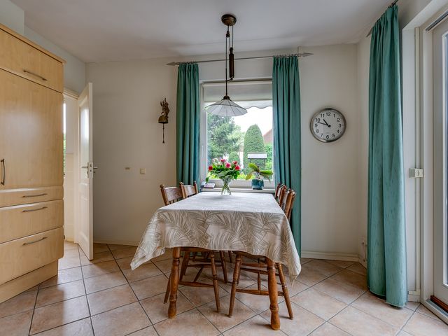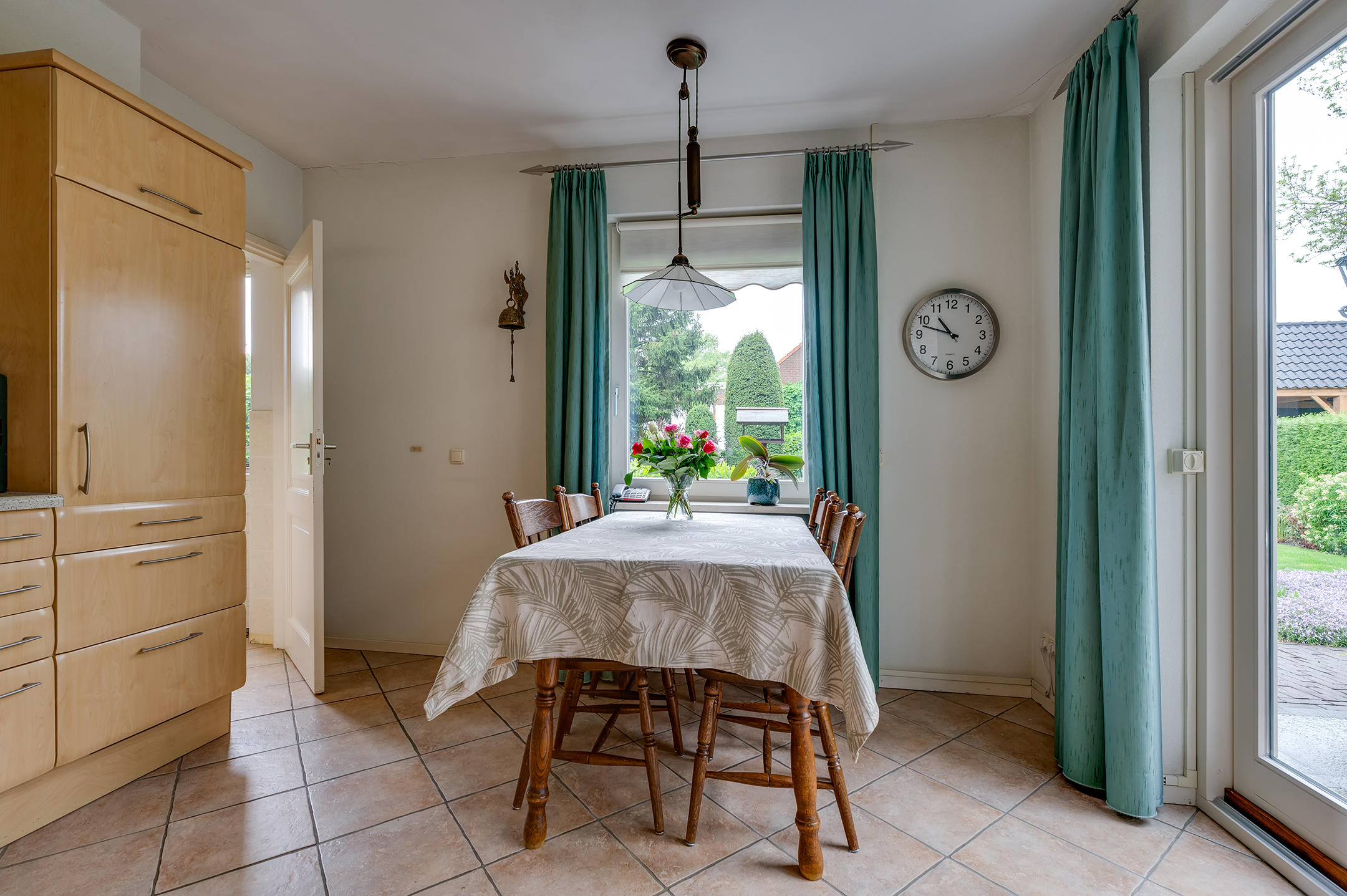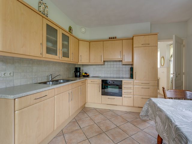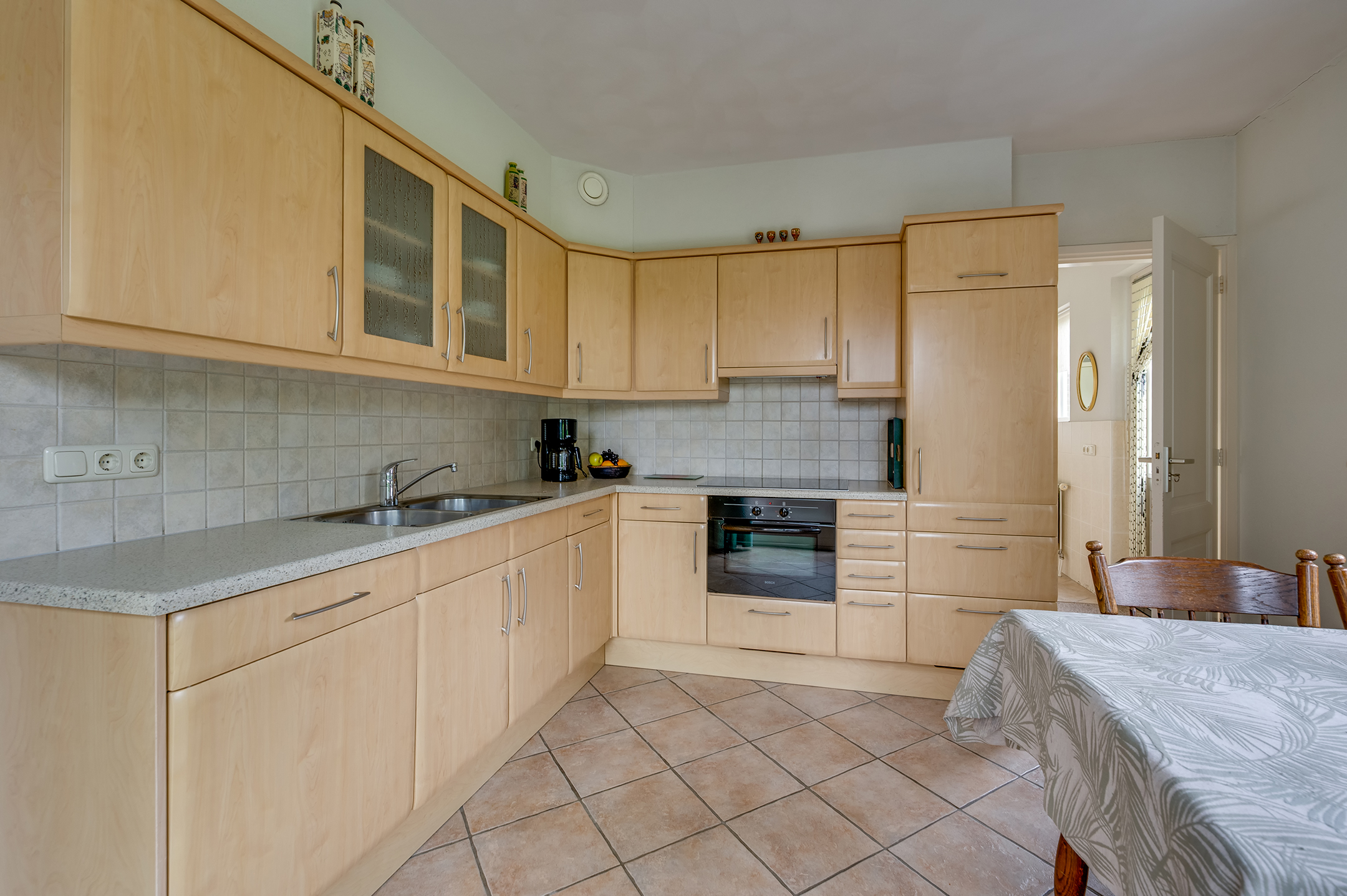 De keuken is ruim en voorzien van inbouwapparatuur zoals een inductiekookplaat, afzuigkap, oven en vaatwasser. Vanuit de keuken bereik je de bijkeuken, die op haar beurt doorgang biedt naar de aangebouwde garage én de achtertuin. Via de schuifpui in de keuken kom je op het (beschutte) terras.