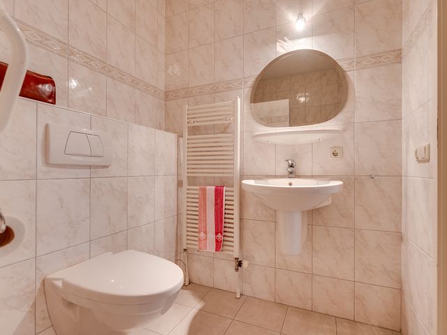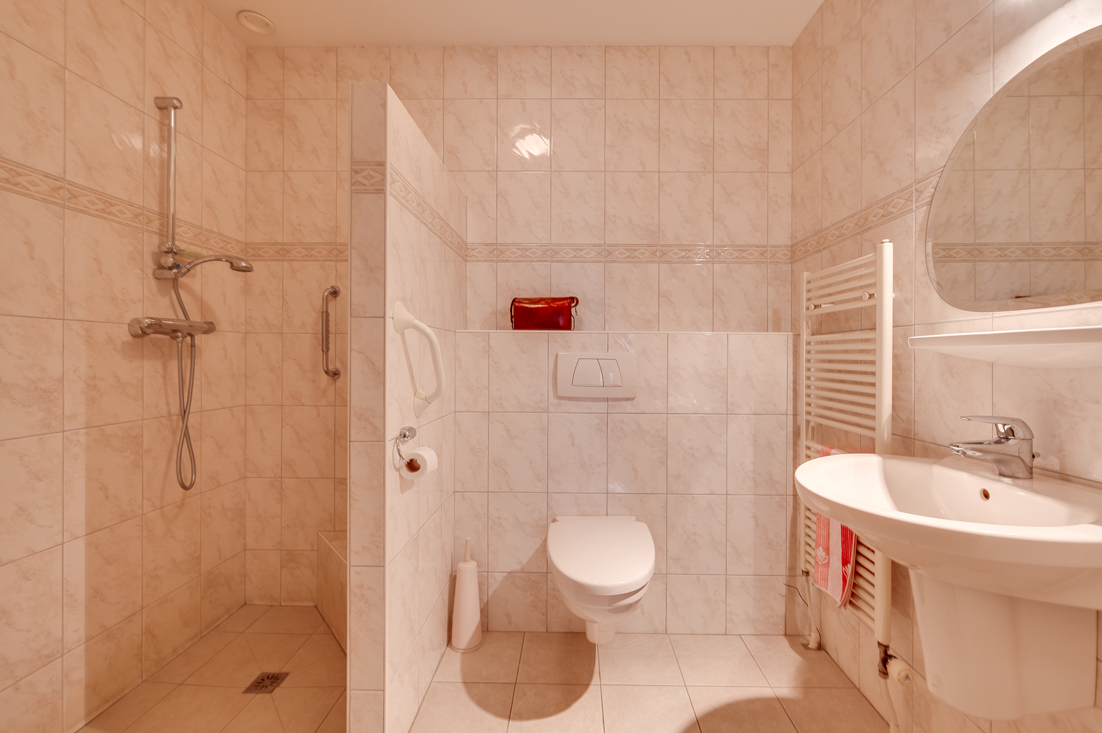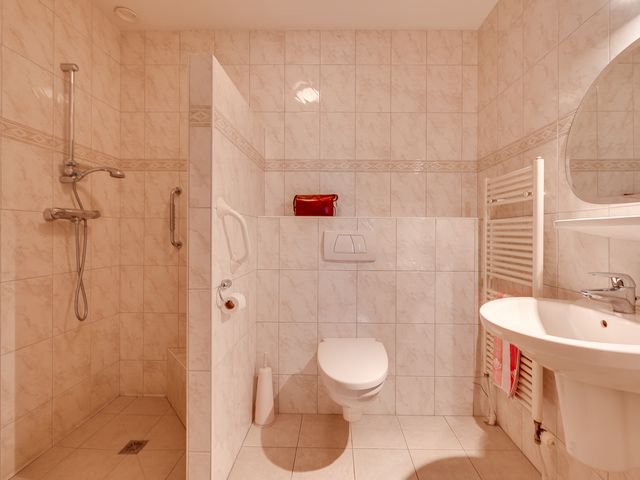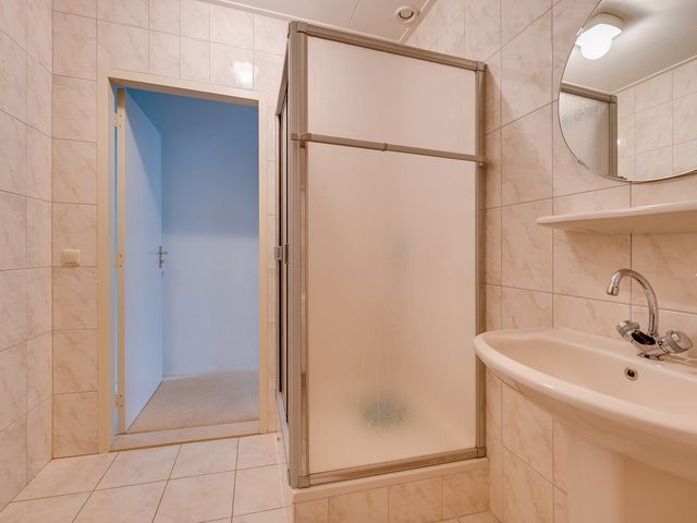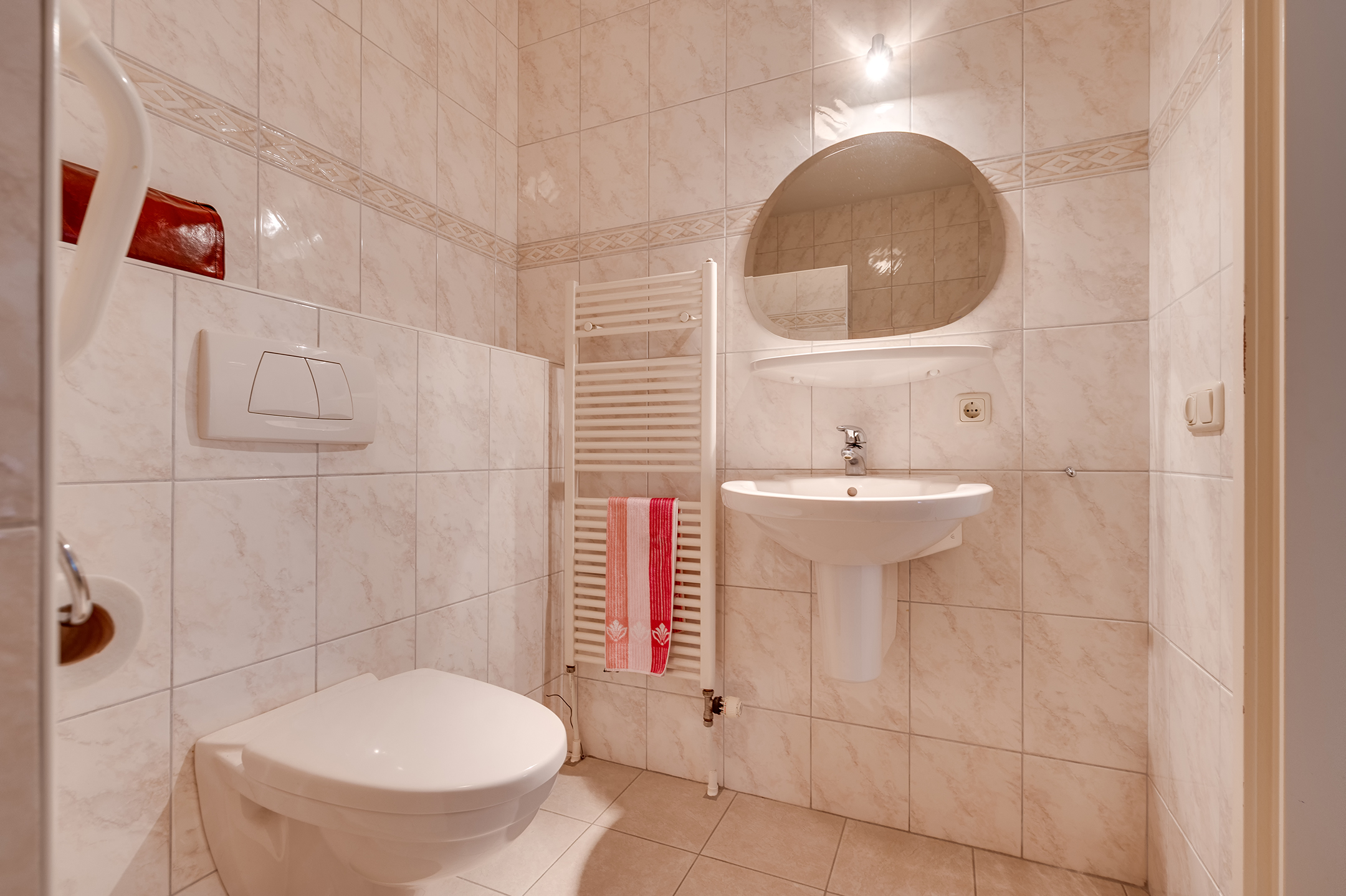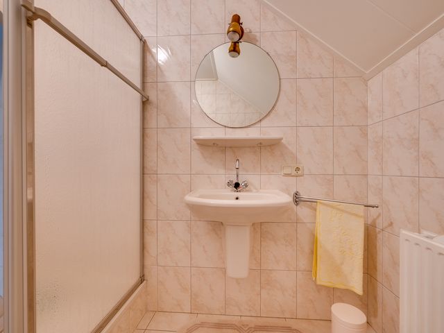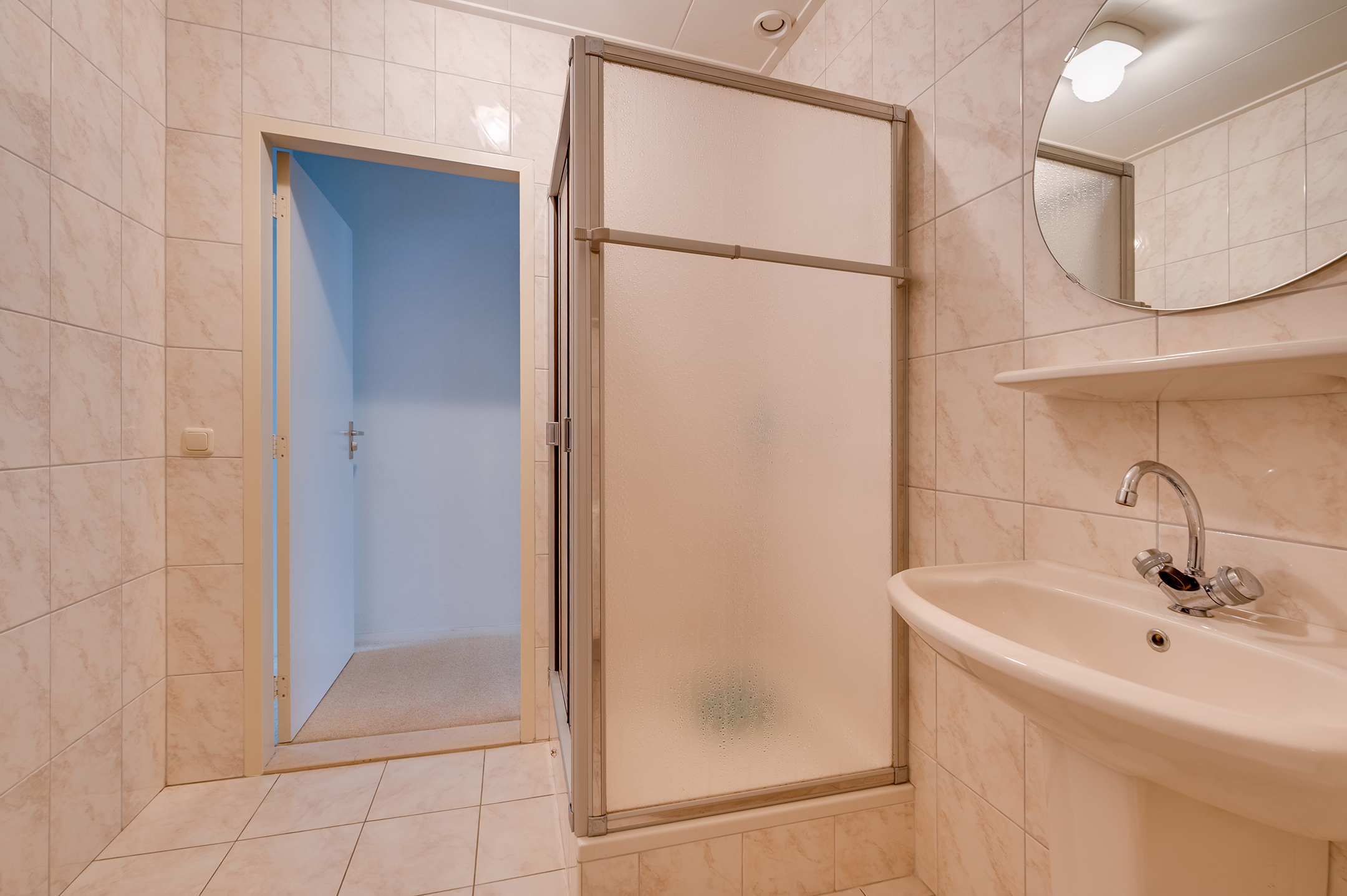 De slaapkamer beneden is voorzien van een eigen badkamer, compleet met douche, toilet, wastafel en designradiator — ideaal als je gelijkvloers wilt wonen of gasten comfortabel wilt ontvangen.