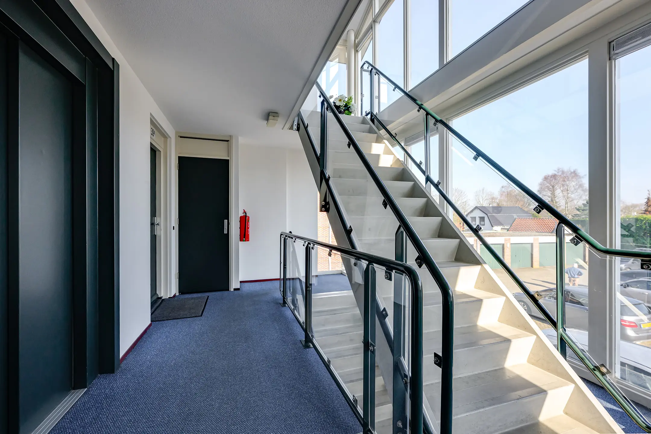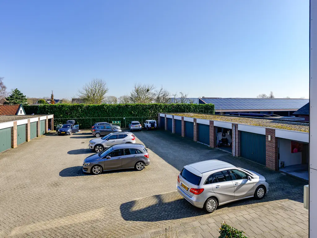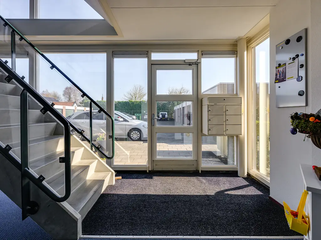 Via de doorgang tussen de appartementencomplexen bereik je de binnenplaats met algemene parkeerplaatsen en de eigen garage. De verzorgde gezamenlijke entree met brievenbussen biedt toegang tot het trappenhuis en de lift.
