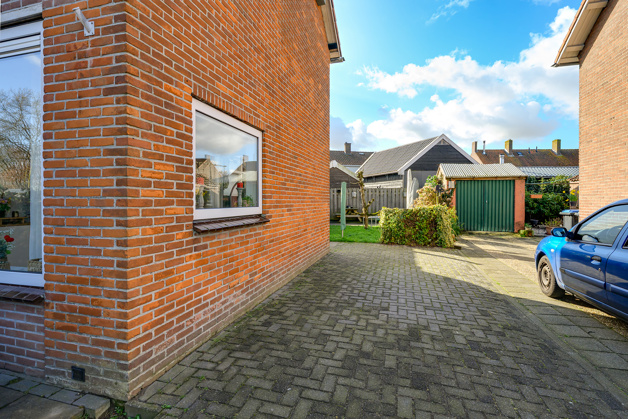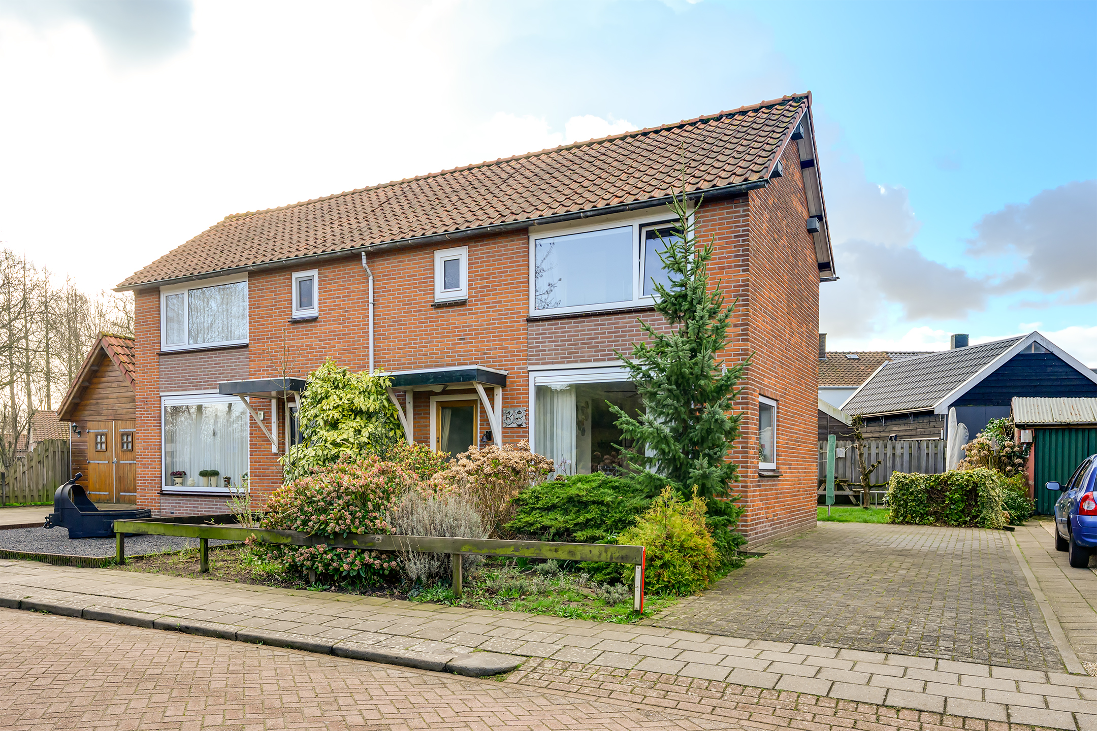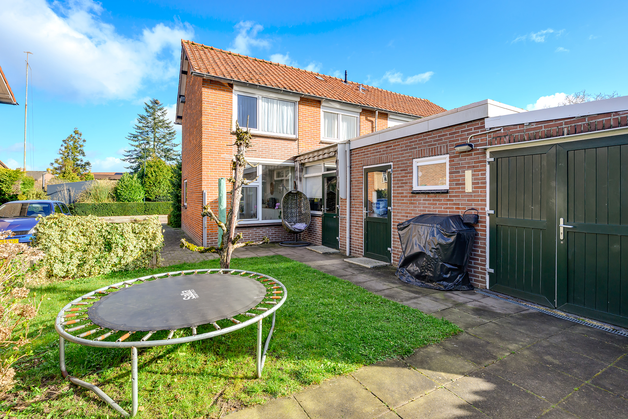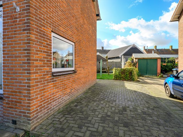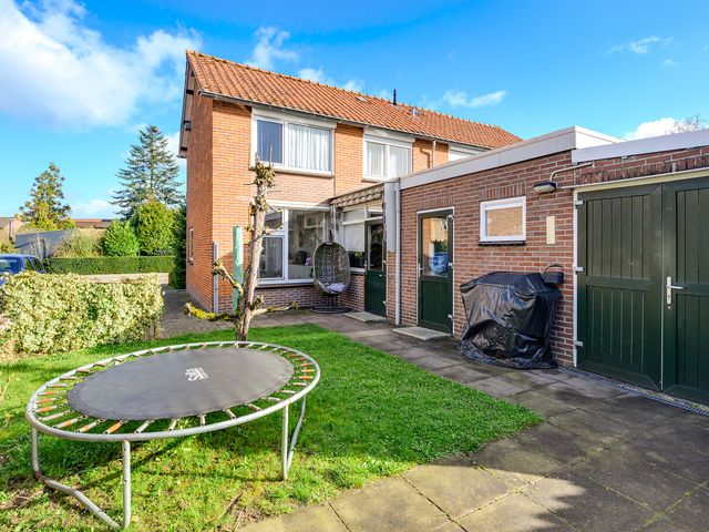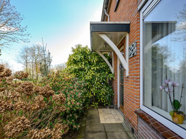 Bij aankomst valt meteen de verzorgde voortuin en ruime oprit voor twee auto’s op. Via de oprit loop je door naar de achtertuin op het zuiden – een heerlijke, zonnige plek waar je in alle rust kunt ontspannen. Dankzij de rolluiken en de charmante markies zit je hier ook op warme dagen comfortabel.