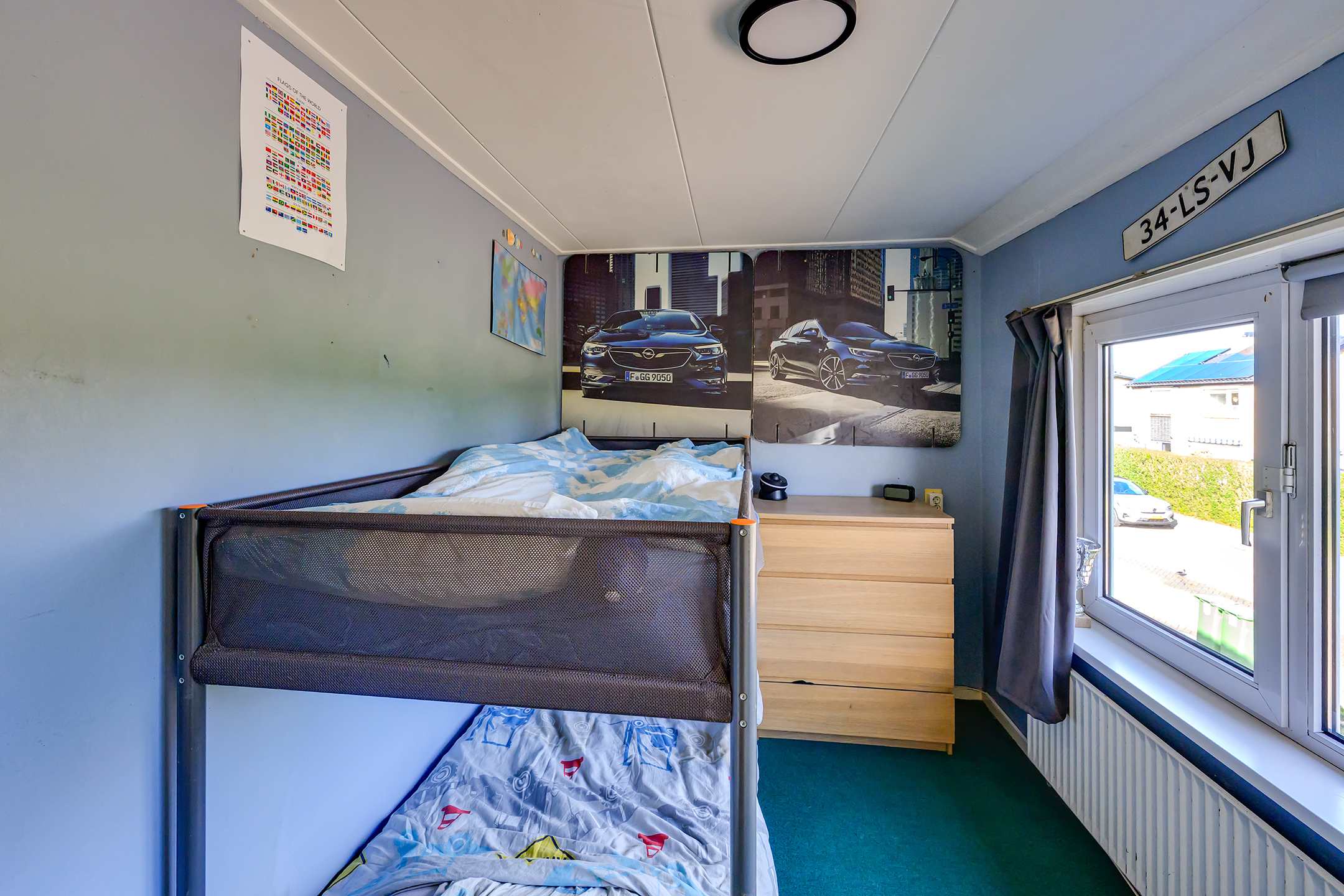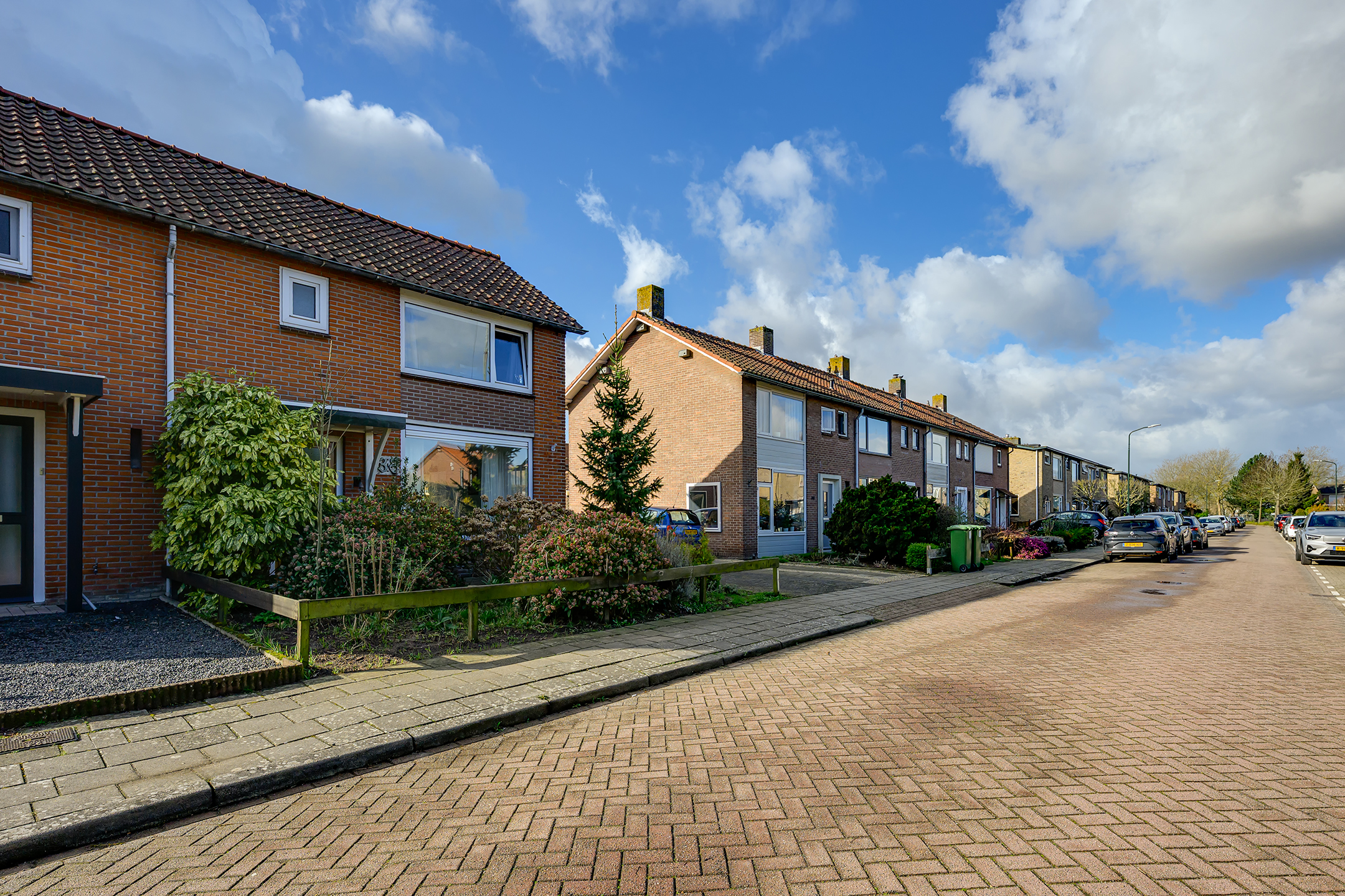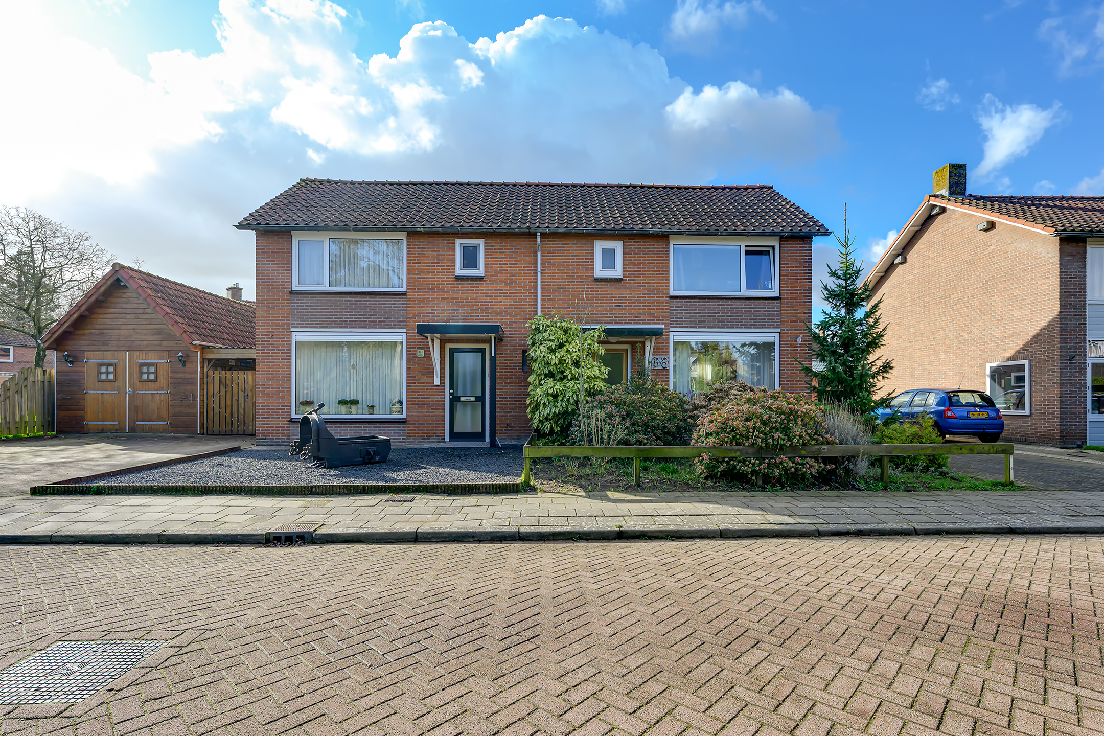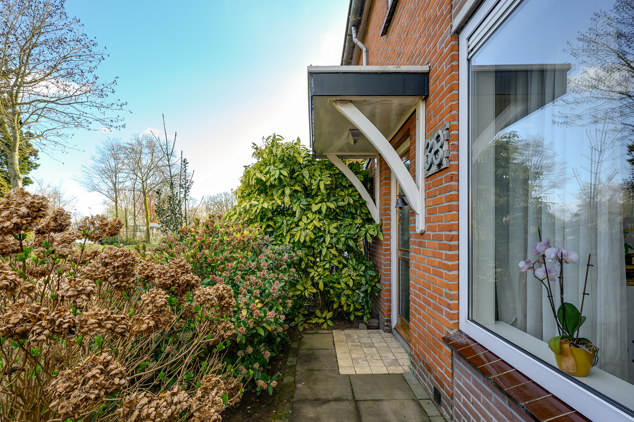 Bij aankomst valt meteen de verzorgde voortuin en ruime oprit voor twee auto’s op. Via de oprit loop je door naar de achtertuin op het zuiden – een heerlijke, zonnige plek waar je in alle rust kunt ontspannen. Dankzij de rolluiken en de charmante markies zit je hier ook op warme dagen comfortabel.