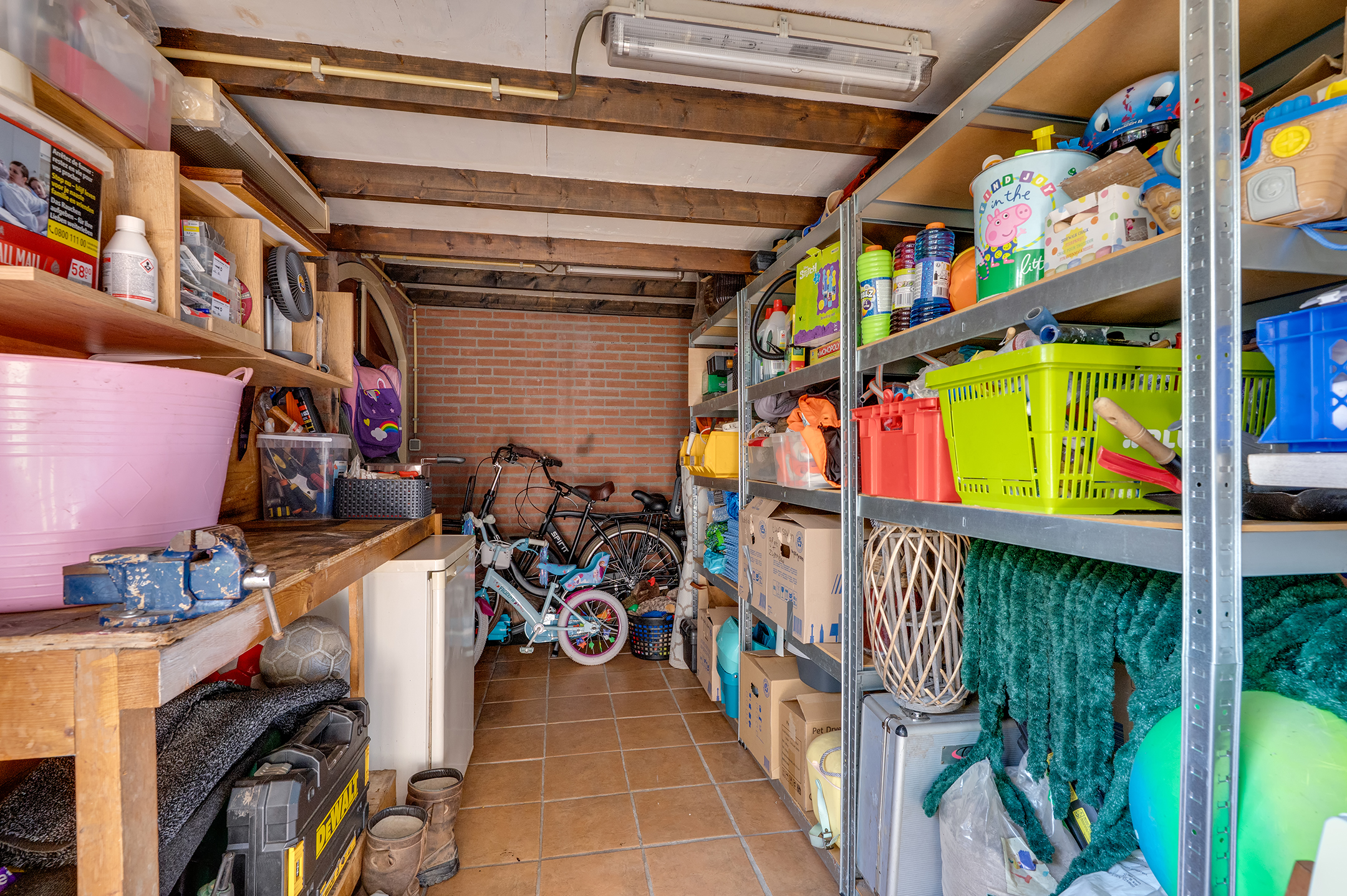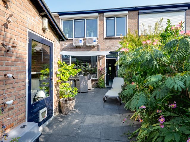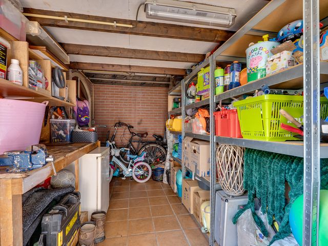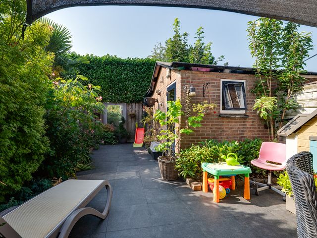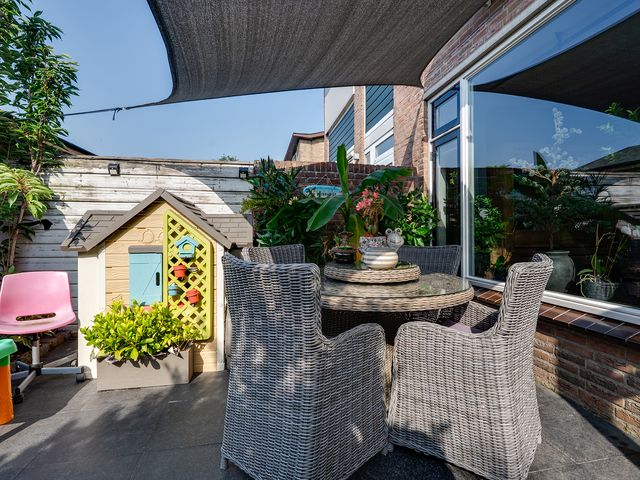 De achtertuin, betegeld met natuursteen, ligt op het zuiden. Dit betekent dat je hier de hele dag door van de zon kunt genieten. Of je nu wilt tuinieren, ontspannen met een boek of lekker buiten eten. Achterin de tuin staat een stenen berging met elektra en water; perfect voor het stallen van fietsen, wasruimte en extra berging.