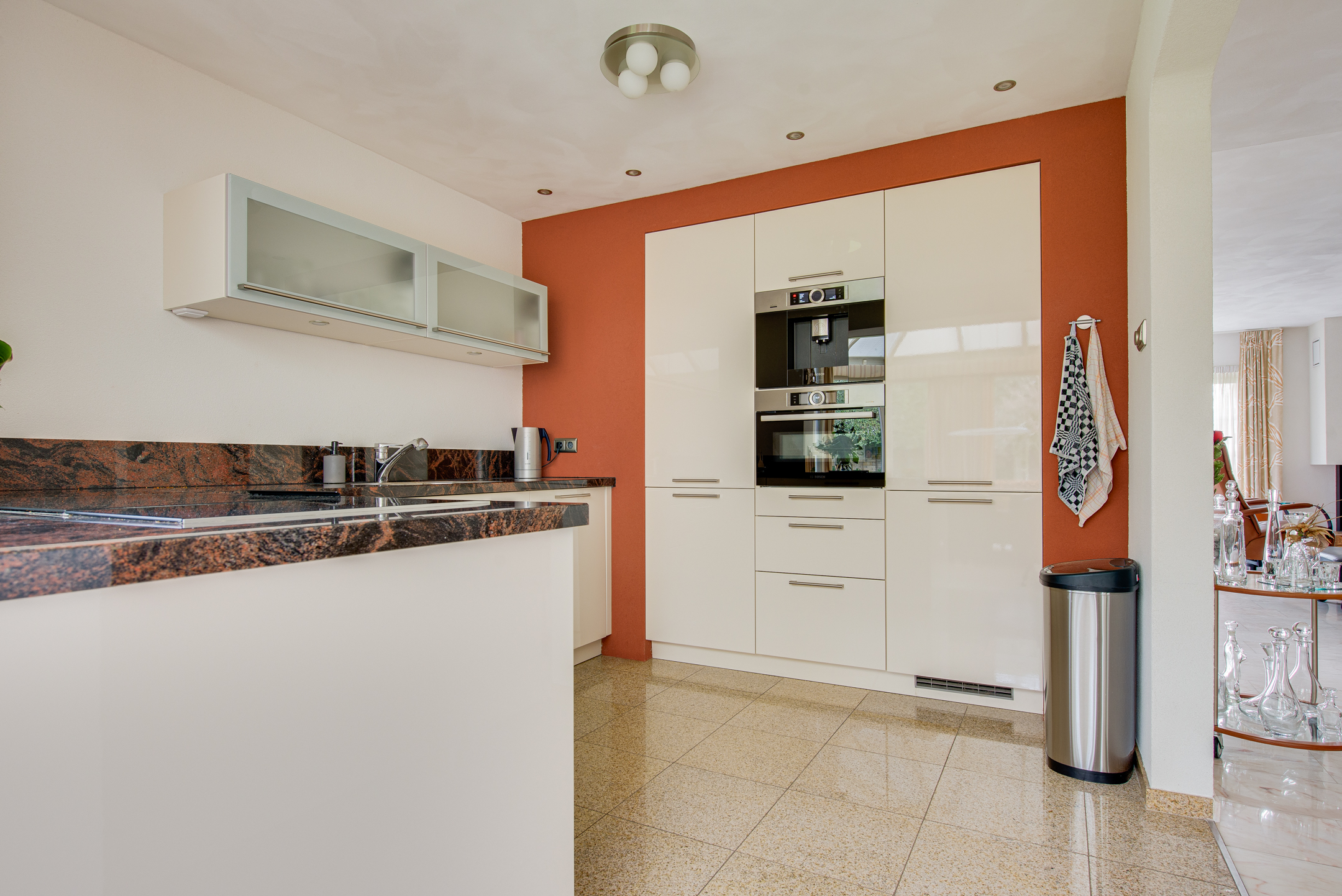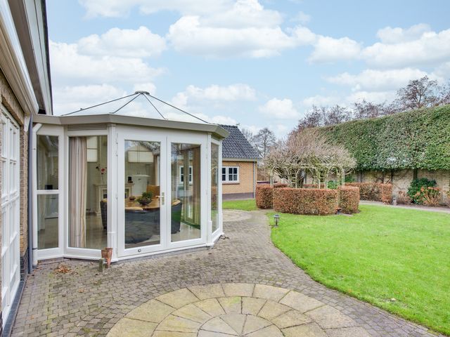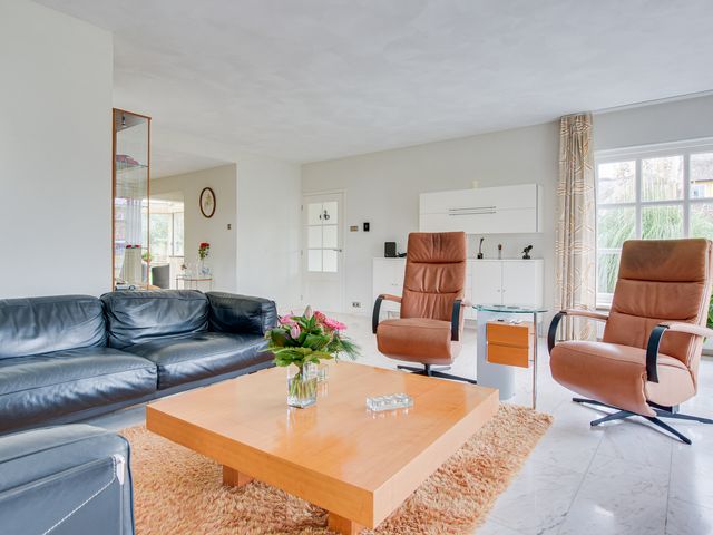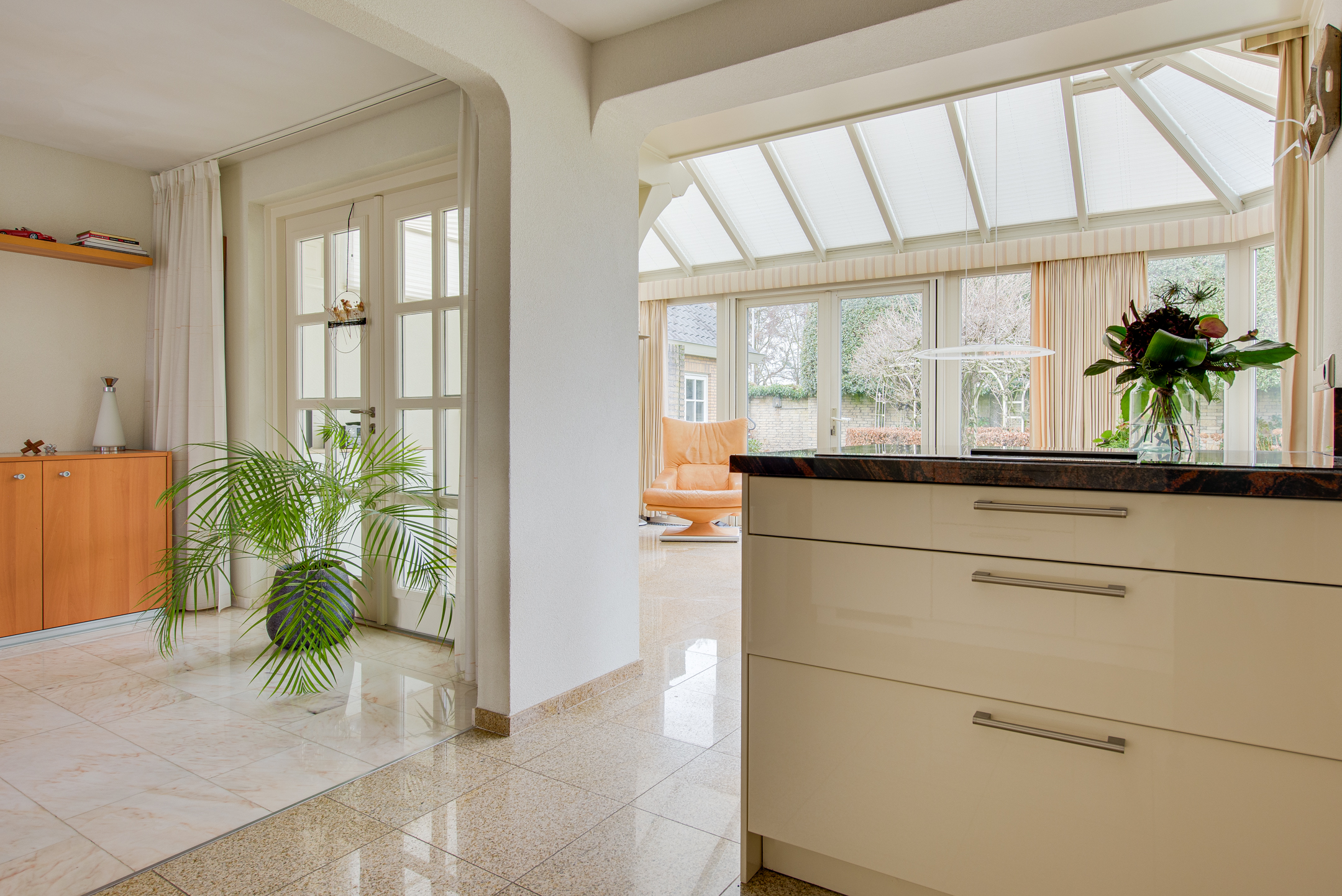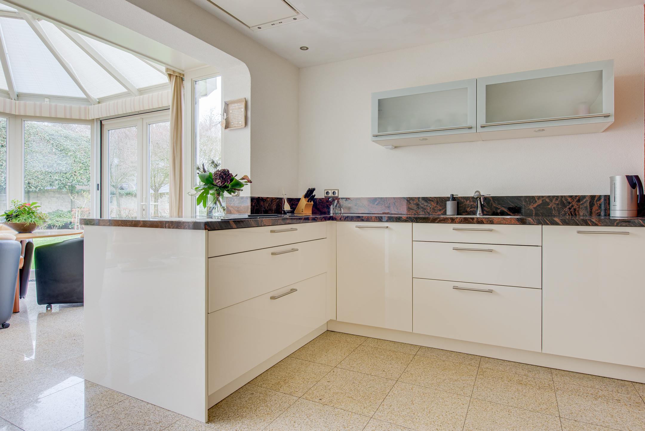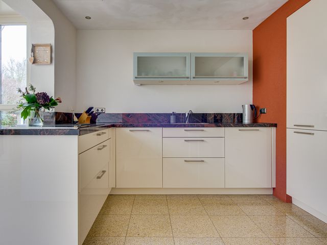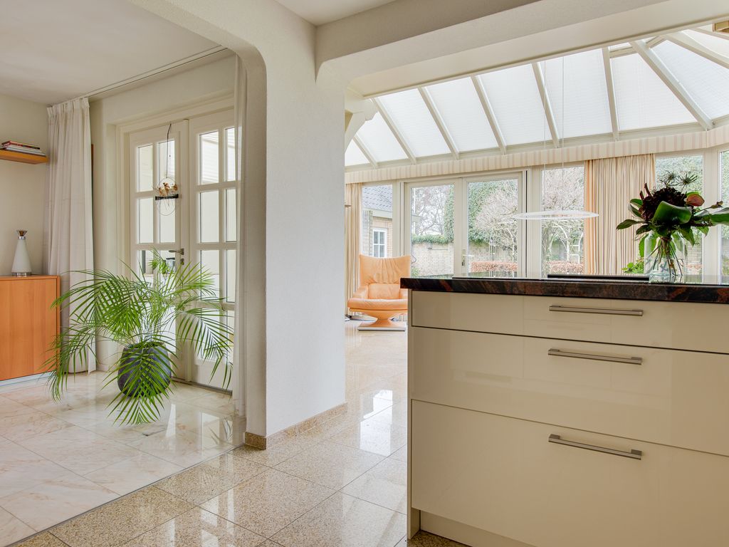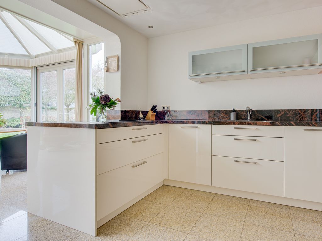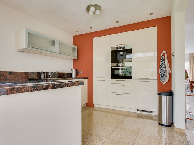 Aansluitend bevindt zich de keuken en de serre. De luxe keuken is van alle gemakken voorzien, waaronder een koel-/vriescombinatie, close-in boiler, vaatwasser, inductiekookplaat, inbouwfriteuze, afzuigkap, combi-oven en een ingebouwde koffiemachine. De lichte kleurstelling, het granieten werkblad en de royale kastruimte zorgen voor een frisse en warme uitstraling.